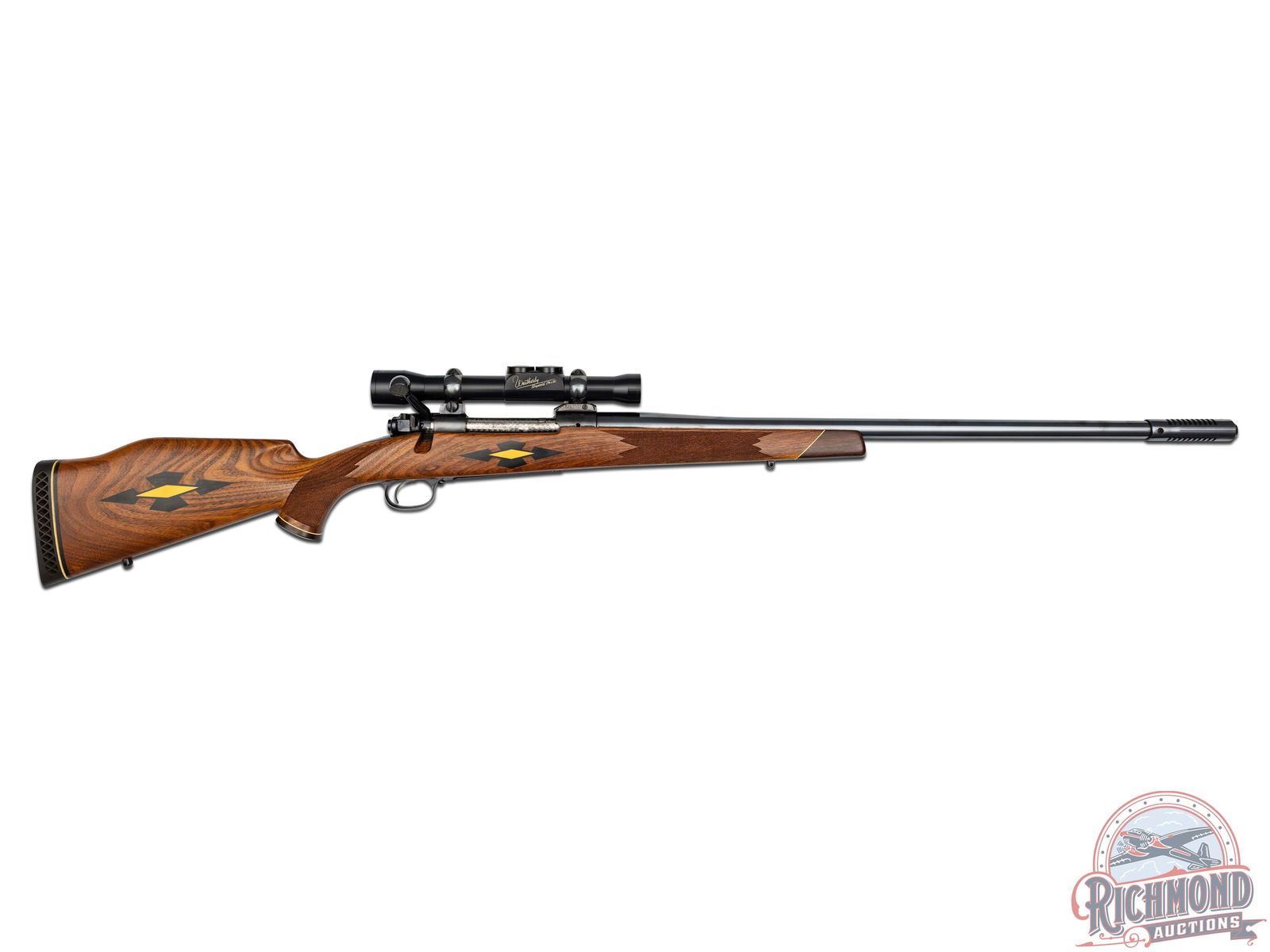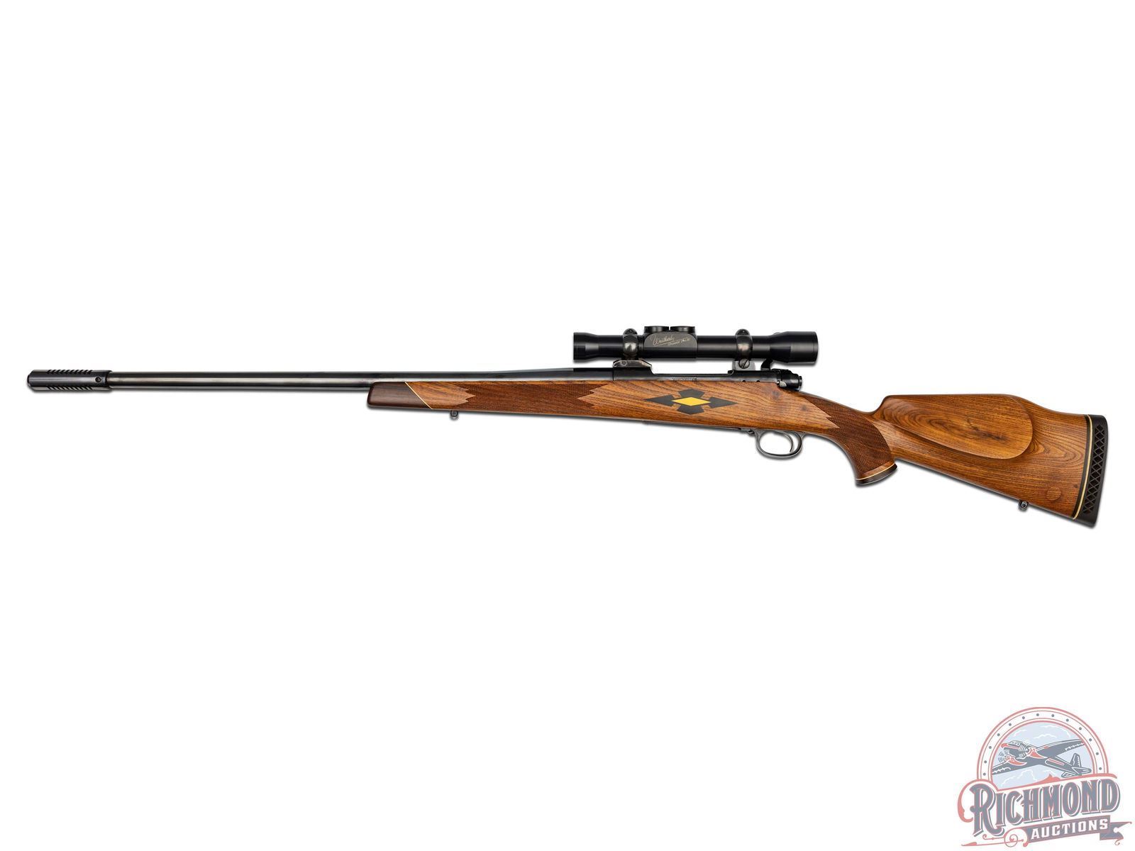 Receiver manufactured circa 1952 with an unmarked 23" barrel that was added at a later date. Slotted muzzle break is attached to the muzzle. Professionally redone, blued finish with jeweled bolt. Custom walnut stock with fine cut checkering on the wrist and forearm. Right hand shooter check piece with inlays on each side of the action, bottom of the wrist and right side of the butt. Capped pistol grip and forearm with metal sling swivels. Black rubber butt pad. Weatherby Imperial 2-3/4x90 scope sitting on Buehler mounts. This is a possible Roy Weatherby custom build. LOP: 13-1/2". CALIBER: 416 Rigby. S/N: 217576. FFL STATUS: Curio & Relic.