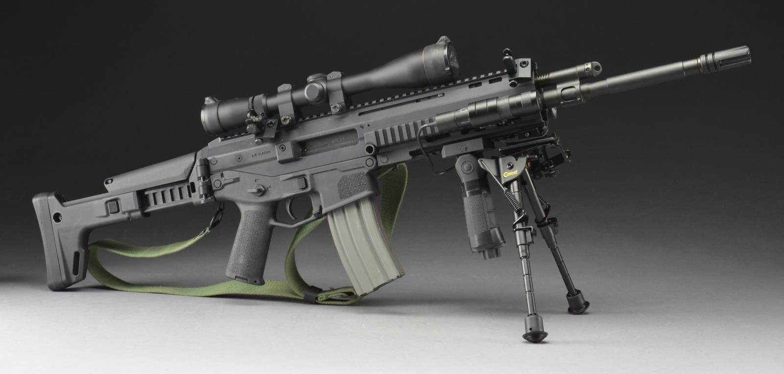 Cal. 5.56MM. S# BL05389. Bbl. 16.5". Bushmaster ACR (Advanced Combat Rifle) was an early entrant in what was to become “the next generation” of America’s primary service rifle to replace the long utilized M16 & its variants. There are actually only very few similarities to the M16, such as the rotating bolt system. The 16.5” bbl. has a 1:9 rate of twist & the exterior profile is very similar to the M4. Bbl. is terminated w/ a threaded muzzle & a proprietary brake vaguely resembling the Vortex type flash hider. Left side reciprocating charging handle. Adj. gas piston system is another step away from the long used direct gas impingement system. The upper receiver is a 1 piece monolithic design that incorporates over 16” of picatinny top rail mounting surface w/ additional rail surfaces at 3/6/9:00 for accessories. Lower receiver (which includes mag-well, trigger guard & pistol grip) is a black composite material roughly textured on both sides of pistol grip & mag-well. Ambidextrous mag release, bolt release, & safety/ selector. Pistol grip has a compartment to store 2-CR123 lithium batteries. Shoulder stock is a telescoping, collapsible & right side folding design which does not interfere w/ firing regardless of position. QD sockets for sling attachment located on both sides at center point of rifle & on rear stock. Matte black finish on all exposed surfaces. Currently sporting a Caldwell folding/telescoping bipod & UTG FVG below bbl. Unidentified weapon light mounted at 9:00 & green laser at 3:00. Leupold 4-12x40MM Rifleman scope w/ duplex crosshairs & flip up covers. Currently sporting 45 degree offset folding iron sights. Green canvas sling. MAGS: 1 aluminum 30 rd. CONDITION: finish on all exposed metal surfaces complete & consistent w/ no noticeable blemishing. Ejection port buffer illustrates fairly light usage. Laser & flashlight appear functional. Scope glass & reticle appear clear. Shiny bore w/ aggressive rifling. Safety/ selector appears to float w/out positively locking in to any position & otherwise fire control mechanism appears to function correctly when cycled by hand. (21-1507/JZ). MODERN. $800-1,200.