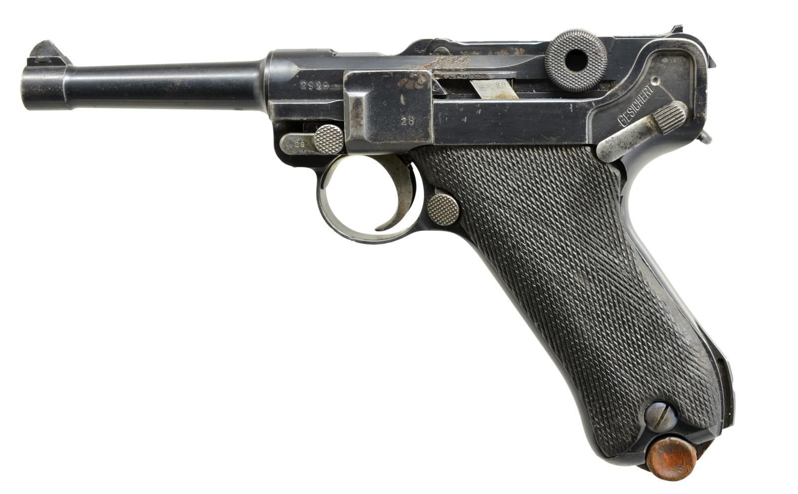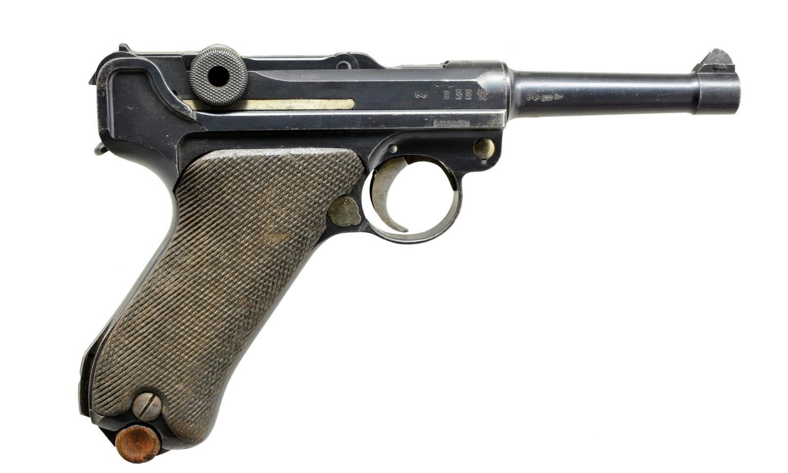 Cal. 9mm Luger. S# 2928g. Bbl. 4". Mfg. 1916; 140,000 units. Matching numbers on all metal parts; Left grip #52, right #06. Right side of receiver before German proofs has British Crown proof plus additional British proofs on right side of bbl. forward of receiver. Additional British proofs on left side of DWM toggle link. MAGS: fair to good, functional, tin plated 8 rd. w/ unmarked wood base having repaired split behind dimples & extra cross pin at base of front. CONDITION: very good overall appearance w/ noticeable spot of deep pitting (likely combat related) on receiver above sear plus similar pitting on left lower edge of trigger guard. Spots of lesser pitting on bbl. & top rear of frame (both sides). Light impact marks at bottom right rear of receiver. Light oxidation spots on sideplate. Gray toned safety, trigger & takedown lever w/ traces of straw colors remaining. Correct in the white internal areas w/ very good appearance. Very dark grips w/ hand wear & light marks plus chip by safety of left. Near excellent bore & breech block face indicating very minimal use. Light marks around takedown lever & on sideplate. (21-355/NW). CURIO. $800-1,200.