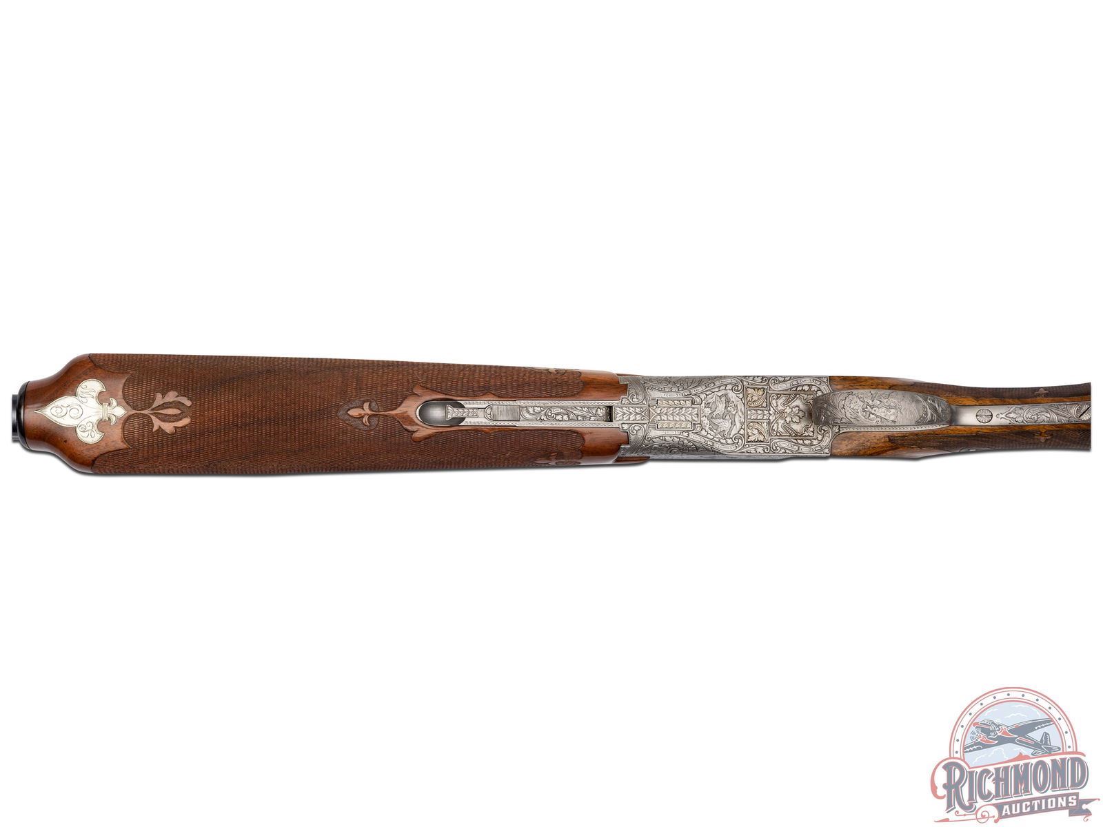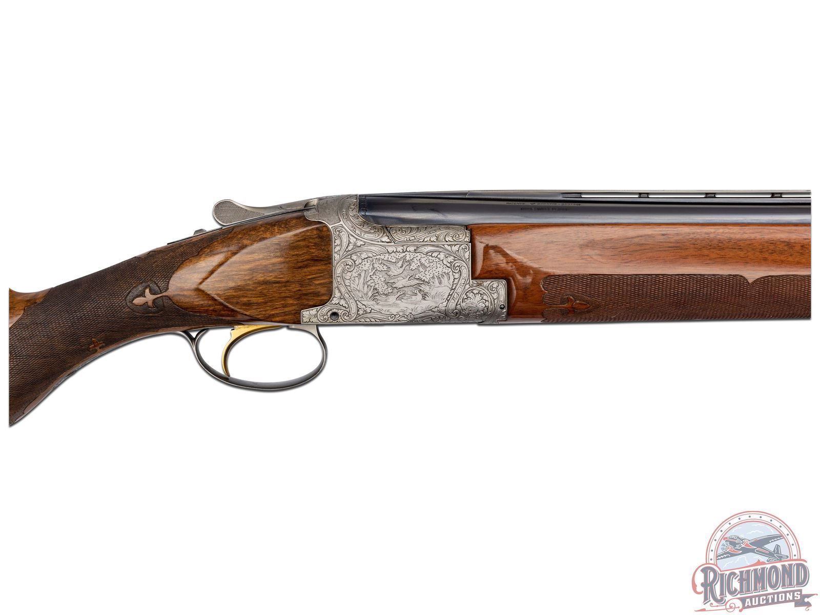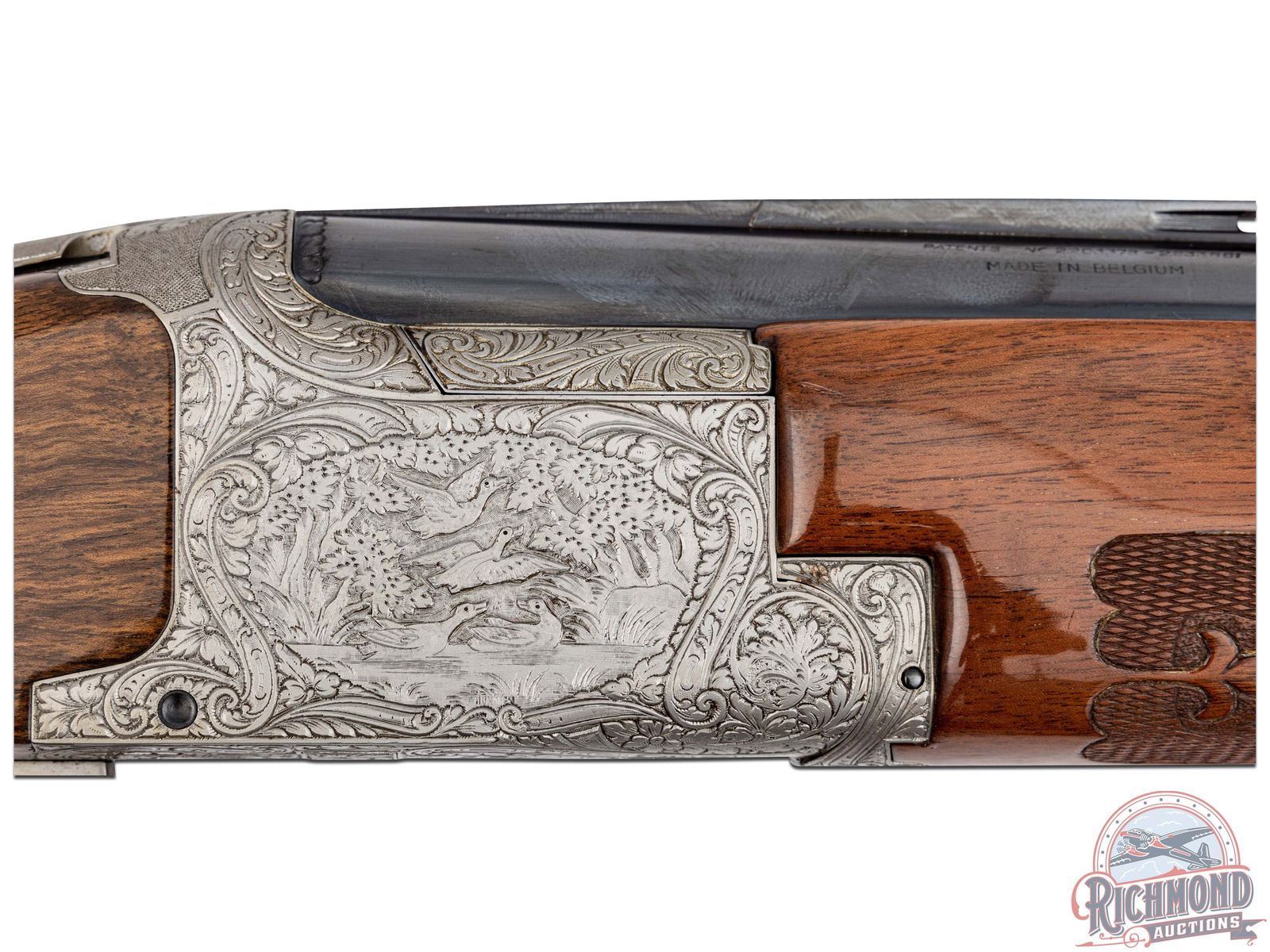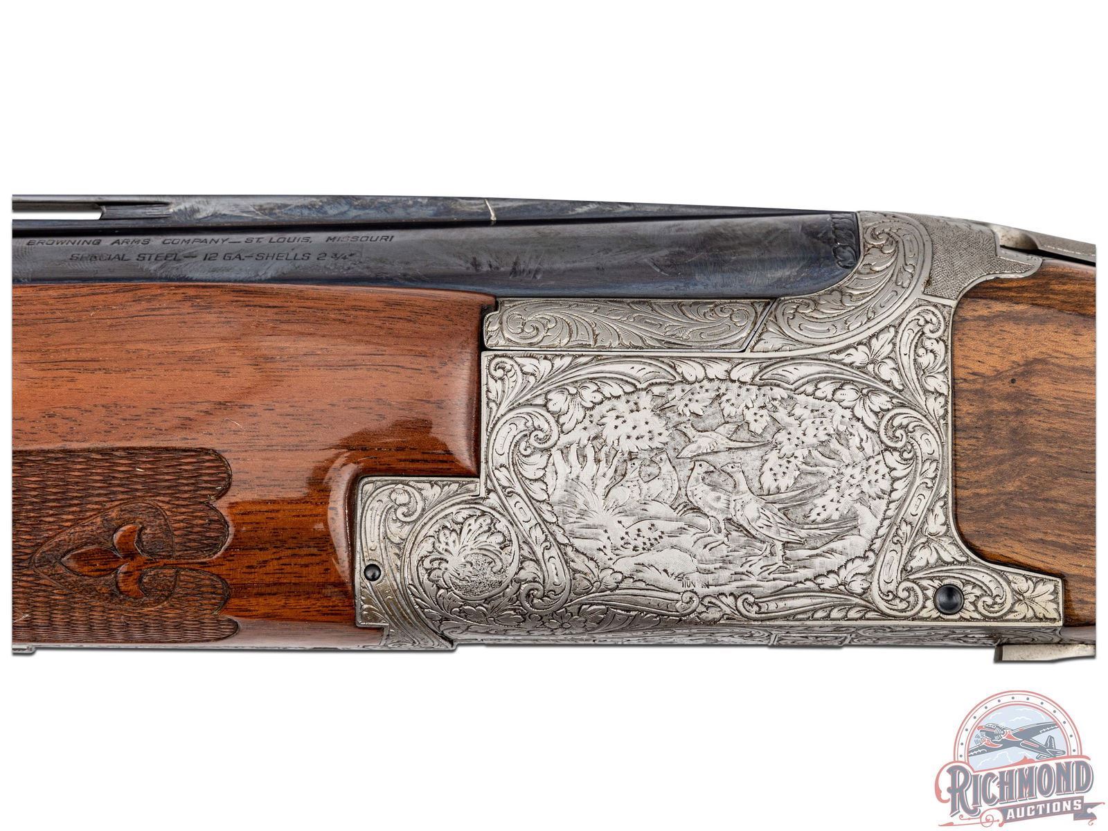 Manufactured in 1957 for Browning by FN in Belgium. Blued 30" over and under special steel barrels with ported center rib, raised ventilated rib, twin beads, marked as full and full chokes with 2-3/4" chamber and ejectors. Includes an extra blued 32" Browning marked single barrel with ventilated rib, ejector, and twin beads, and matching forearm. Coined finish boxlock action with heavy chiseled engraving featuring a full coverage floral and bird scene on both sides, signed by master engraver Felix Funken. Bottom of receiver has full coverage floral and bird scene. gold-plated single trigger with long tang safety barrel selector and floral and rabbit scene engraving. Fleur de Lis style custom checkering on walnut round knob pistol grip stock with Pachmayr "white line" vented recoil pad. Matching walnut competition style flared custom checkered forearm. Fleur de Lis silver inlay engraved of original owners initials "L.G.W." with both forearms matching. LOP: 13-7/8". DAC: 1-1/4". DAH: 1-3/8". CALIBER: 12 GA. S/N: 55973. FFL STATUS: Curio & Relic.