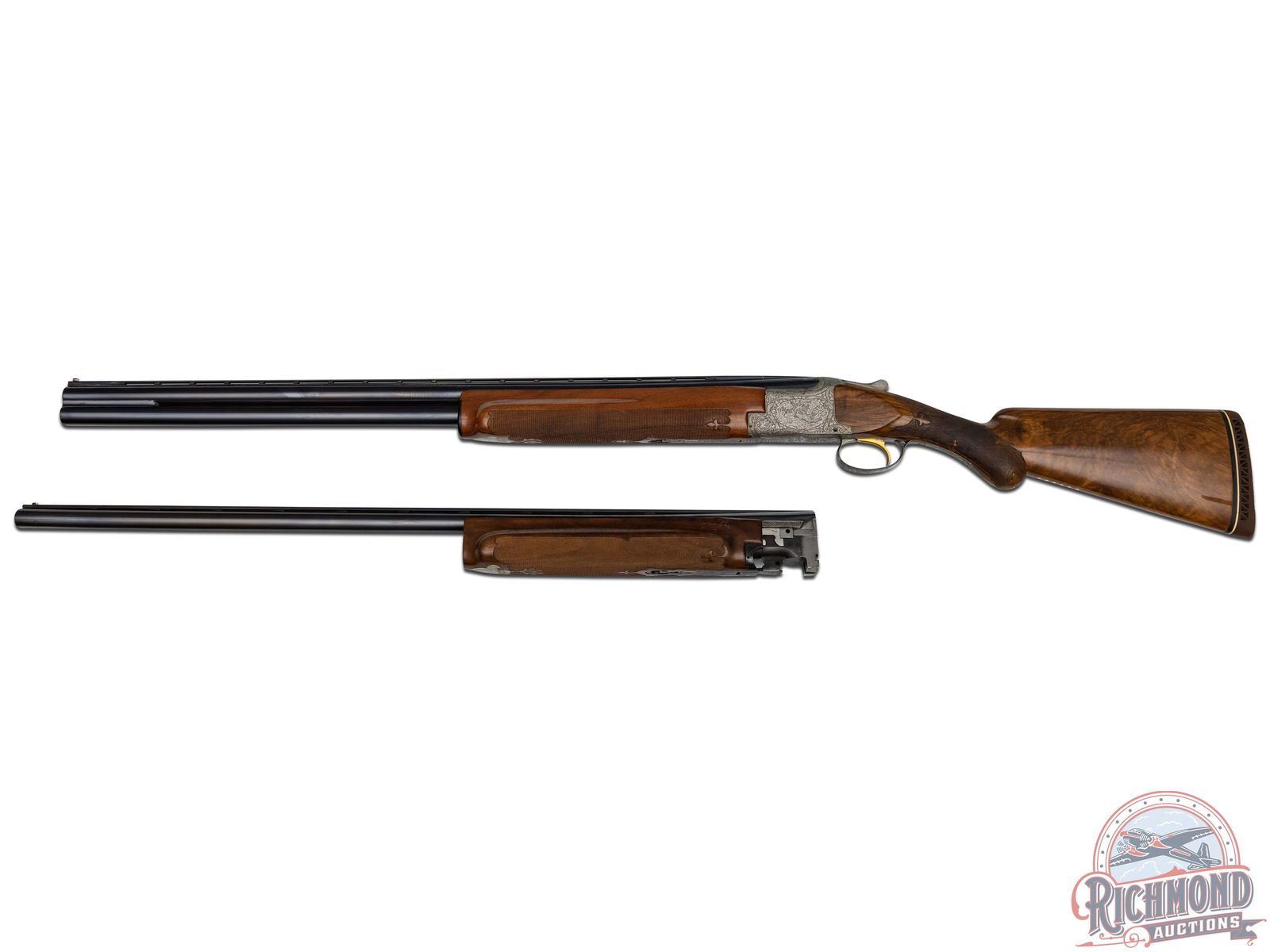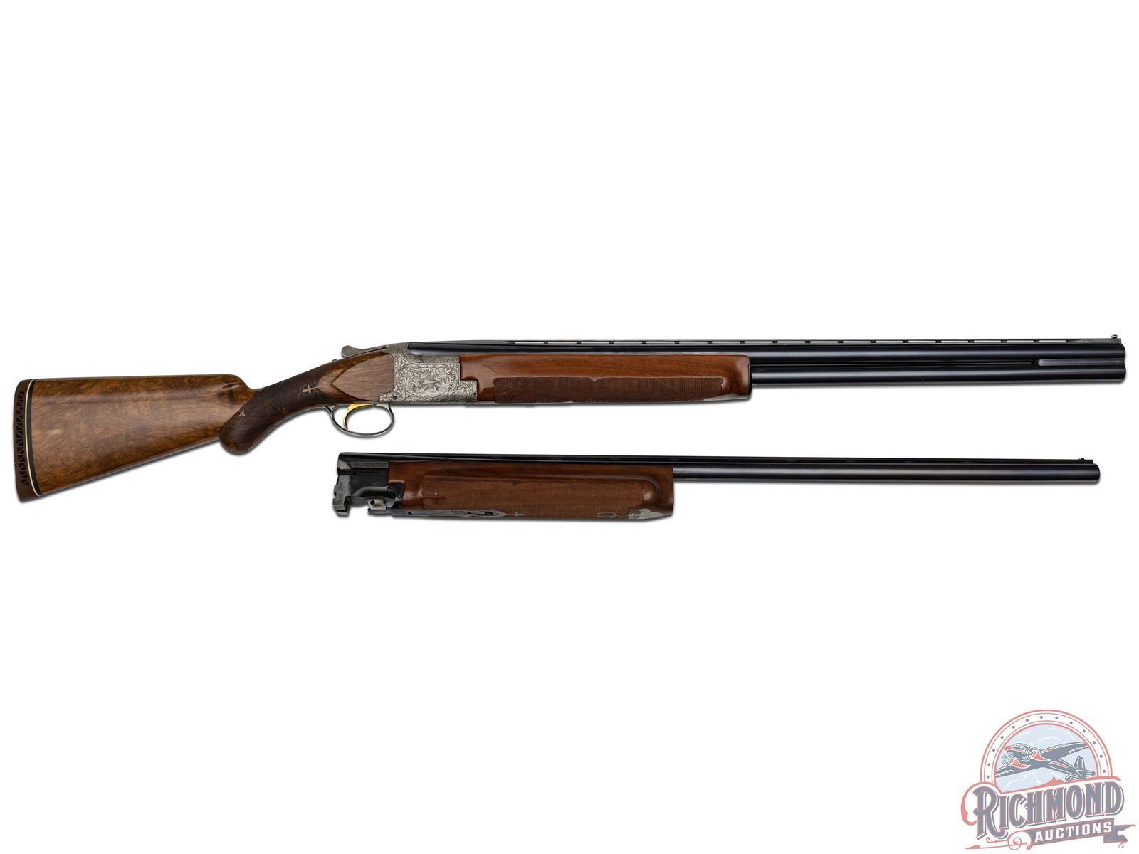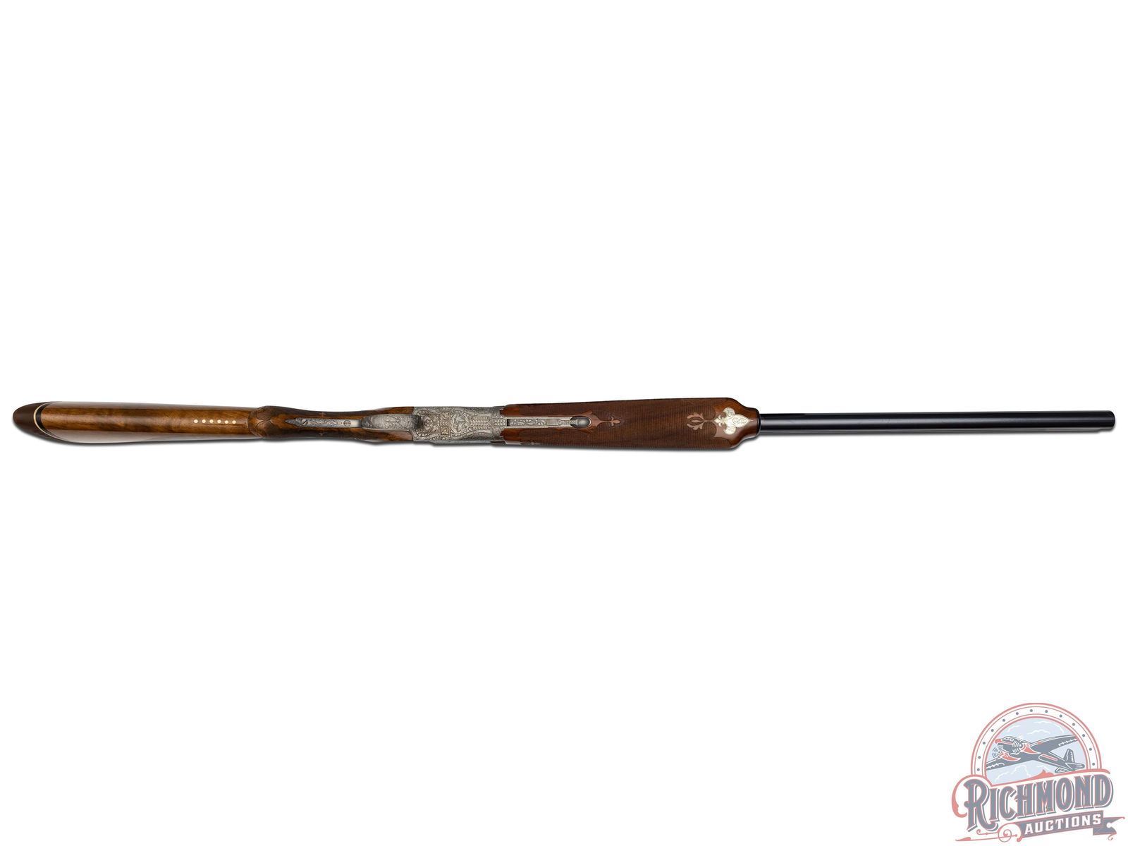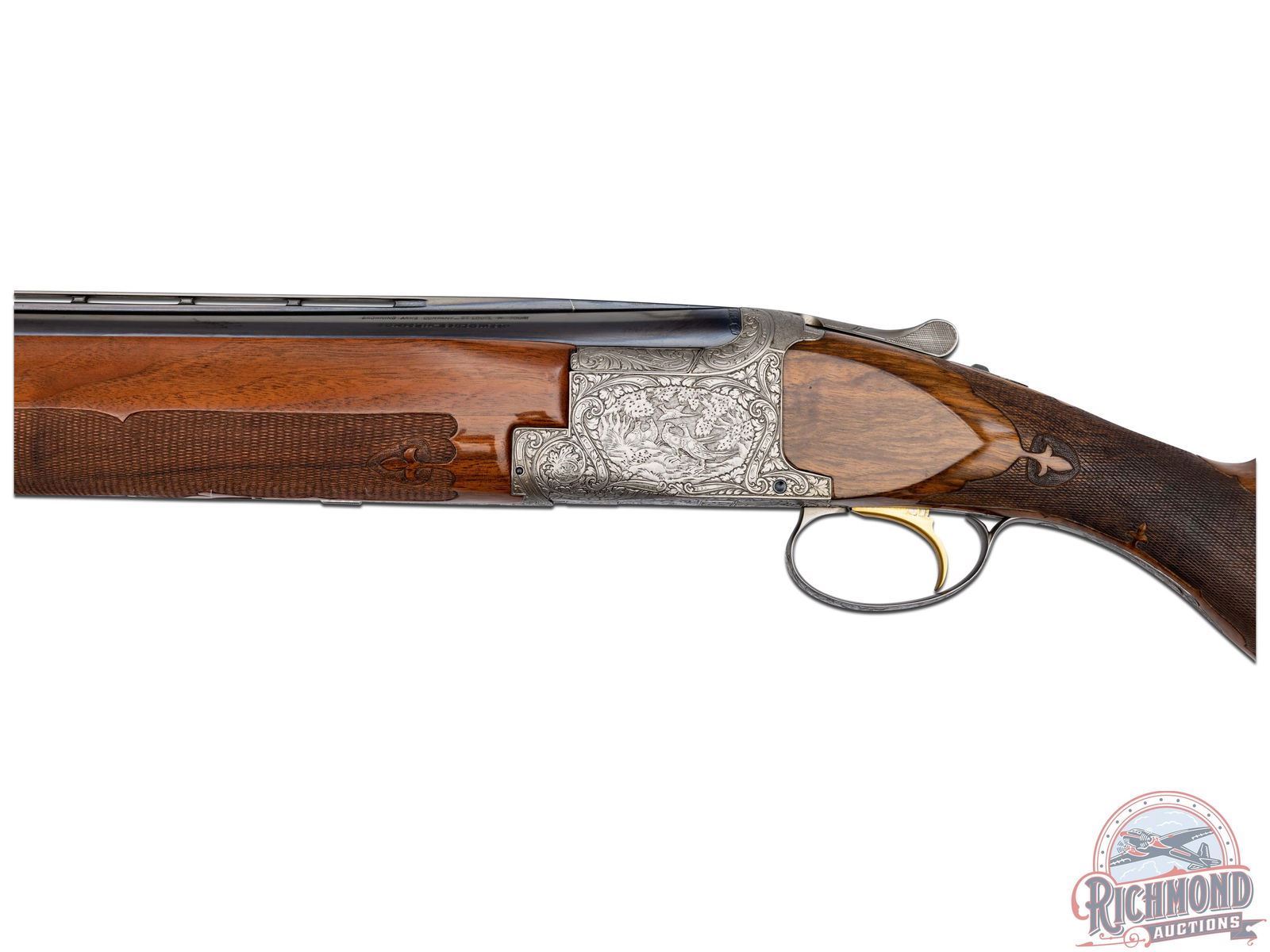 Manufactured in 1957 for Browning by FN in Belgium. Blued 30" over and under special steel barrels with ported center rib, raised ventilated rib, twin beads, marked as full and full chokes with 2-3/4" chamber and ejectors. Includes an extra blued 32" Browning marked single barrel with ventilated rib, ejector, and twin beads, and matching forearm. Coined finish boxlock action with heavy chiseled engraving featuring a full coverage floral and bird scene on both sides, signed by master engraver Felix Funken. Bottom of receiver has full coverage floral and bird scene. gold-plated single trigger with long tang safety barrel selector and floral and rabbit scene engraving. Fleur de Lis style custom checkering on walnut round knob pistol grip stock with Pachmayr "white line" vented recoil pad. Matching walnut competition style flared custom checkered forearm. Fleur de Lis silver inlay engraved of original owners initials "L.G.W." with both forearms matching. LOP: 13-7/8". DAC: 1-1/4". DAH: 1-3/8". CALIBER: 12 GA. S/N: 55973. FFL STATUS: Curio & Relic.