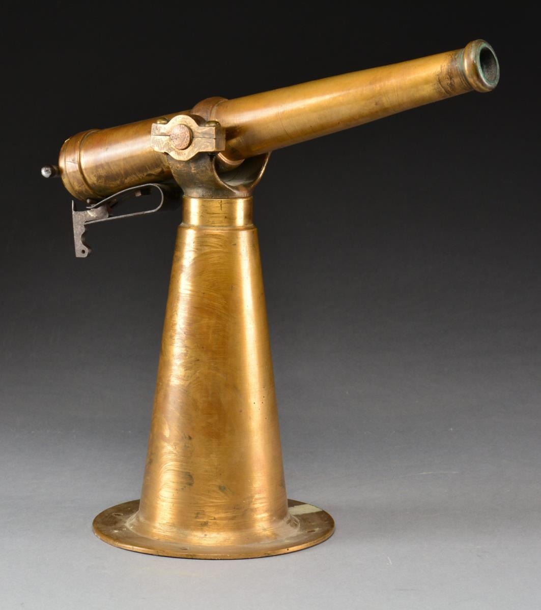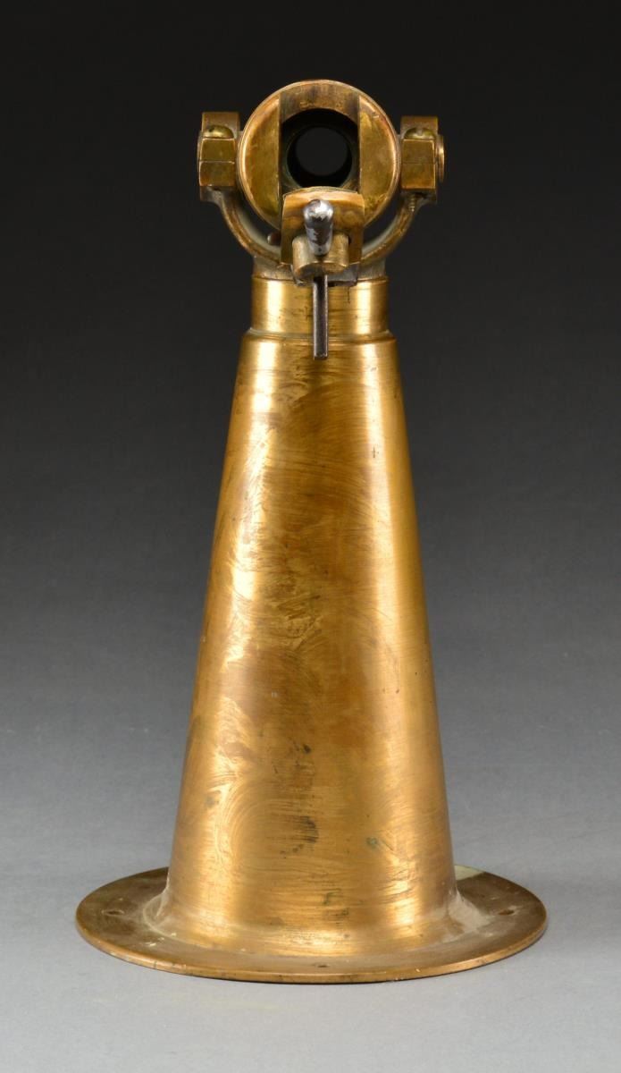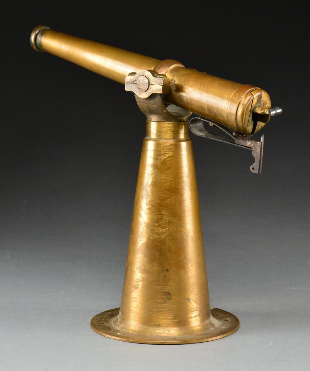 A fine example of a solid brass signal cannon utilizing a mechanism similar to the Winchester signal cannon mechanism seen on their carriage mounted 10 Ga. tubes. Bbl. length is 14 1/4" & the bbl. takes a 10 Ga. shell. The bbl. is mounted on a stationary cone shaped deck mount measuring approx. 10" high & 7" in diameter. A unique form that appears fully operable & is visually quite attractive. CONDITION: brass has a pleasing mellow patina. All swivels & mechanisms work well. (02-15007/BF). $800-1,200.