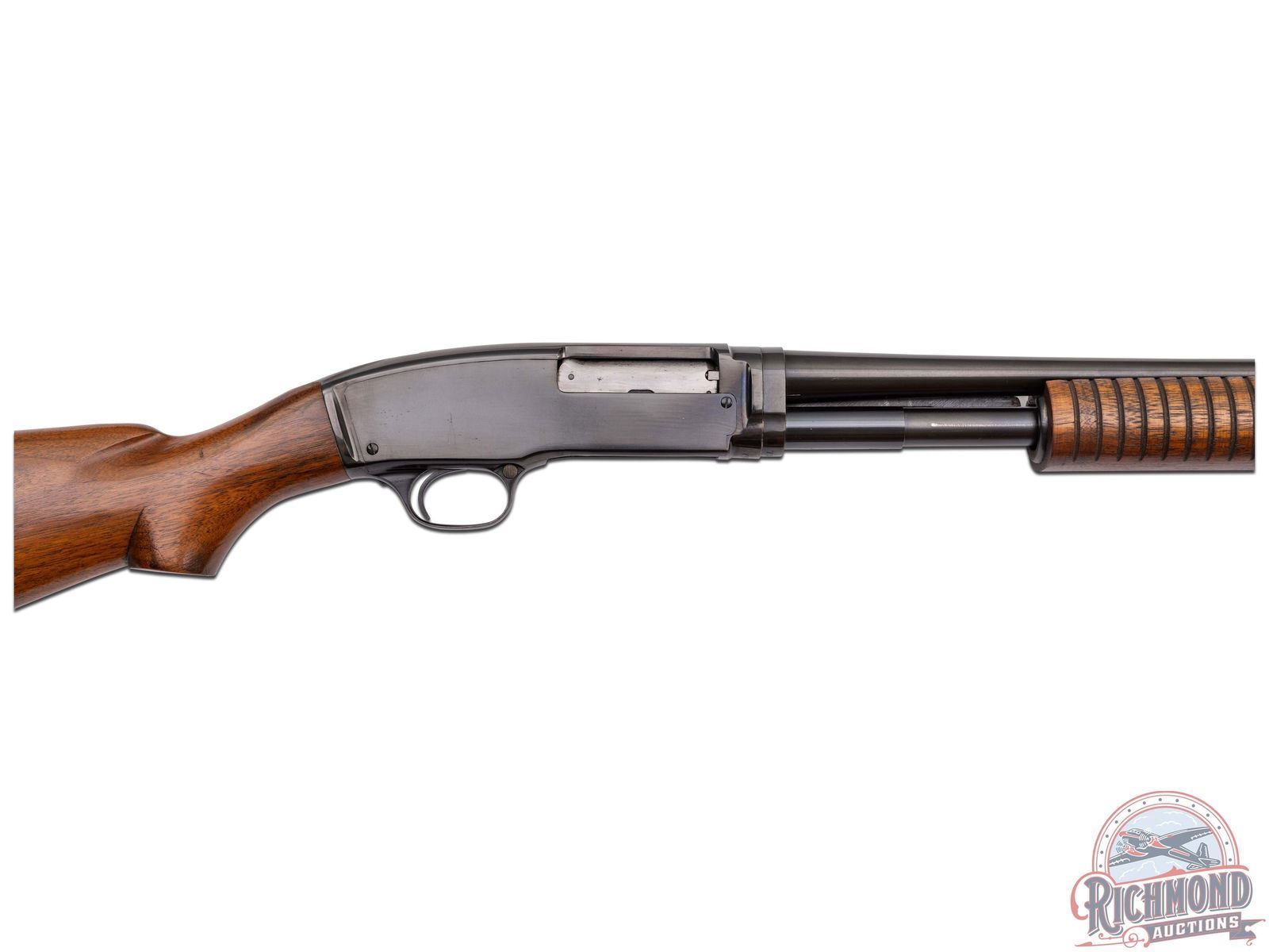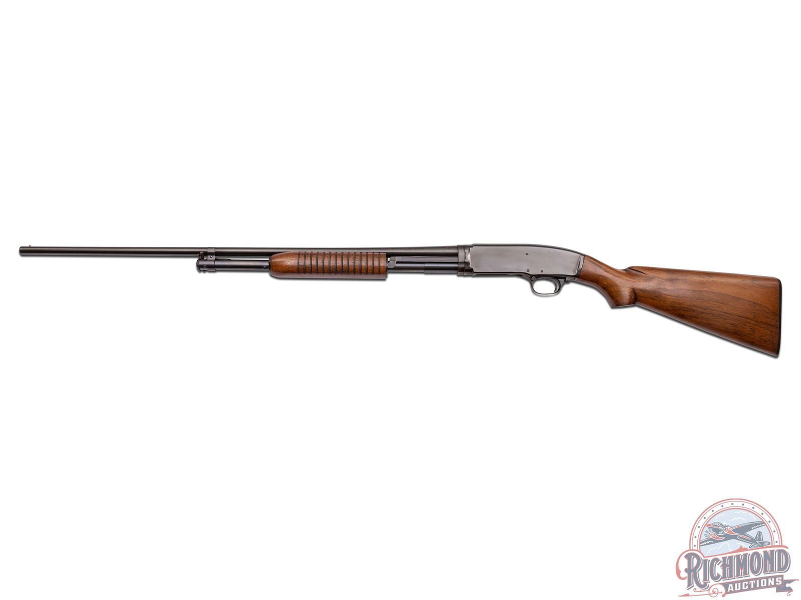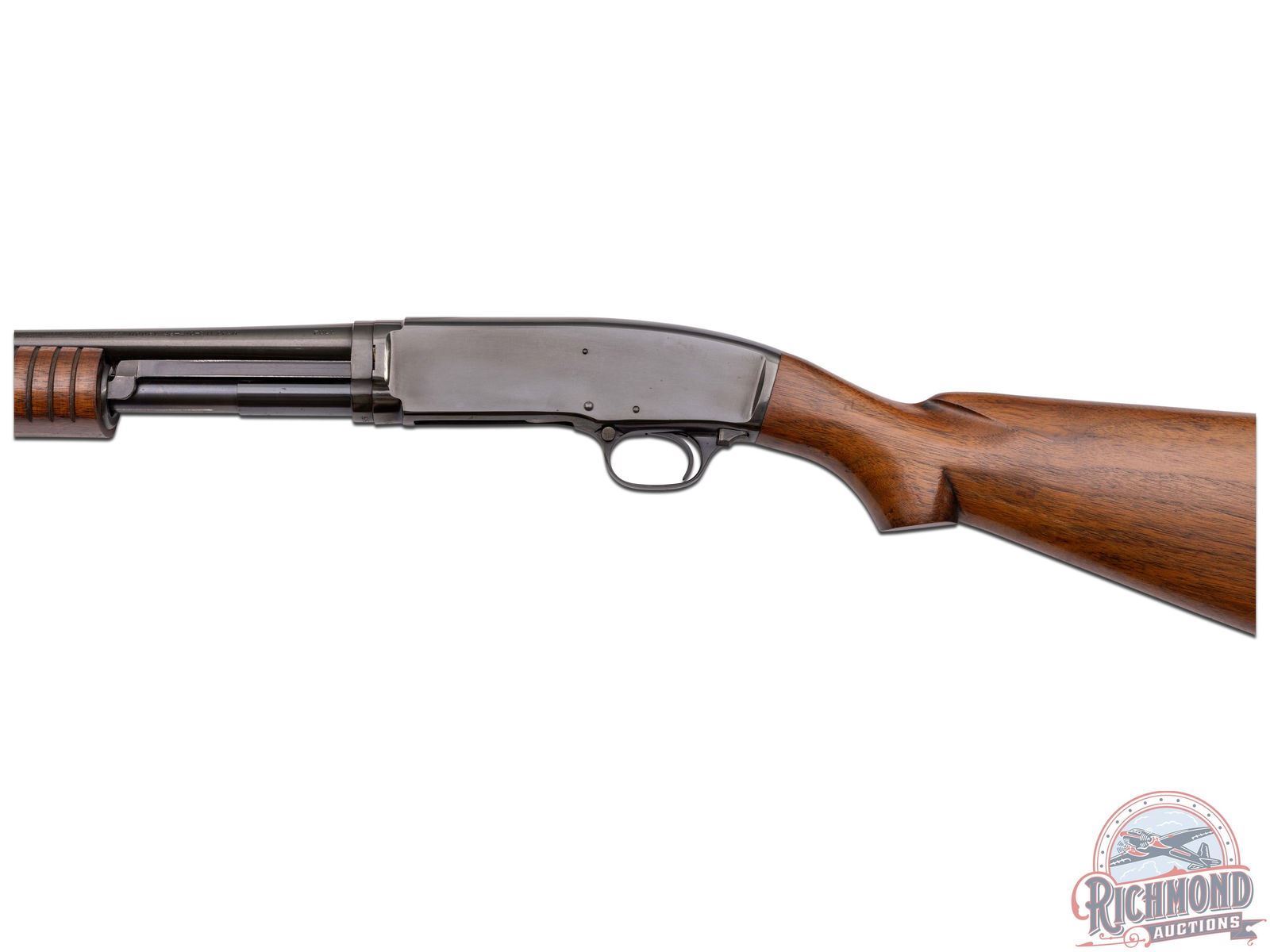 This beautiful "greatest little shotgun" was manufactured in 1948. Features a 28" blued barrel with nickel bead front sight, standard Winchester roll marks and proof marks. Chambered for 3" shells with a Full choke. Blued receiver with matching serial numbers to the barrel and crossbolt safety. Nice walnut stock with pistol grip. Matching forearm slide has 14 line ribs. Fitted with a Winchester factory round logo checkered butt plate. LOP: 13-3/4". DAC: 1-3/8". DAH: 2-1/4". CALIBER: 410. S/N: 73055. FFL STATUS: Curio & Relic.