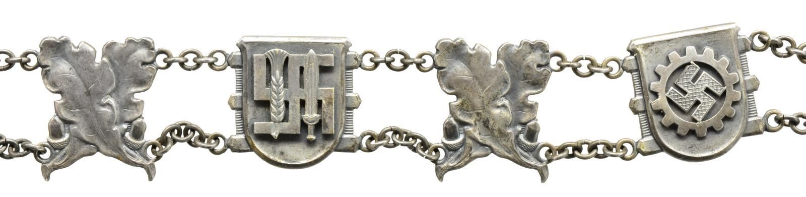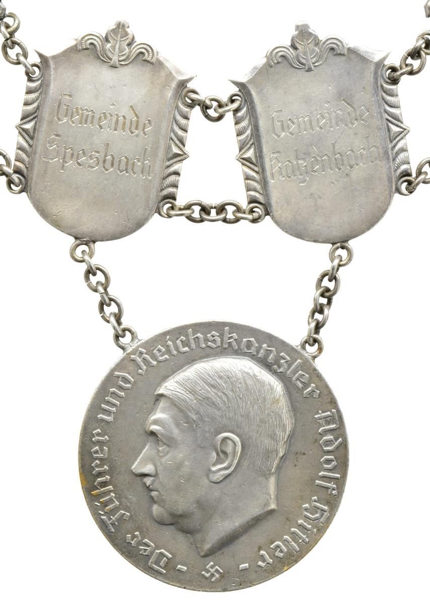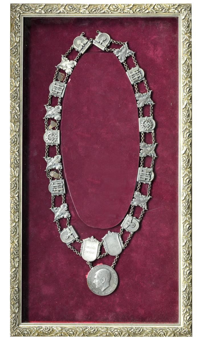OFFICE WITH CENTRAL HITLER MEDALLION. This is one of the true rarities in the field of WWII German collecting. It is a mayor’s neck Chain of Office belonging to the towns of Spesbach & Katzenbach. The chain was brought back to this country at the end of WWII by Lieutenant Colonel Howard C. Dellert. The chain consists of 2 engraved links that read, “Gemeinde Spesbach” & “Gemeinde Katzenbach” along w/ 4 links that have WWII German political leader eagles on the front. The chain further includes 8 links that depict crossed oak leaves & acorns, 2 links that have a DAF cog wheel insignia & 4 links that depict the insignia of the Reichsnahrstand. Each link is connected by silver chain. The central medallion hanging from the chain depicts a profile view of the head of Adolf Hitler on the front along w/ the words, “Der Fuhrer und Reichskanzler Adolf Hitler” w/ a Party symbol. On the reverse is a wreath of oak leaves & acorns. A stunning rarity that would be the centerpiece of any WWII German insignia or award collection. UNATTACHED ACCESSORIES: the chain comes in a custom made frame accompanied by several copies of newspaper articles relating to the career of Lt. Col. Dellert. CONDITION: chain shows light wear overall but does have a few missing or open links in the connecting chains. (02-15009/BF). $3,000-5,000.