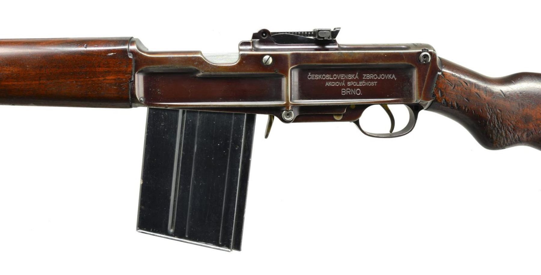 MILITARY RIFLE. Cal. 8x57 Mauser. S# 10252. Bbl. 23 5/16". Introduced in 1929, this rifle is a gas operated tilting block design by Emmanuel Holek, who was the brother of Vaclav Holek, designer of the Z.B. 26 LMG. The rifle has an unusual design in that the bolt locks into the left side of the receiver causing the breech to be offset to the left and requiring that the sights be offset to compensate. Features include the hinged receiver for takedown and cleaning as well as an adjustable gas cylinder to regulate the operating pressure. Forend terminates in a cast aluminum block with cooling fins. Rifles were made primarily in 8x57 Mauser and given trial in many countries including the United States. According to Bruce Canfield in the book "The M1 Garand Rifle", the ZH 29 as trialed by the U.S. ordinance board was not well liked for its looks, but it did perform very well and importantly did not require lubricated ammunition. The rifle also weighed less than the minimum weight thought necessary & established that a full power rifle could be built within the weight limits desired by the U.S. Ordinance Department. This was a crucial element and turning point in the development of the M1 Garand rifle. Research reveals that the rifle was purchased in small quantities by China and Ethiopia, as well as being trialed by Japan, Lithuania and the U.S. Little record is available on combat use of this rifle, but there is little doubt it would have performed well under normal circumstances. There are 15 examples documented, all between serial numbers 10100-10300. These guns are thought to have been sold to the Chinese in 1930 and later captured by the Japanese. The 15 documented guns are most likely G.I. souvenirs taken at the end of the war. Apparently, there were many captured Z.H.29s in the Tokyo Arsenal at wars end. One GI liberated & addressed a ZH.29 in its original numbered wood box w/ spare parts & extra magazines to his home in NY. Most guns in this serial range are in very good condition and the story makes sense for this serial range. Most likely the production of ZH 29’s is 500-600 guns. The exact serial range on the ZH 32 is unknown but most likely no more than 200 made, as serial ranges of later ZH36 and 37s are known and appear chronological. Receiver marked on left side "CESKOSLOVENSKA ZBROJOVKA, AKCIOVA SPOLECNOST BRNO". Receiver marked on top rear "AUTOMATICKA PUSKA Z.H. 29.". Tangent rear sight graduated to 1600m, inverted "V" front sight. Bayonet lug is mounted on barrel shroud and has matching serial number. Rotary safety on right side of rifle. Rifle is equipped with detachable box magazine which can be loaded through the top using integral clip guides in receiver. Bottom swivels. Buttplate is grooved sheet metal. Walnut pistol grip buttstock and matching 2 piece handguards. MAGS: 2-20 rd. blued steel box. One is marked at bottom rear w/ Czech rampant lion "28" encircled "14" and asterisk. One is marked only w/ inked "1-57794" on floorplate. CONDITION: rifle has attractive appearance with normal wear and handling marks commensurate with considerable careful service. Stock set has scattered small dents and handling marks with notable denting on left side of grip area. Receiver and barrel shroud are finished with a plum coloration, retaining 75% original finish with light wear and scattered peppery oxidation. Bright bolt has staining and peppery oxidation. Aluminum cooling block turning overall pleasing dark gray. Magazine has large percentage of original blue finish with light wear and scattered parts of missing finish. Bore has strong sharp lands, with slight darkening of grooves. (21-995/RW). CURIO. $13,000-19,000.