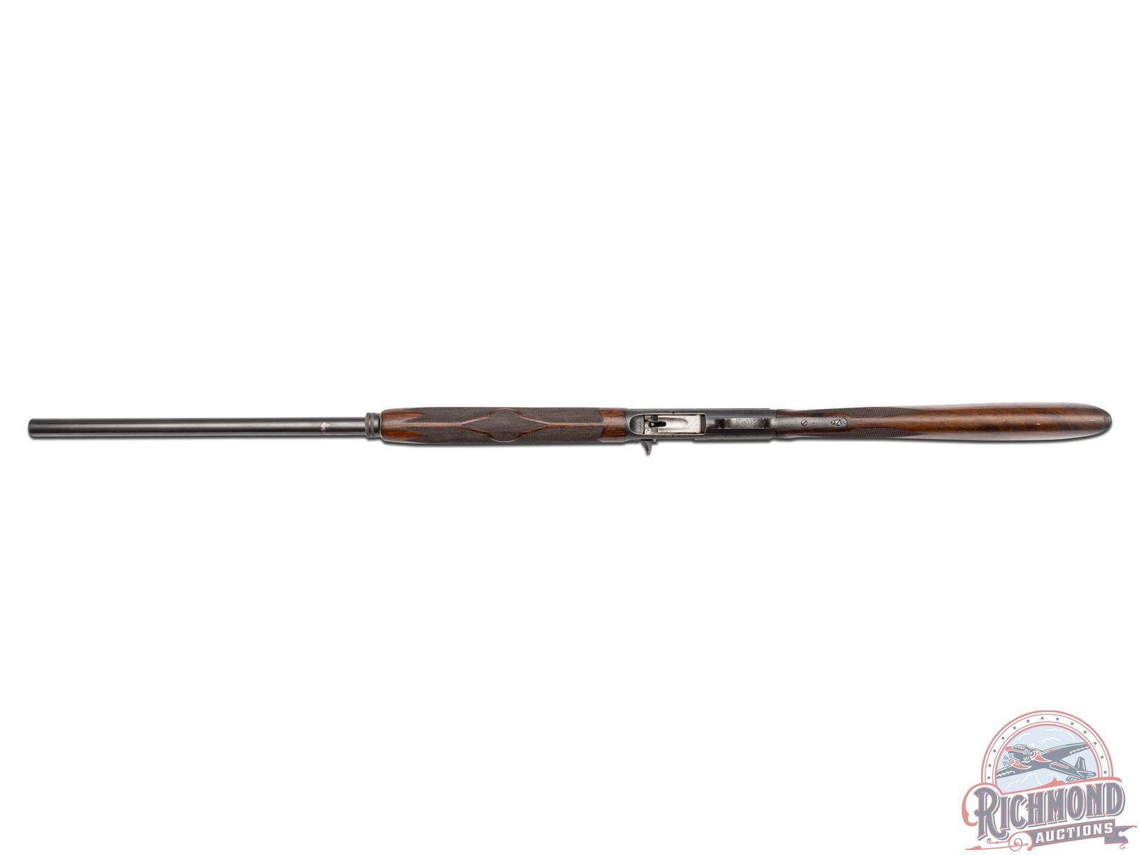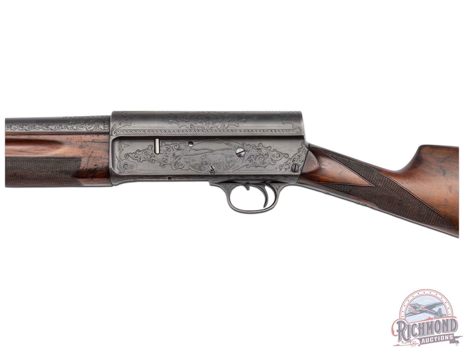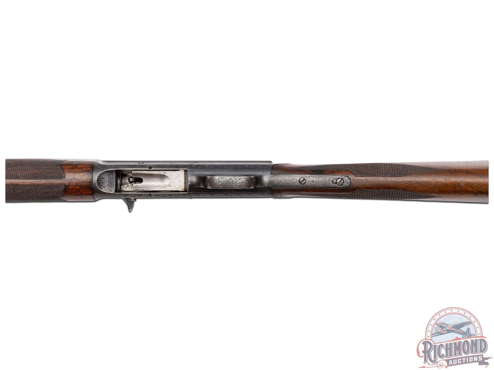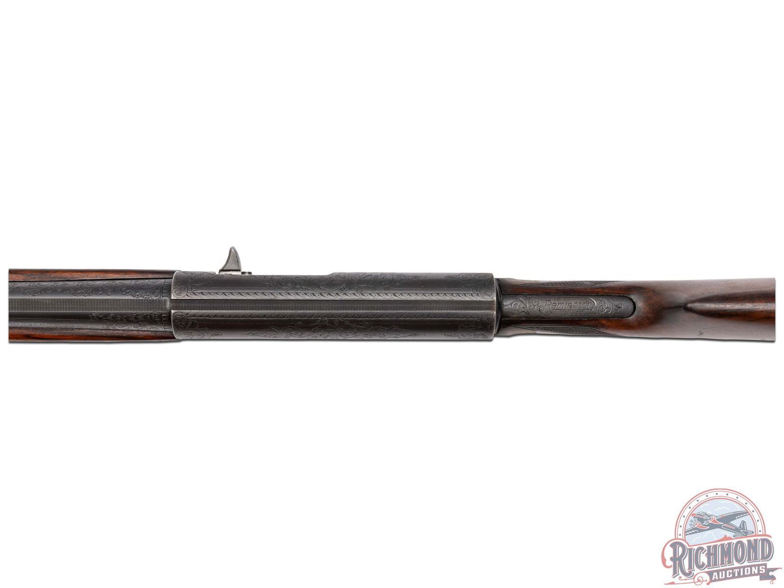 Manufactured circa 1920, no date codes found. Features a 27-1/2" blued barrel with a raised nickel bead front sight. Chambered for 2-3/4" shells with a FULL choke. Beautiful floral scroll engraving extends 6" from the action on both sides of the barrel surrounding the Remington UMC two-line address and patent. Over 80% of the receiver surface is covered in engraving including hand cut serial number markings on the underside, and starburst patterns on several screws. Each side of the receiver features a scene surrounded by floral scroll engraving and borders. Left side features a setter in a field scene and the right a duck taking flight from a pond. Top of the receiver features floral scroll engraving with nicely pattern borders that extends to the back and top of the tang. Bottom of trigger guard is engraved with a floral scroll design. Equipped with manual trigger safety. Bottom of the tang is stamped with the Remington UMC circle logo. Nicely figured straight grip walnut stock with hand-checkering on grip, matching trap/skeet style forearm with hand-checkering. Fitted with a black factory Remington UMC logo checkered synthetic butt plate. LOP: 14". DAC: 1-1/2". DAH: 2-1/4". CALIBER: 12 GA. S/N: 142259. FFL STATUS: Curio & Relic.