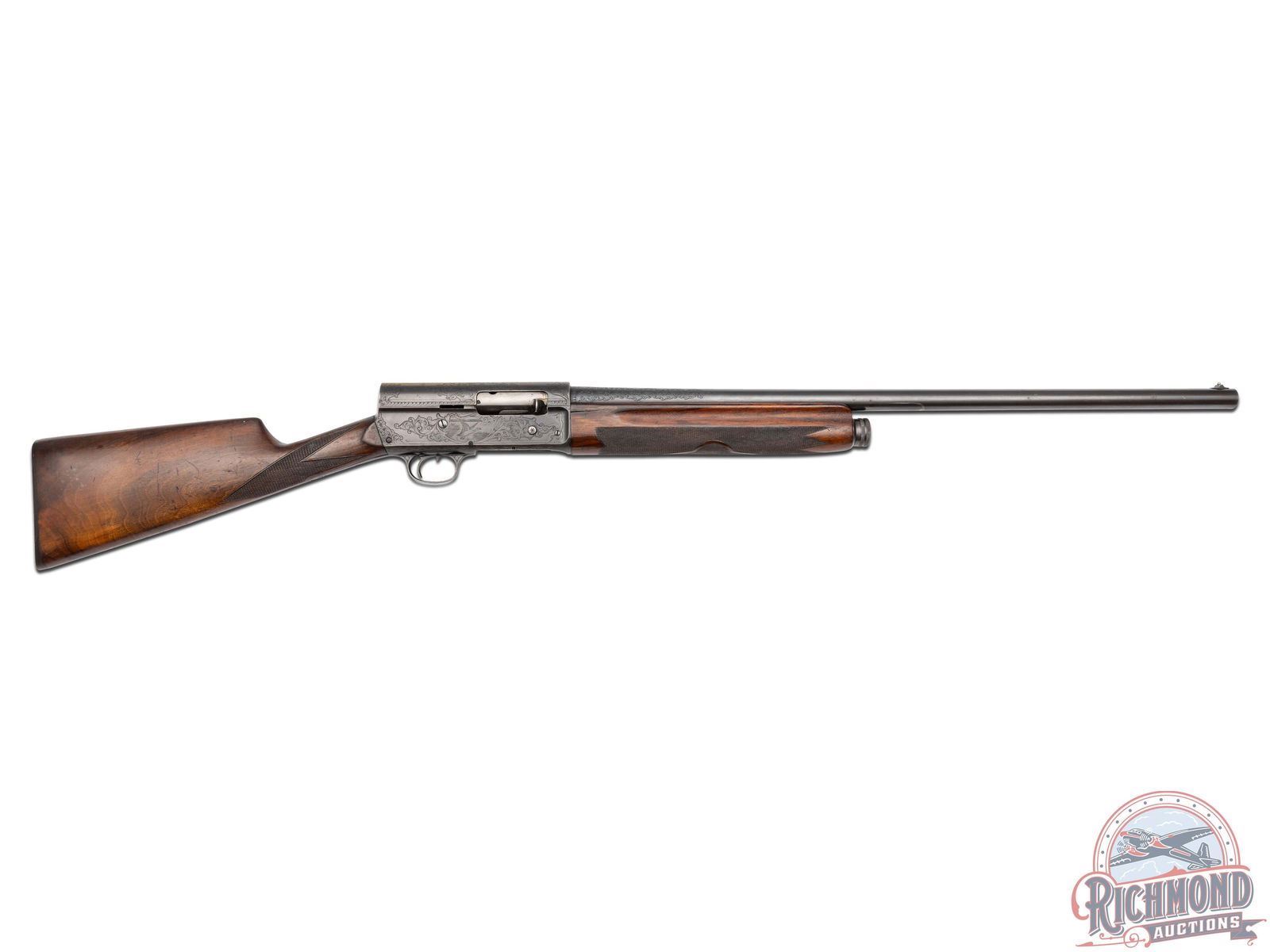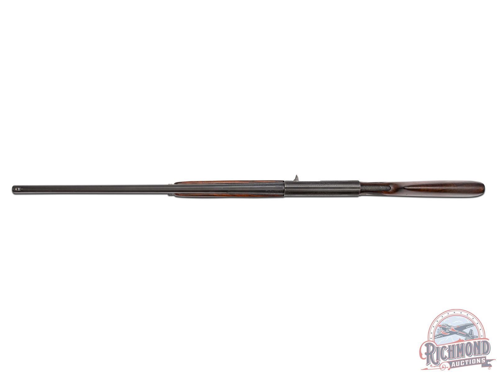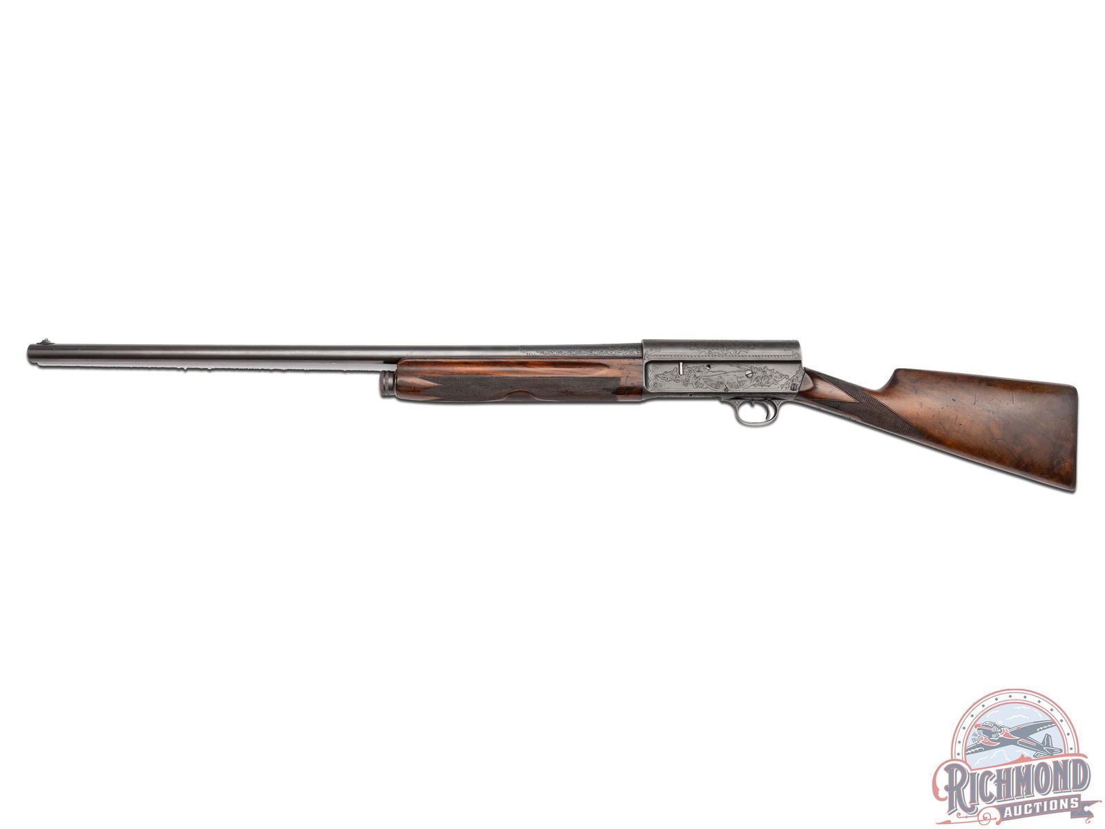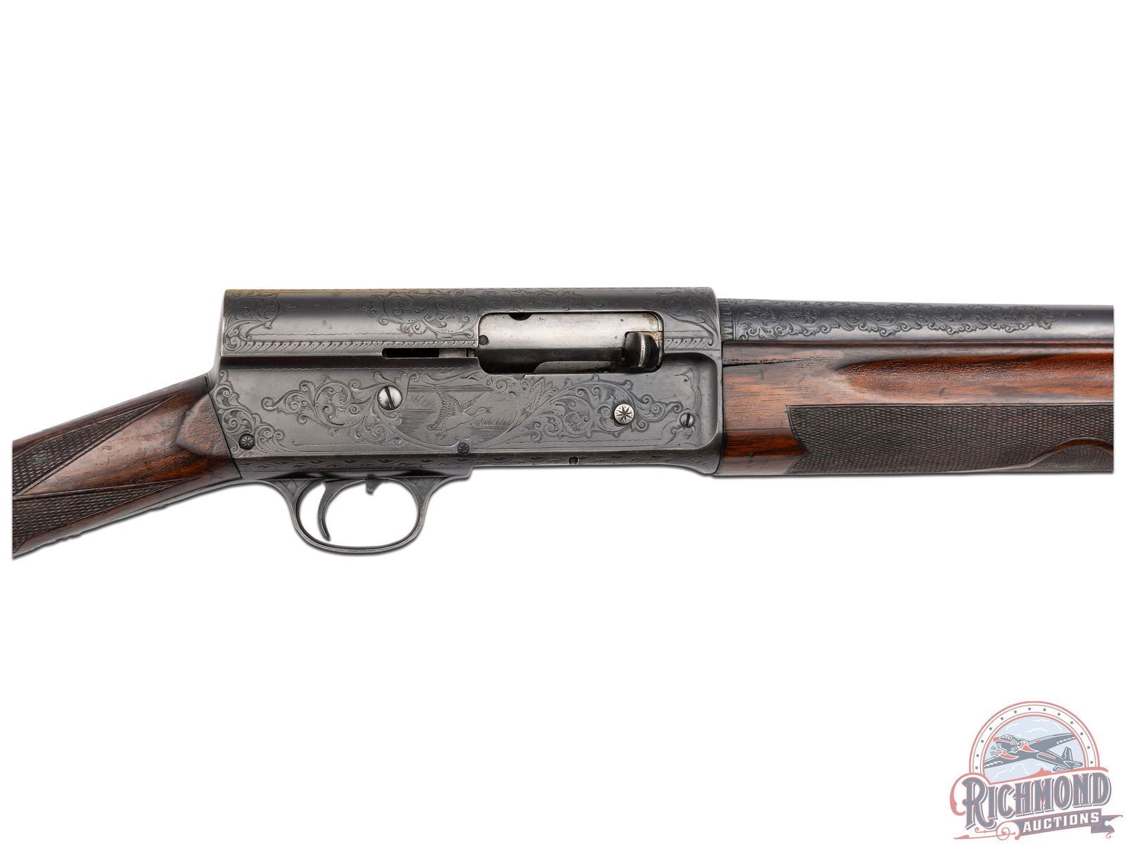 Manufactured circa 1920, no date codes found. Features a 27-1/2" blued barrel with a raised nickel bead front sight. Chambered for 2-3/4" shells with a FULL choke. Beautiful floral scroll engraving extends 6" from the action on both sides of the barrel surrounding the Remington UMC two-line address and patent. Over 80% of the receiver surface is covered in engraving including hand cut serial number markings on the underside, and starburst patterns on several screws. Each side of the receiver features a scene surrounded by floral scroll engraving and borders. Left side features a setter in a field scene and the right a duck taking flight from a pond. Top of the receiver features floral scroll engraving with nicely pattern borders that extends to the back and top of the tang. Bottom of trigger guard is engraved with a floral scroll design. Equipped with manual trigger safety. Bottom of the tang is stamped with the Remington UMC circle logo. Nicely figured straight grip walnut stock with hand-checkering on grip, matching trap/skeet style forearm with hand-checkering. Fitted with a black factory Remington UMC logo checkered synthetic butt plate. LOP: 14". DAC: 1-1/2". DAH: 2-1/4". CALIBER: 12 GA. S/N: 142259. FFL STATUS: Curio & Relic.