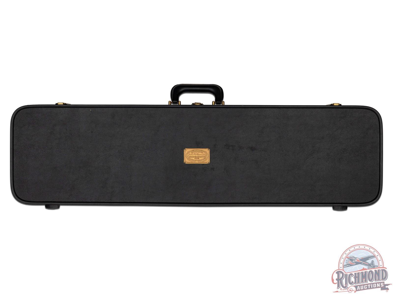 A-5 semi-automatic shotgun manufactured in 1971 for Browning by FN in Belgium. One of 2500 manufactured between 1971 to 1974. Blued round 27-1/2" fluid steel barrel with raised ventilated rib, bead front sight, fixed modified choke and 2-3/4" chamber. Blued takedown floral engraved receiver marked "Light Twelve" with John M. Browning's signature and portrait in gold on left side. Right side features floral engraving with "Browning" name and serial number in gold. gold-plated trigger with push button safety and tubular magazine. Walnut feather crotch full pistol grip checkered stock with Browning hard rubber butt plate. Matching walnut checkered forearm. Includes original factory black luggage case with Browning booklet. LOP: 14-1/4". DAC: 1-1/4". DAH: 1-3/8". CALIBER: 12 GA. S/N: 2,000,000-58. FFL STATUS: Curio & Relic.