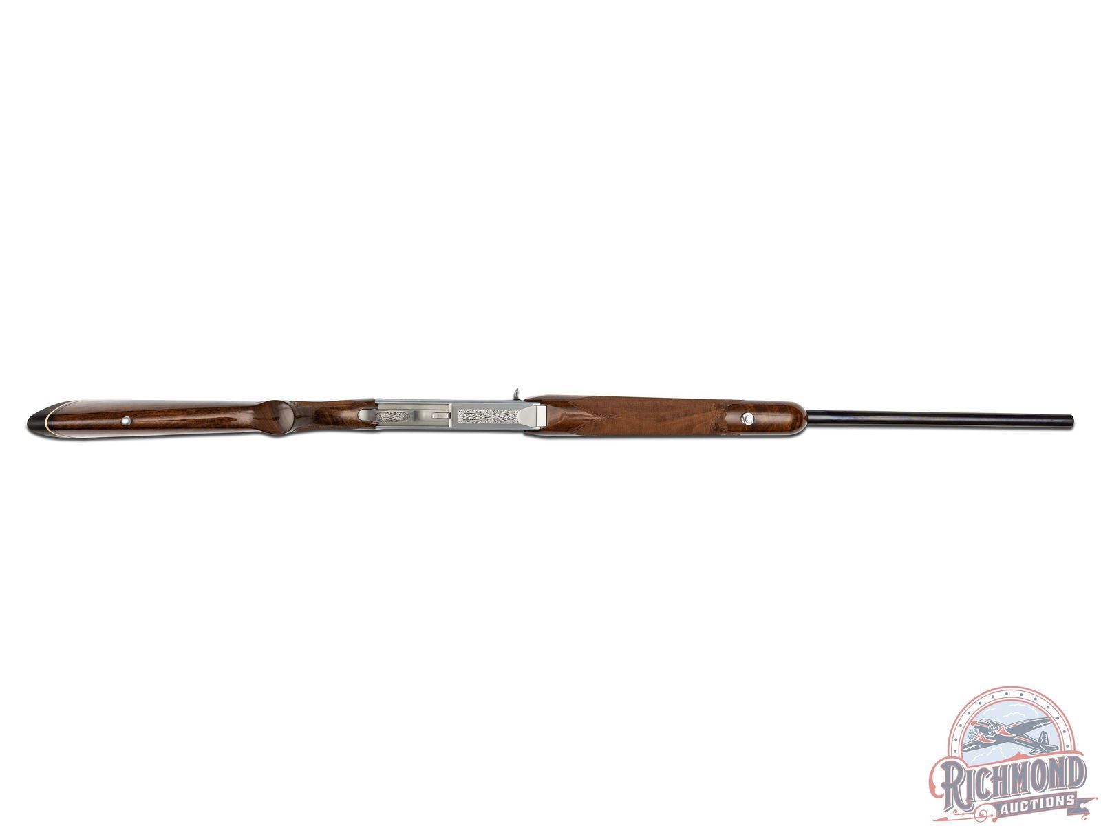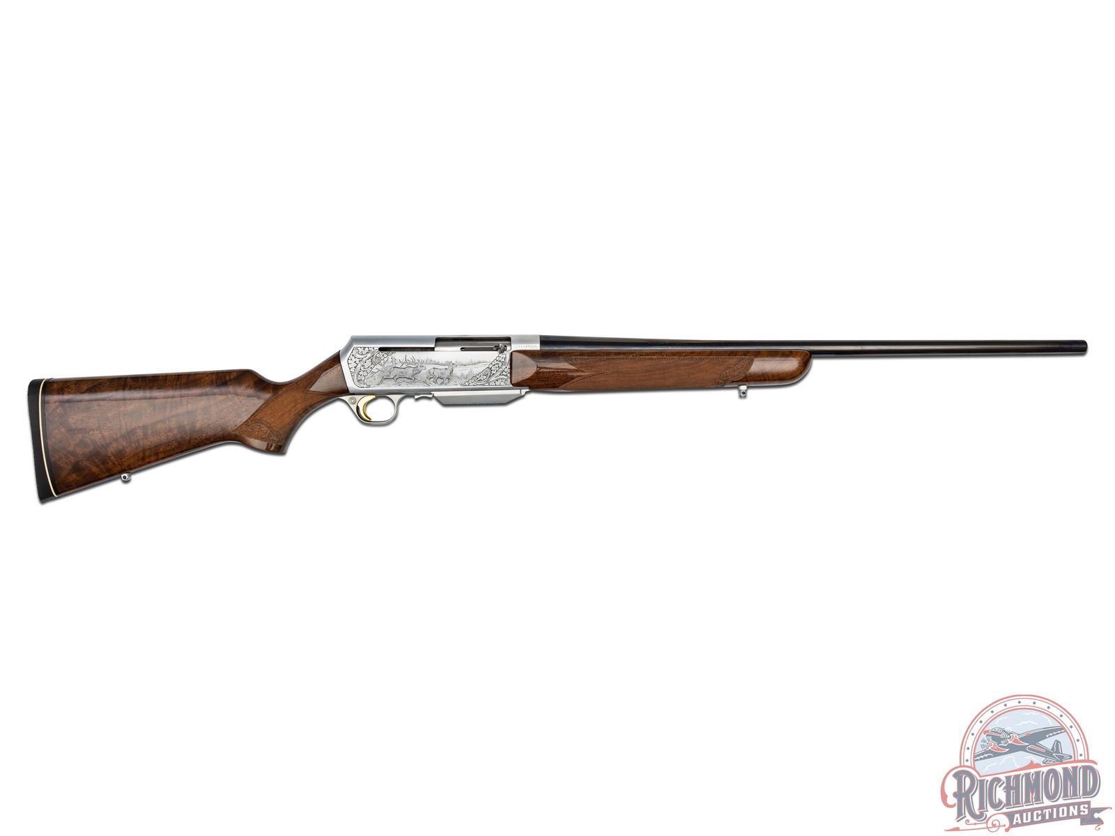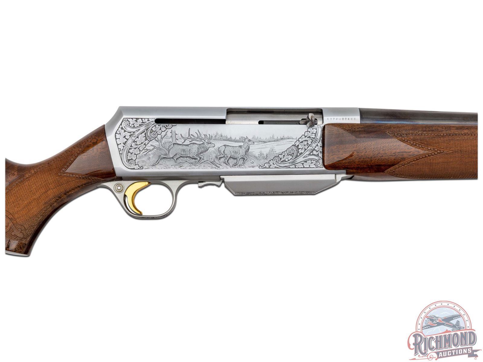 Manufactured in 1980 by FN for Browning. Blued 22" sightless Browning addressed barrel in 300 Winchester Magnum. French gray finished semi automatic receiver with game scenes of elk and moose, gold-plated trigger and detachable and engraved magazine. Figured factory walnut pistol grip stock with carved border checkering and factory Browning solid black rubber recoil pad. Matching carved border checkered forearm. CALIBER: 300 WIN MAG. S/N: 437PM02466. FFL STATUS: Modern.