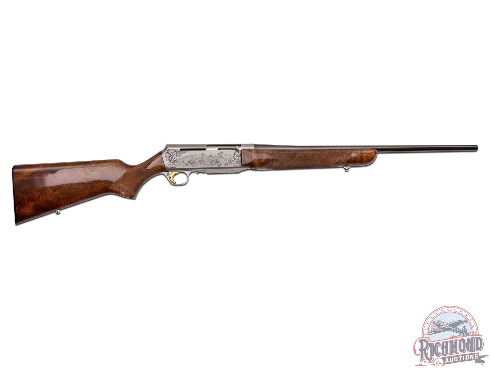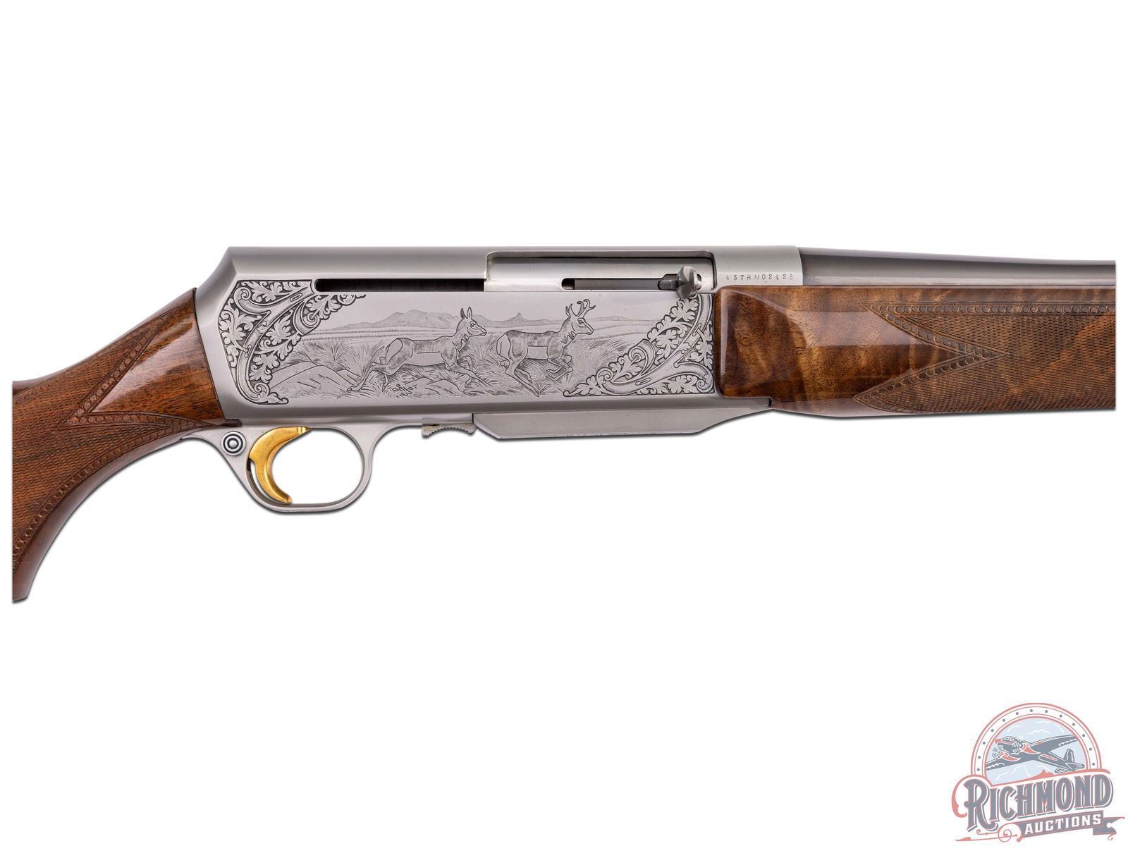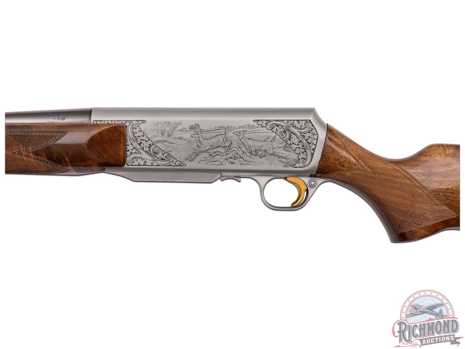 Made in Herstal, Belgium by Browning in 1979. 22" blued sightless round tapered steel barrel with Browning Utah and Montreal addresses in 30-06 caliber. Satin finish engraved receiver with antelope scene on right panel and deer scene on left with floral scene on detachable magazine. No engraver's name is visible. Action is factory drilled and plugged with screws for scope mounting and has gold washed trigger and matching detachable magazine. Walnut checkered pistol grip stock with leaf and chain carved border. Stock is fitted with satin finished quick detachable sling swivel studs. LOP: 13-5/8". DAC: 1-5/8". DAH: 2". CALIBER: 30-06. S/N: 437RN02425. FFL STATUS: Modern.