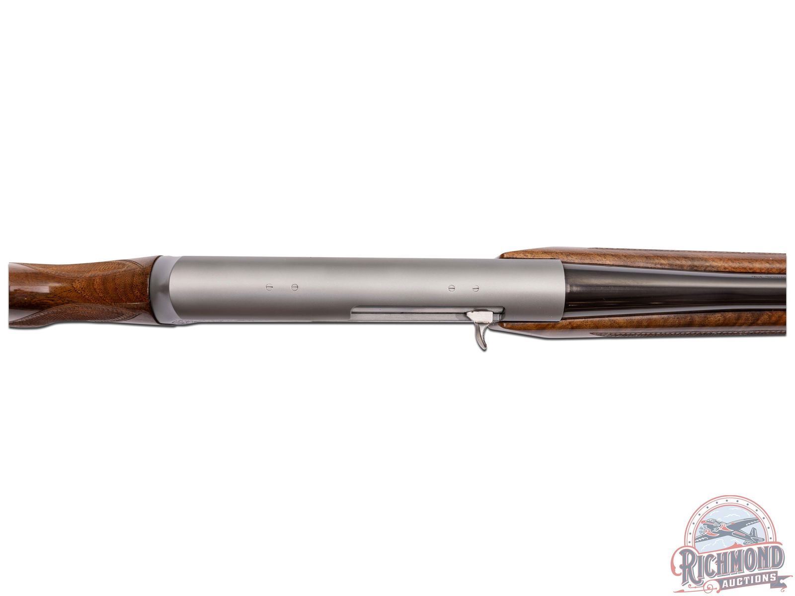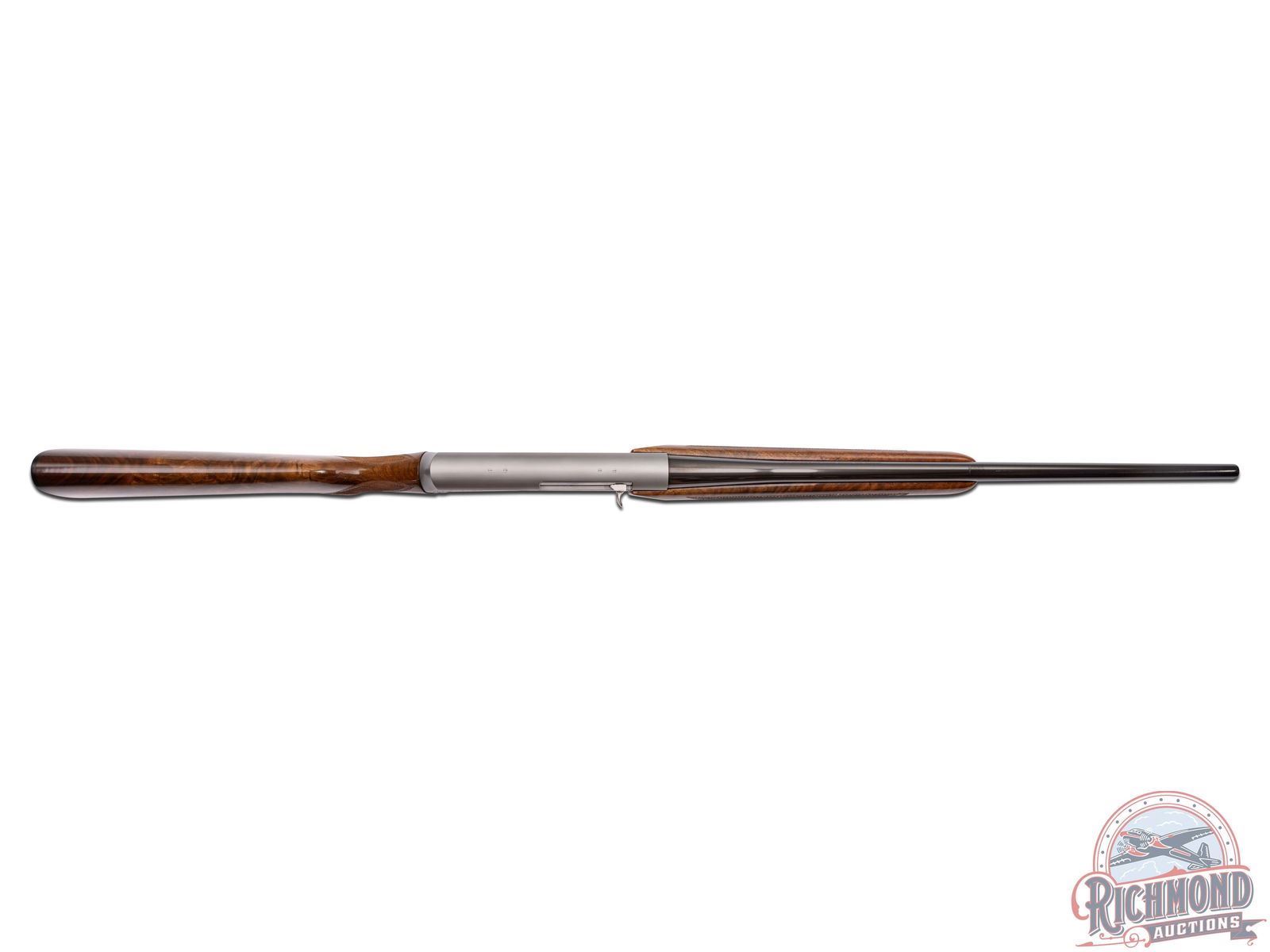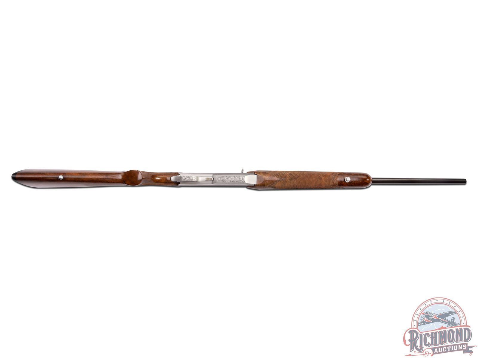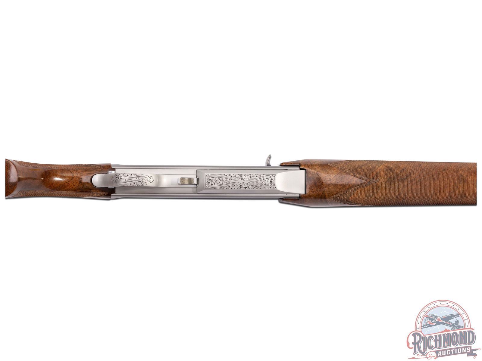 Made in Herstal, Belgium by Browning in 1979. 22" blued sightless round tapered steel barrel with Browning Utah and Montreal addresses in 30-06 caliber. Satin finish engraved receiver with antelope scene on right panel and deer scene on left with floral scene on detachable magazine. No engraver's name is visible. Action is factory drilled and plugged with screws for scope mounting and has gold washed trigger and matching detachable magazine. Walnut checkered pistol grip stock with leaf and chain carved border. Stock is fitted with satin finished quick detachable sling swivel studs. LOP: 13-5/8". DAC: 1-5/8". DAH: 2". CALIBER: 30-06. S/N: 437RN02425. FFL STATUS: Modern.