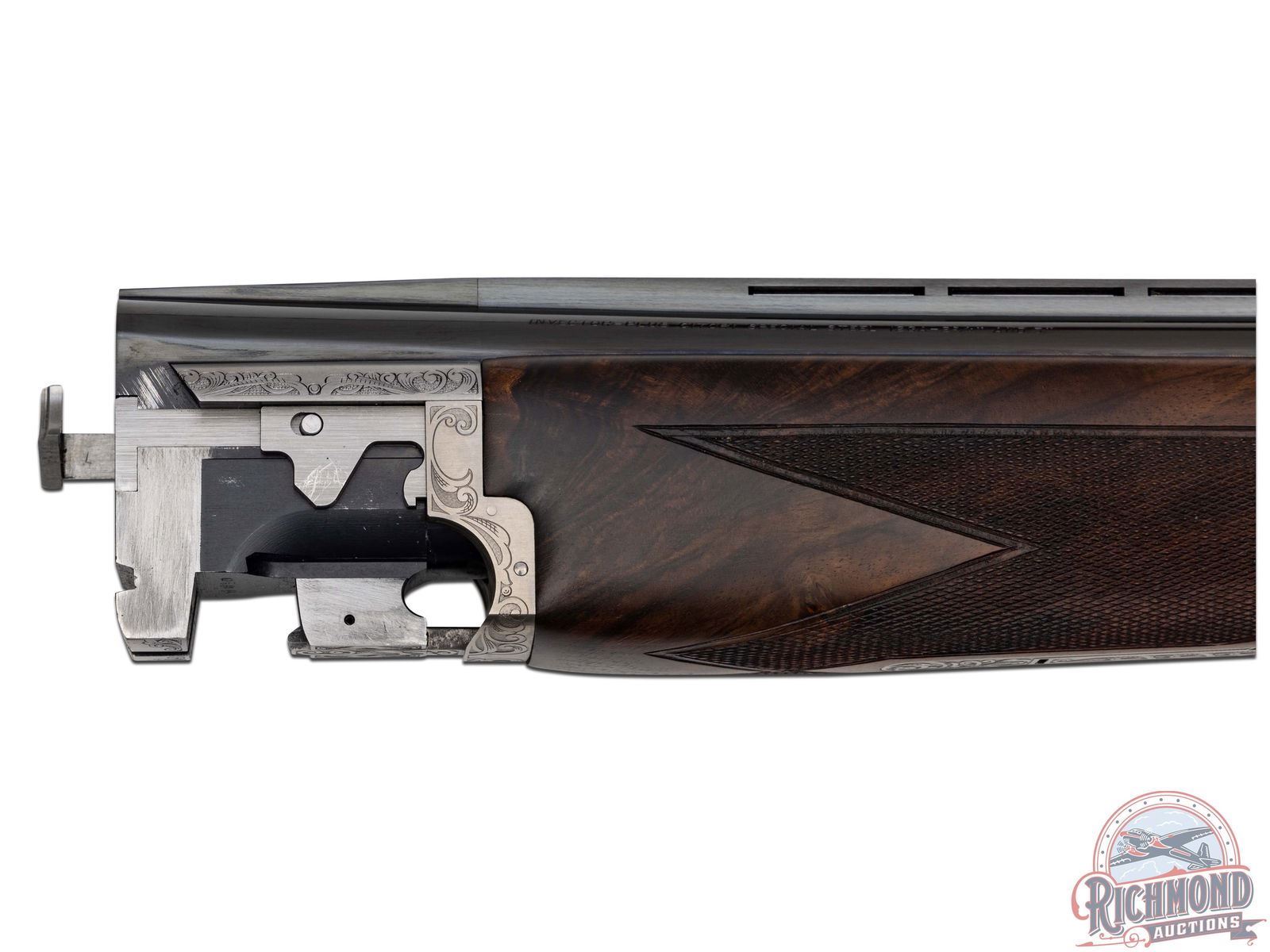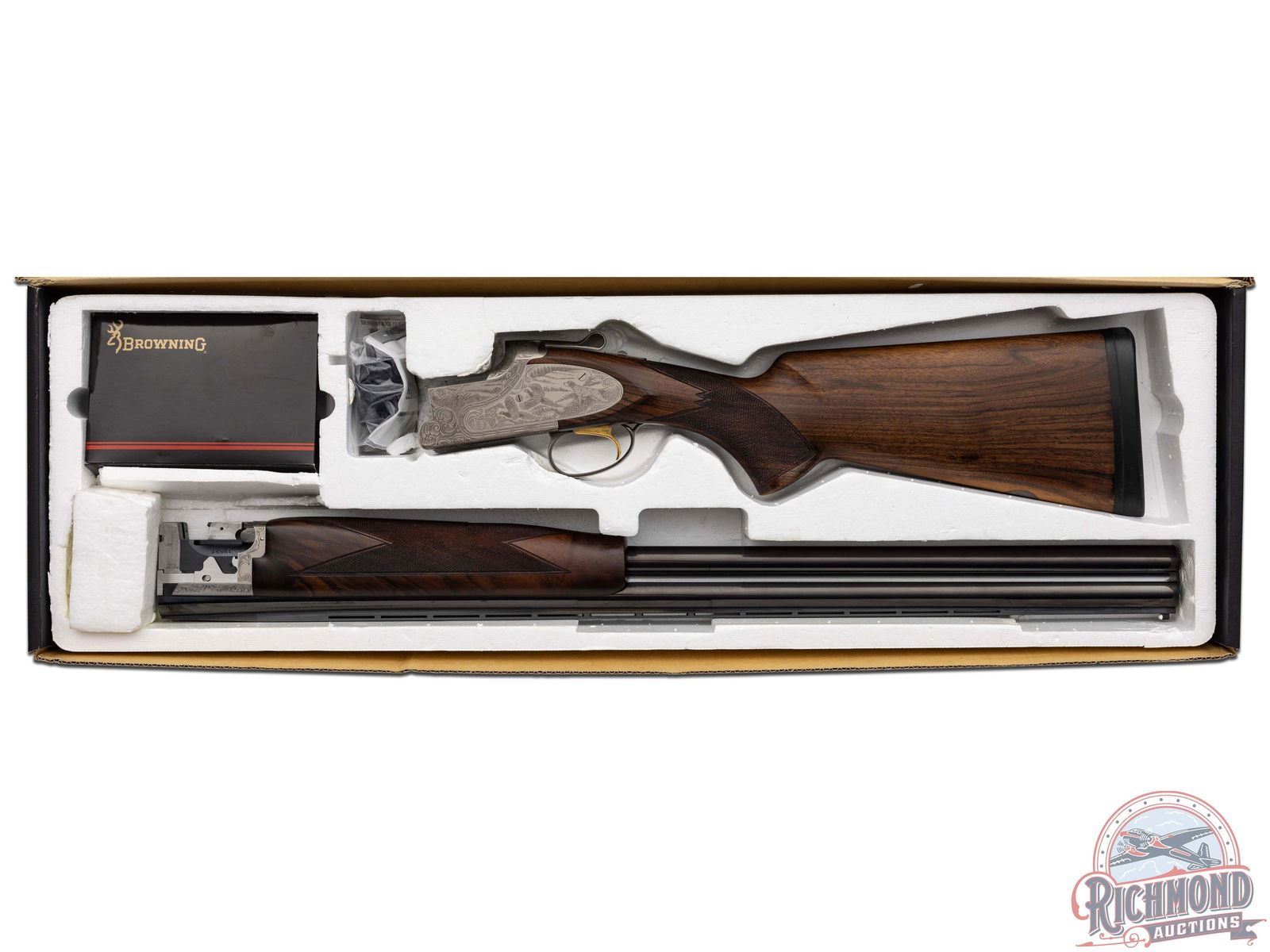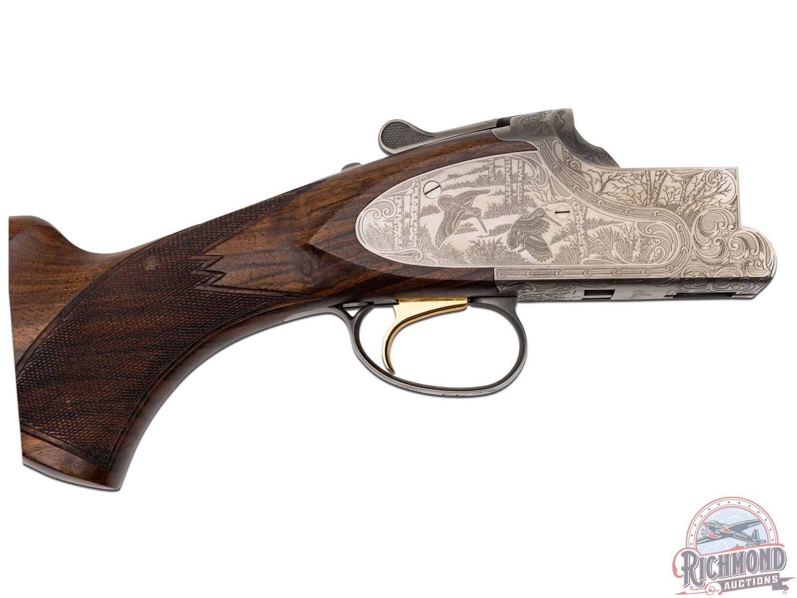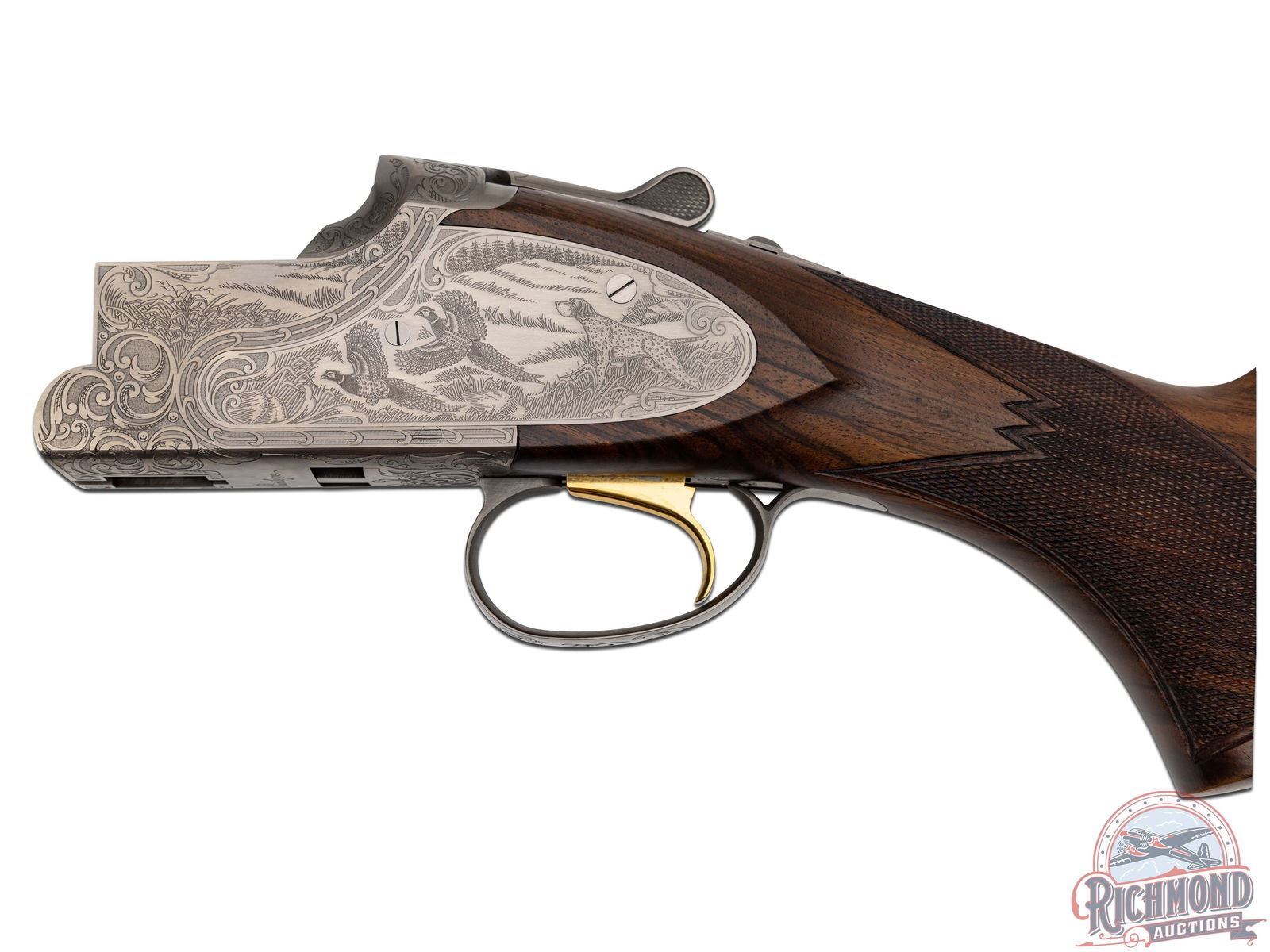 Manufactured in 2000. O/U with standard markings on the barrel. Matching serials on the frame, barrel and forearm. 28" barrels with full vent rib and white bead front sight. Coin finished frame with factory game scene engraving, with 95% coverage. Woodcocks in flight on the right side of the frame with a pointer dog and pheasants on the left. "Privilege" in script on the underside. Nicely oiled walnut stock and forearm with fine checkering on the wrist and forearm. Factory black rubber butt pad. Gold washed single trigger. Tang safety and selector with ejectors on the barrel. 3" chambers. Invector choke tubes with modified and improved cylinder tubes installed. Includes non-matching box, manual, lock and choke tube wrench. CALIBER: 12 GA. S/N: 19537MM131. FFL STATUS: Modern.