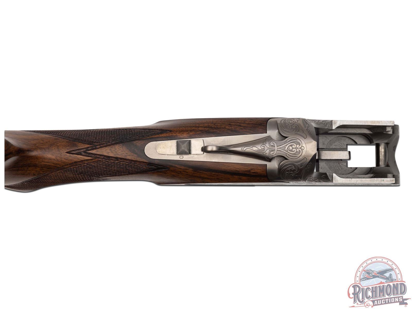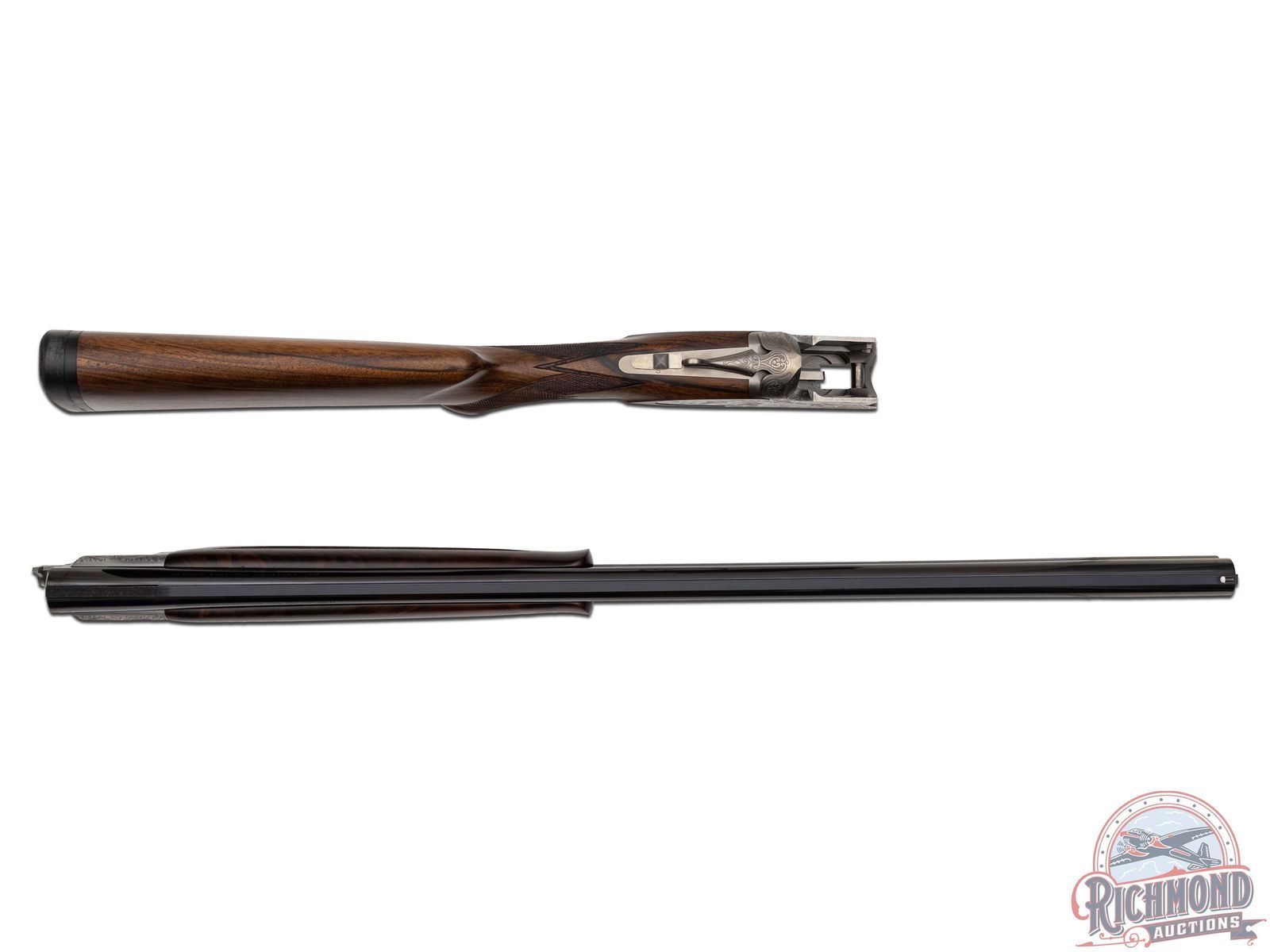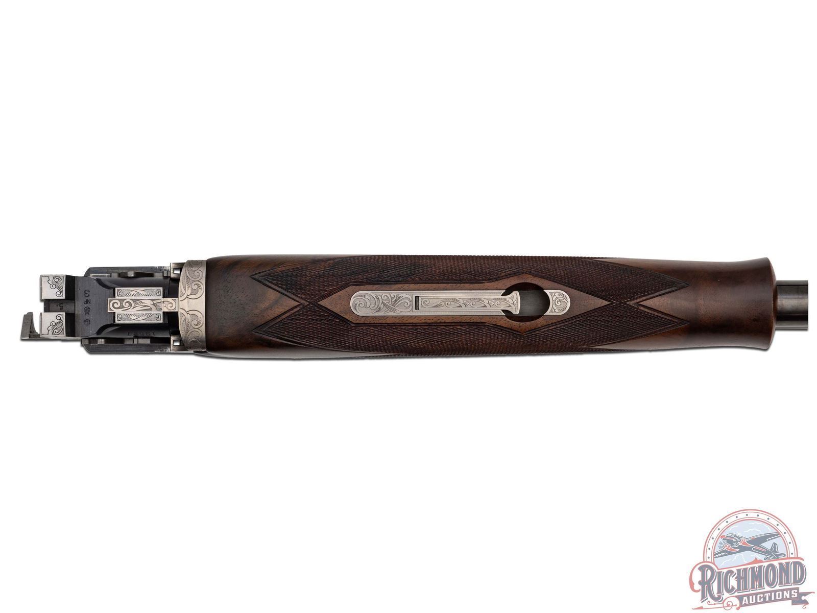 Manufactured in 2000. O/U with standard markings on the barrel. Matching serials on the frame, barrel and forearm. 28" barrels with full vent rib and white bead front sight. Coin finished frame with factory game scene engraving, with 95% coverage. Woodcocks in flight on the right side of the frame with a pointer dog and pheasants on the left. "Privilege" in script on the underside. Nicely oiled walnut stock and forearm with fine checkering on the wrist and forearm. Factory black rubber butt pad. Gold washed single trigger. Tang safety and selector with ejectors on the barrel. 3" chambers. Invector choke tubes with modified and improved cylinder tubes installed. Includes non-matching box, manual, lock and choke tube wrench. CALIBER: 12 GA. S/N: 19537MM131. FFL STATUS: Modern.