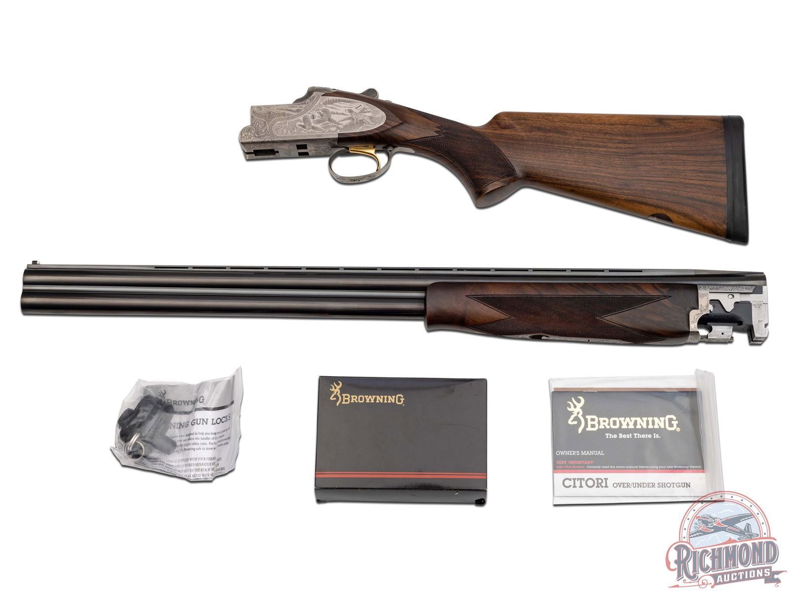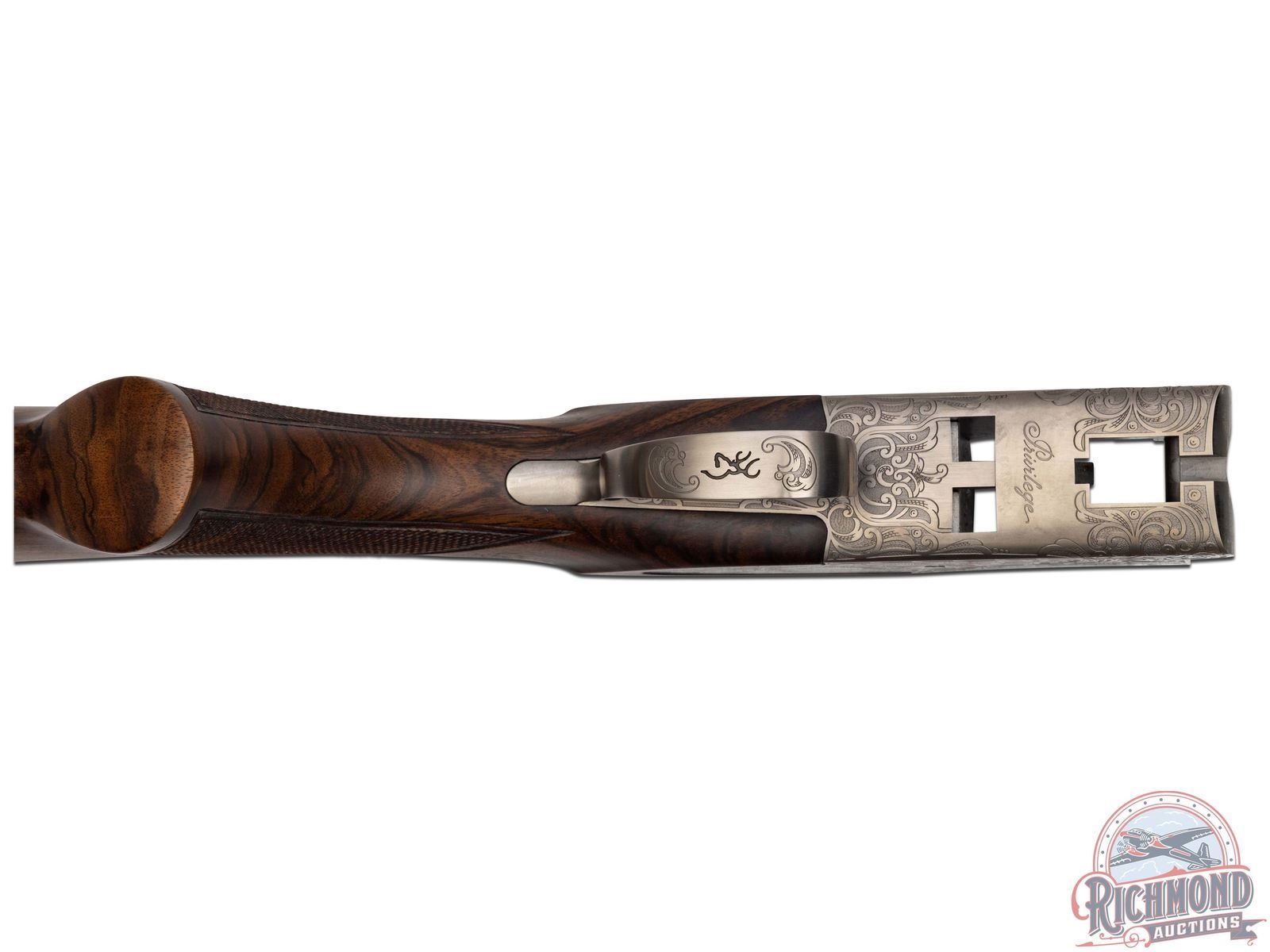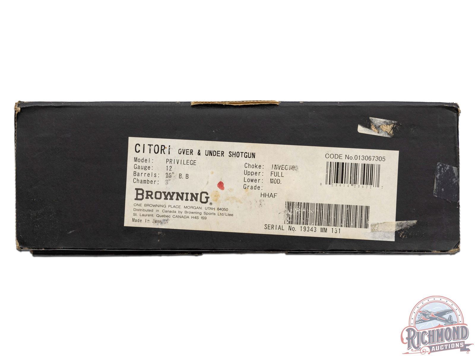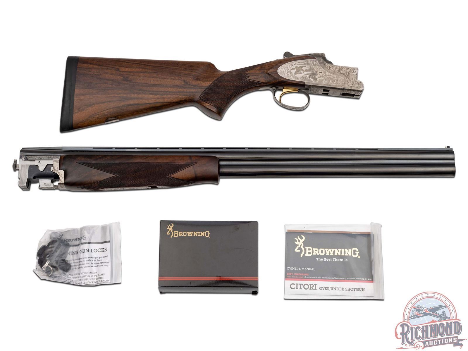 Manufactured in 2000. O/U with standard markings on the barrel. Matching serials on the frame, barrel and forearm. 28" barrels with full vent rib and white bead front sight. Coin finished frame with factory game scene engraving, with 95% coverage. Woodcocks in flight on the right side of the frame with a pointer dog and pheasants on the left. "Privilege" in script on the underside. Nicely oiled walnut stock and forearm with fine checkering on the wrist and forearm. Factory black rubber butt pad. Gold washed single trigger. Tang safety and selector with ejectors on the barrel. 3" chambers. Invector choke tubes with modified and improved cylinder tubes installed. Includes non-matching box, manual, lock and choke tube wrench. CALIBER: 12 GA. S/N: 19537MM131. FFL STATUS: Modern.