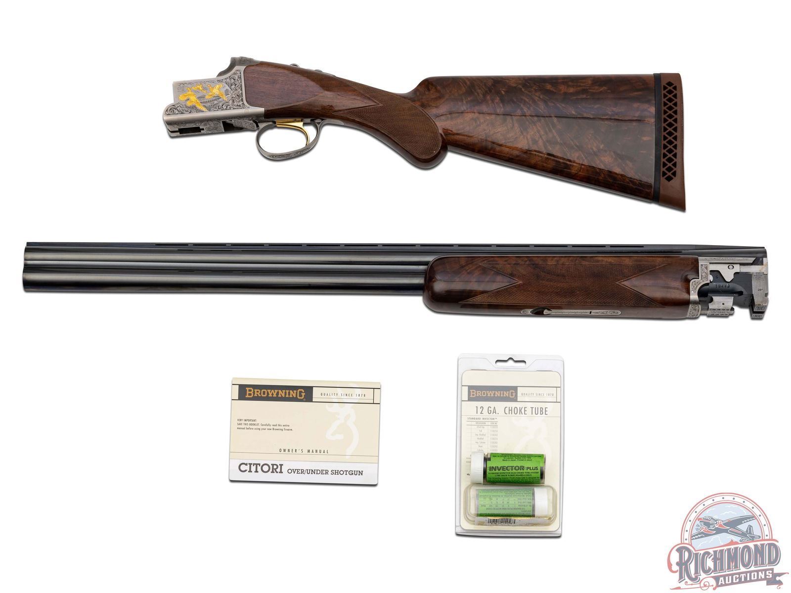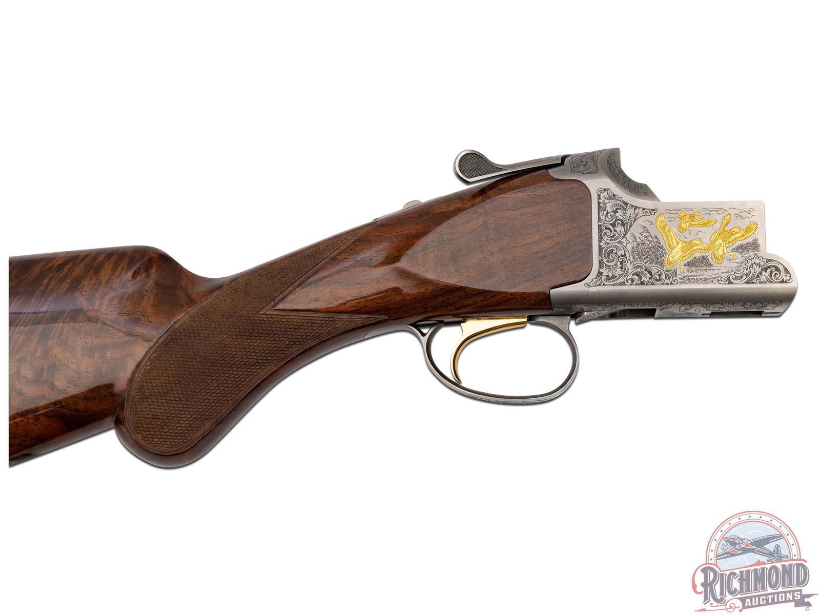 Manufactured in 2000. Standard markings on the barrel. Matching serials on the frame, barrel and forearm. 28" O/U barrels with full vent rib and steel bead front sight. Coin finished frame with factory Grade VI game scene engraving. Gold inlay pheasants on the left side of the frame and woodcocks on the right. Portrait of a pointer dog on the bottom of the frame. Fine walnut furniture with fine cut checkering on the forearm and pistol grip wrist. Added brown rubber "BROWNING" marked butt pad. Single gold washed trigger and tang safety/barrel selector. 3" chambers. Invector choke tubes, with full, modified, improved modified and improved cylinder choke tubes included. Includes serial number matching box and manual. LOP: 14-1/4". DAC: 1-1/2". DAH: 2-1/2". CALIBER: 12 GA. S/N: 19449MM131. FFL STATUS: Modern.