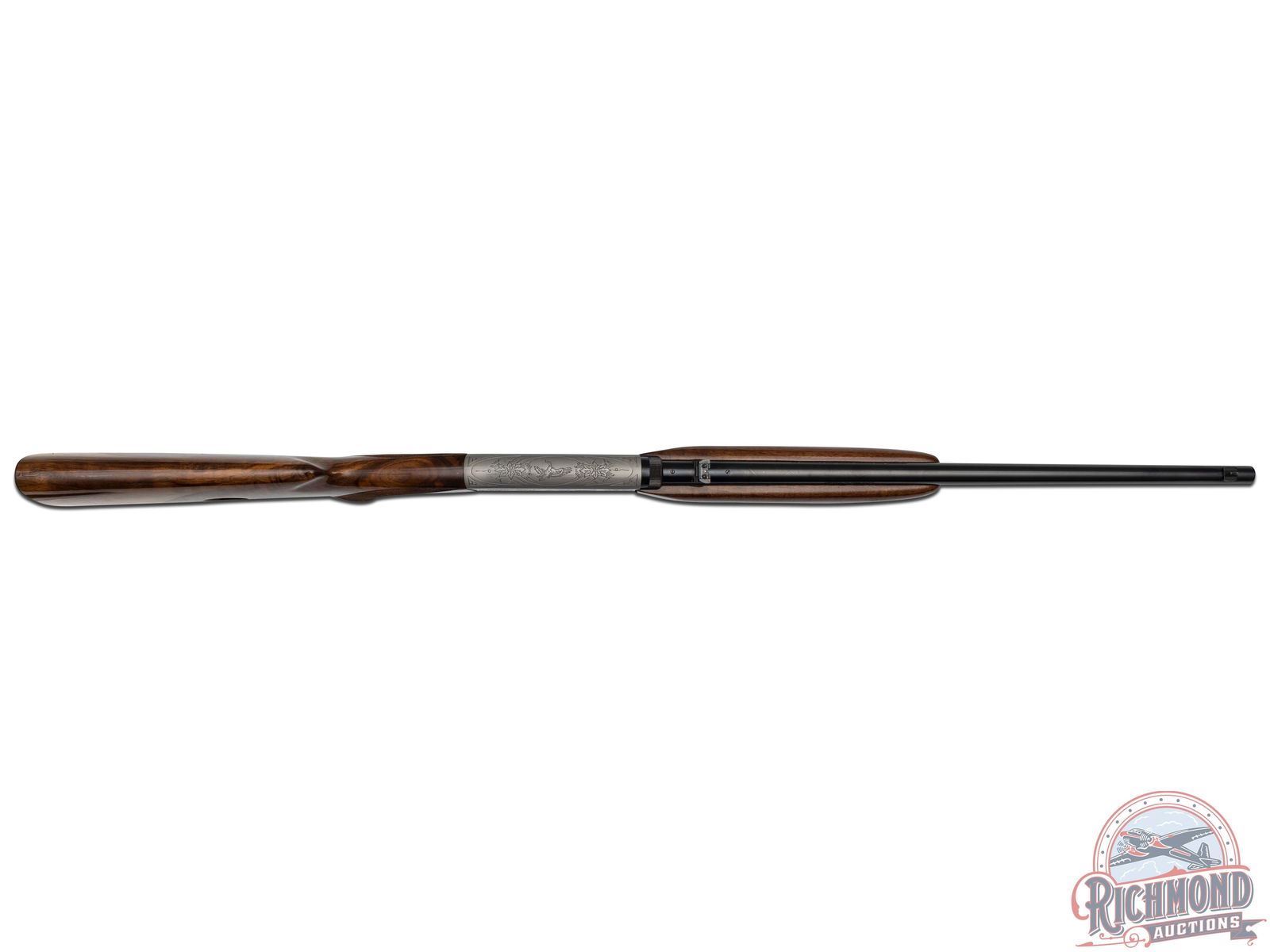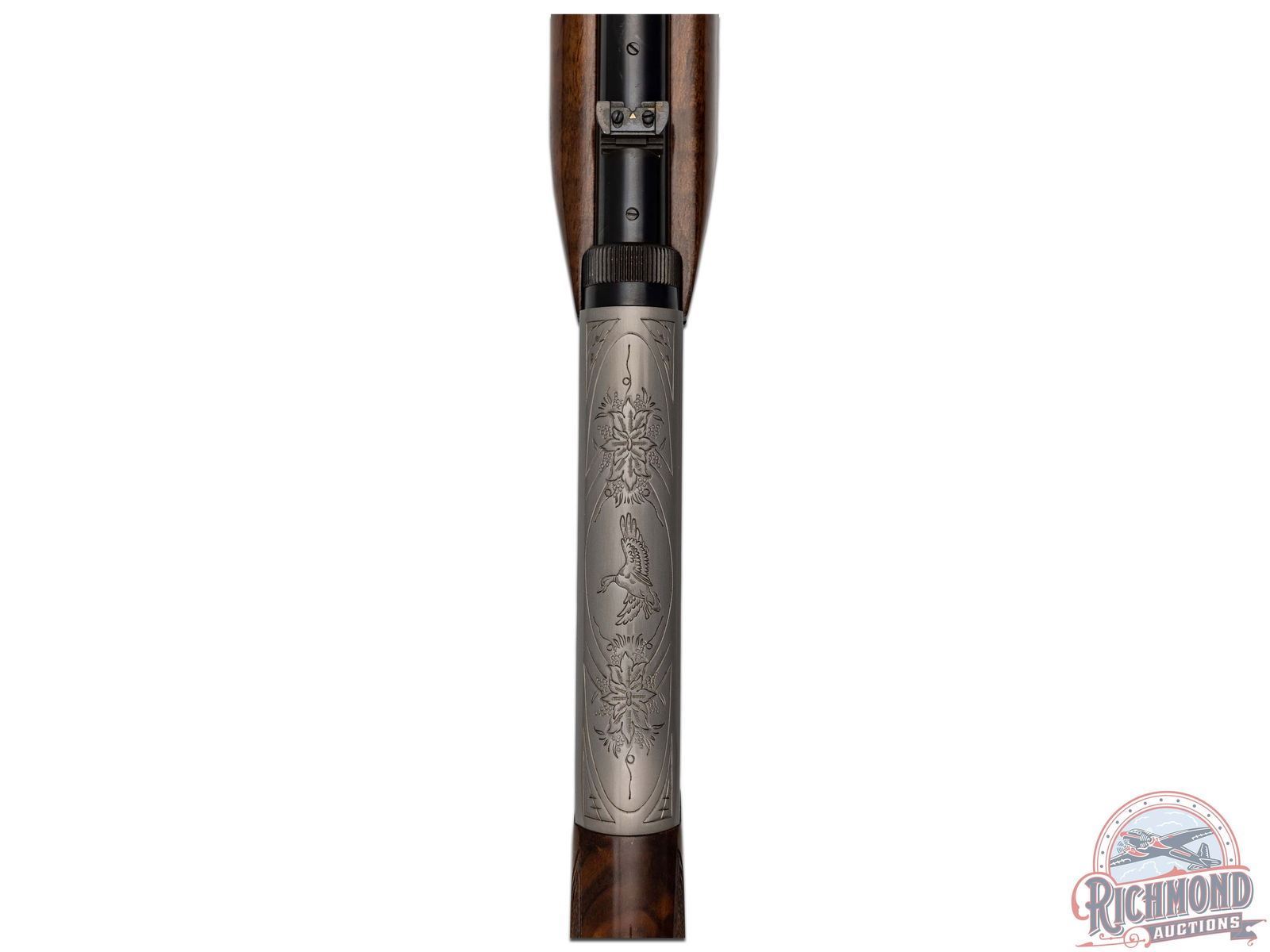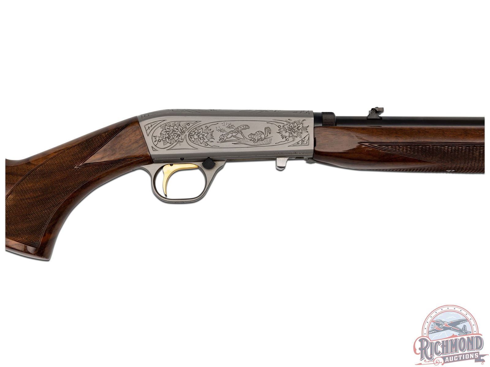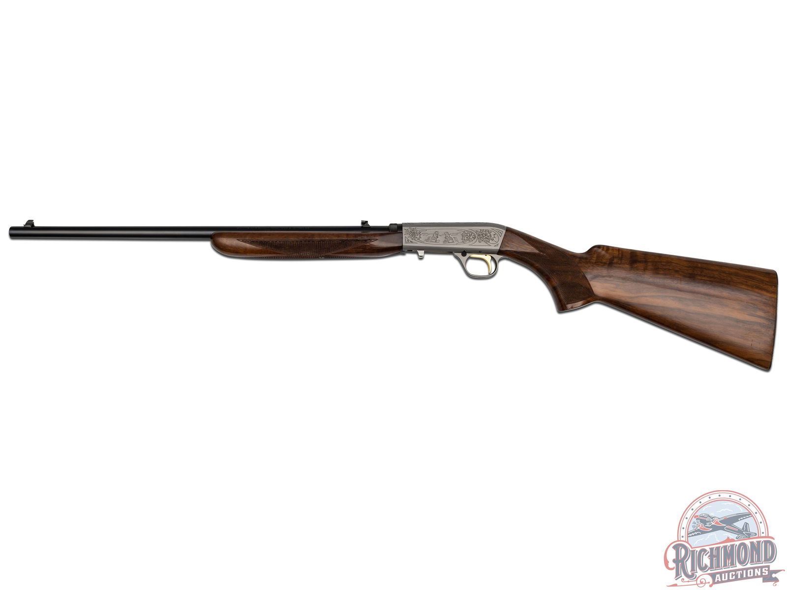 Manufactured in 1982. Blued round 19-3/8" barrel with hunting sights and factory drilled for scope. Grayed takedown receiver with squirrel and duck engraving. Gold plate trigger with push button safety and tubular magazine. Walnut figured checkered two piece stock with blued serrated butt plate. CALIBER: 22 LR. S/N: 01737PY246. FFL STATUS: Modern.