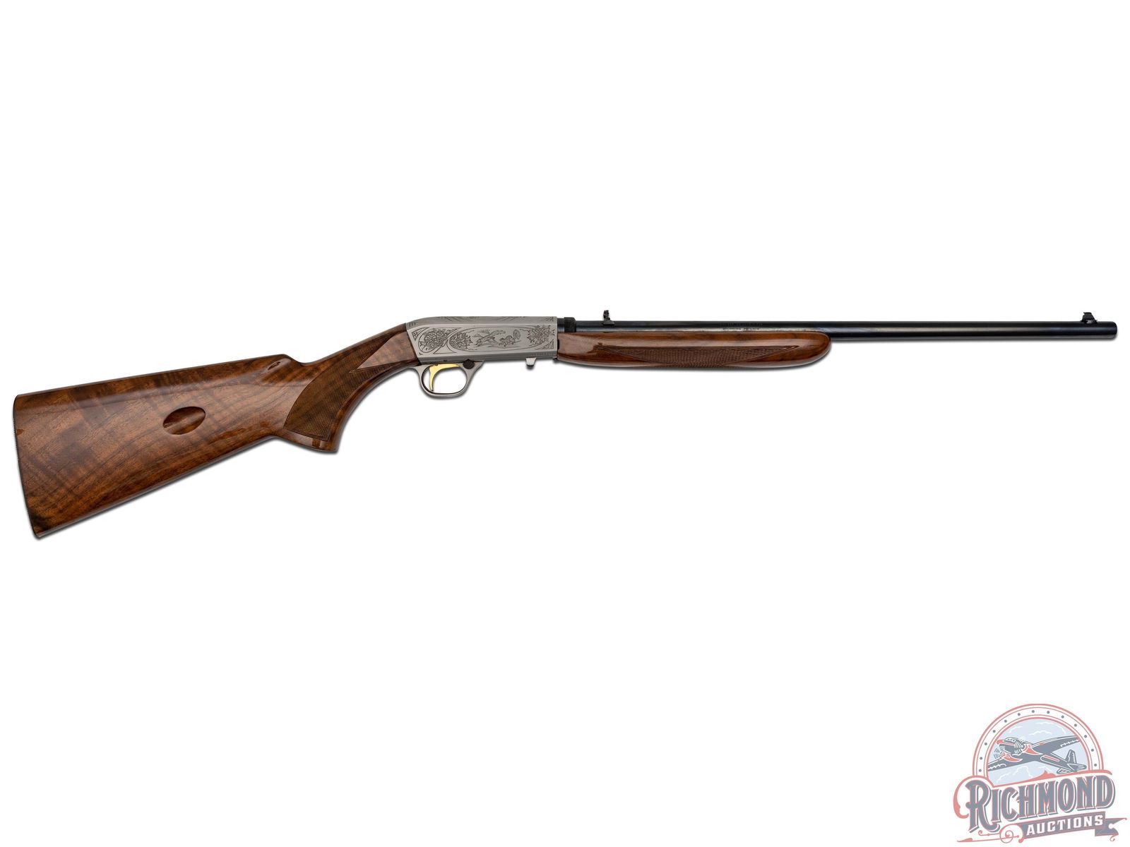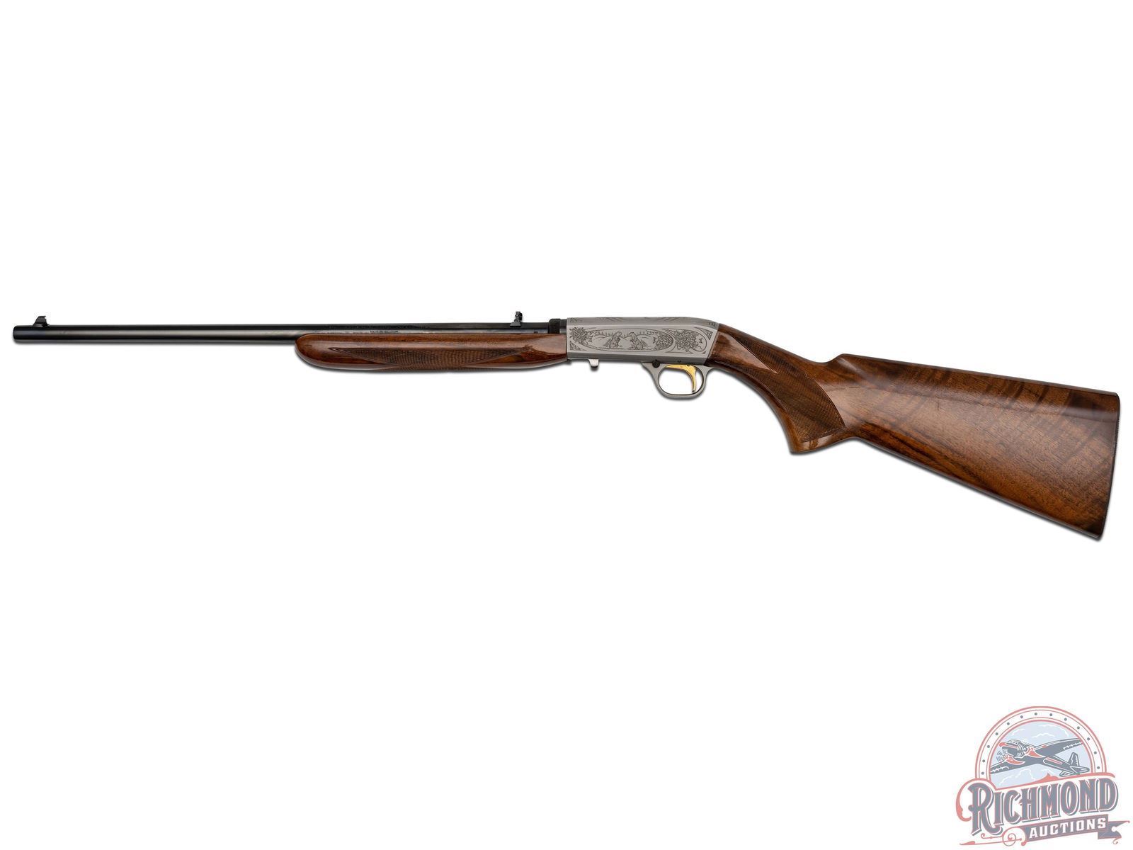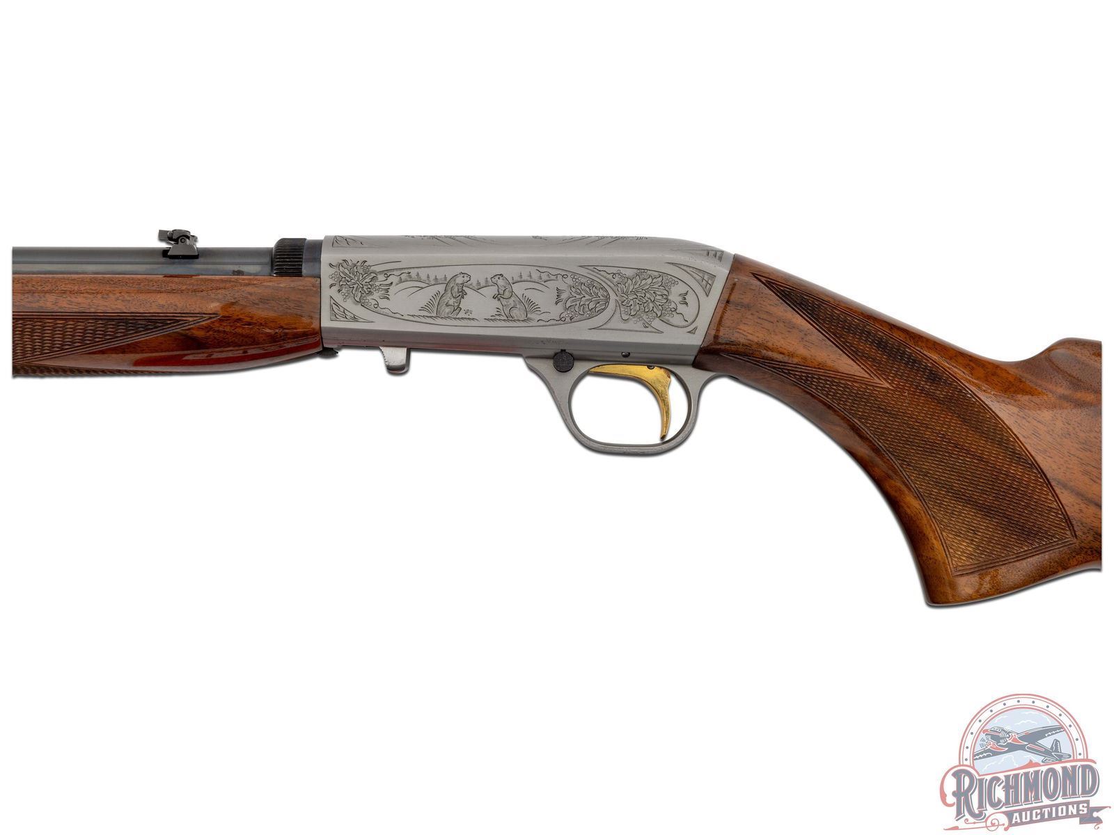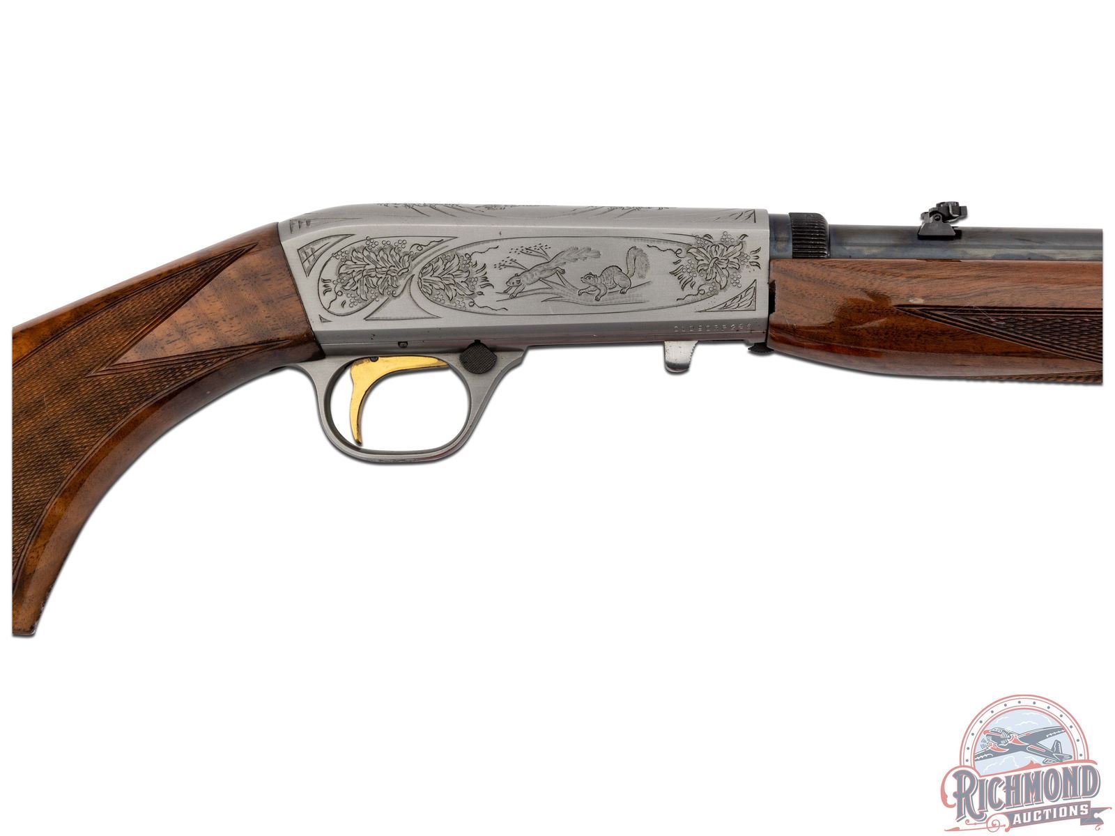 Manufactured in 1978 in Japan with Belgium made barrel. Blued round 19-3/8" barrel with standard sights and factory scope holes with plug screws. grayed take down receiver with squirrel and floral engraving and duck motif on top of receiver. gold-plated trigger with push button safety and tubular magazine. Walnut checkered two piece factory stock with blued serrated butt plate. CALIBER: 22 LR. S/N: 01090RP246. FFL STATUS: Modern.