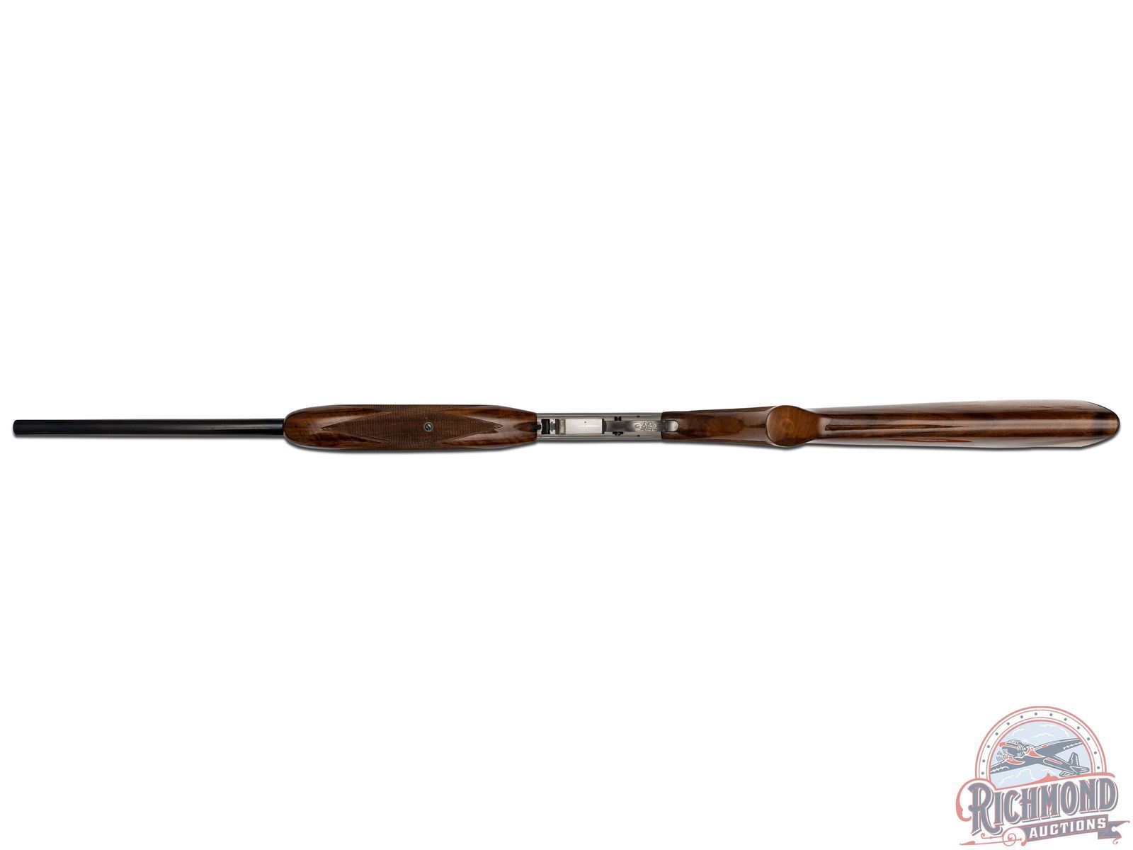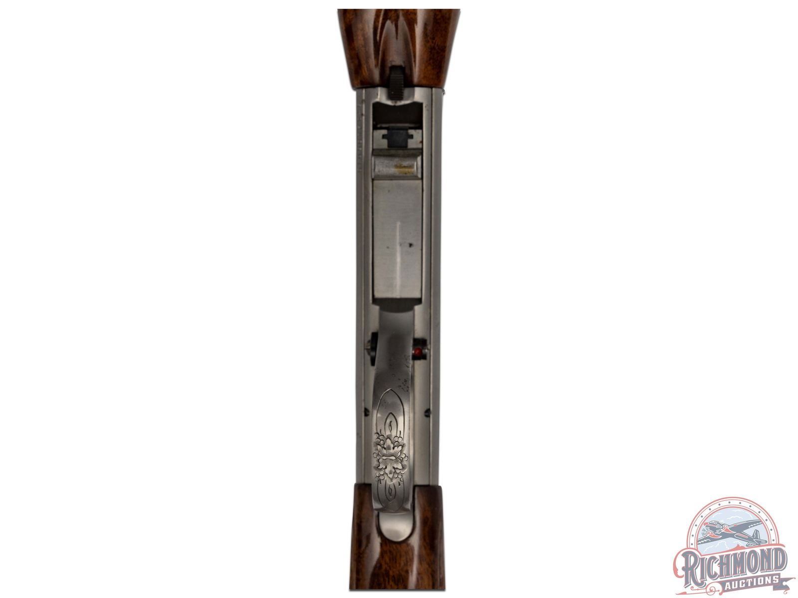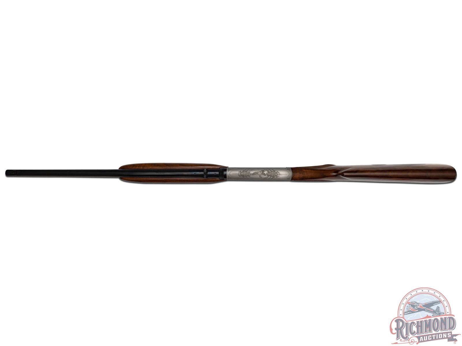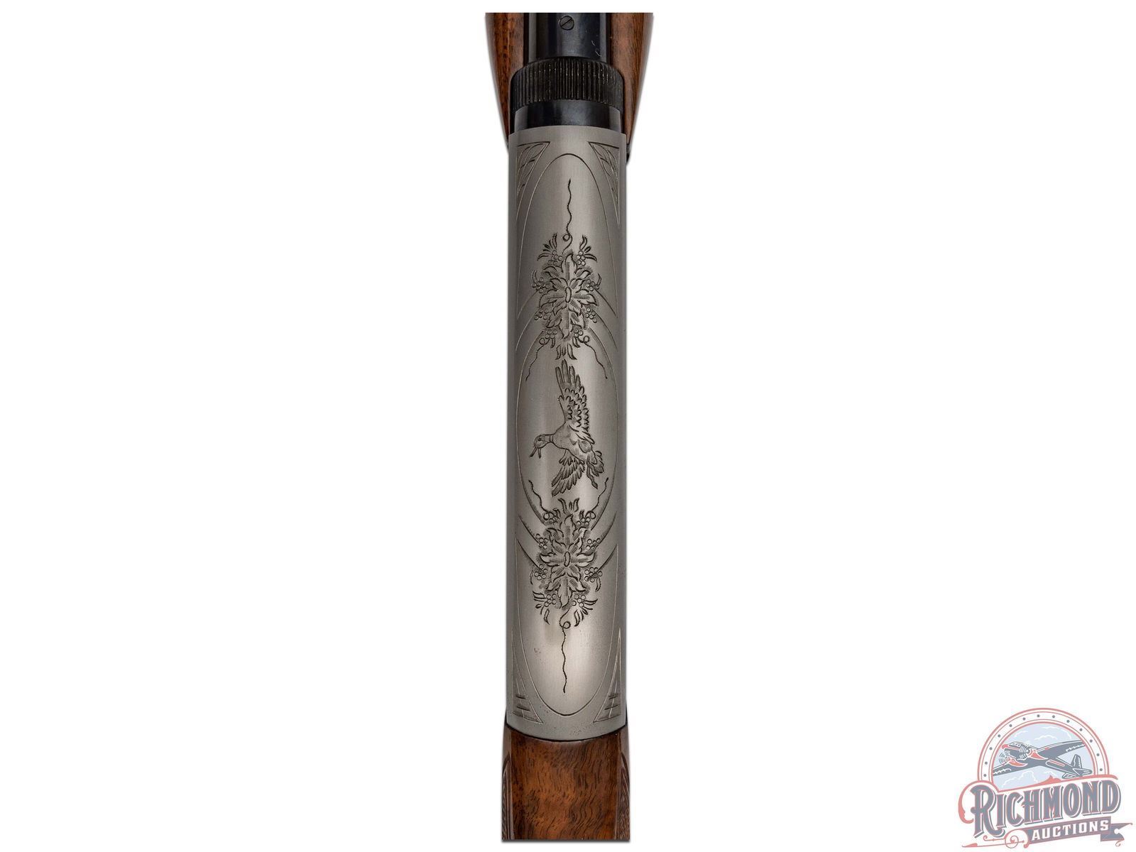 Manufactured in 1978 in Japan with Belgium made barrel. Blued round 19-3/8" barrel with standard sights and factory scope holes with plug screws. grayed take down receiver with squirrel and floral engraving and duck motif on top of receiver. gold-plated trigger with push button safety and tubular magazine. Walnut checkered two piece factory stock with blued serrated butt plate. CALIBER: 22 LR. S/N: 01090RP246. FFL STATUS: Modern.