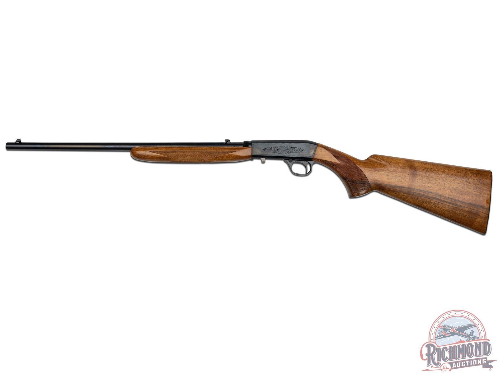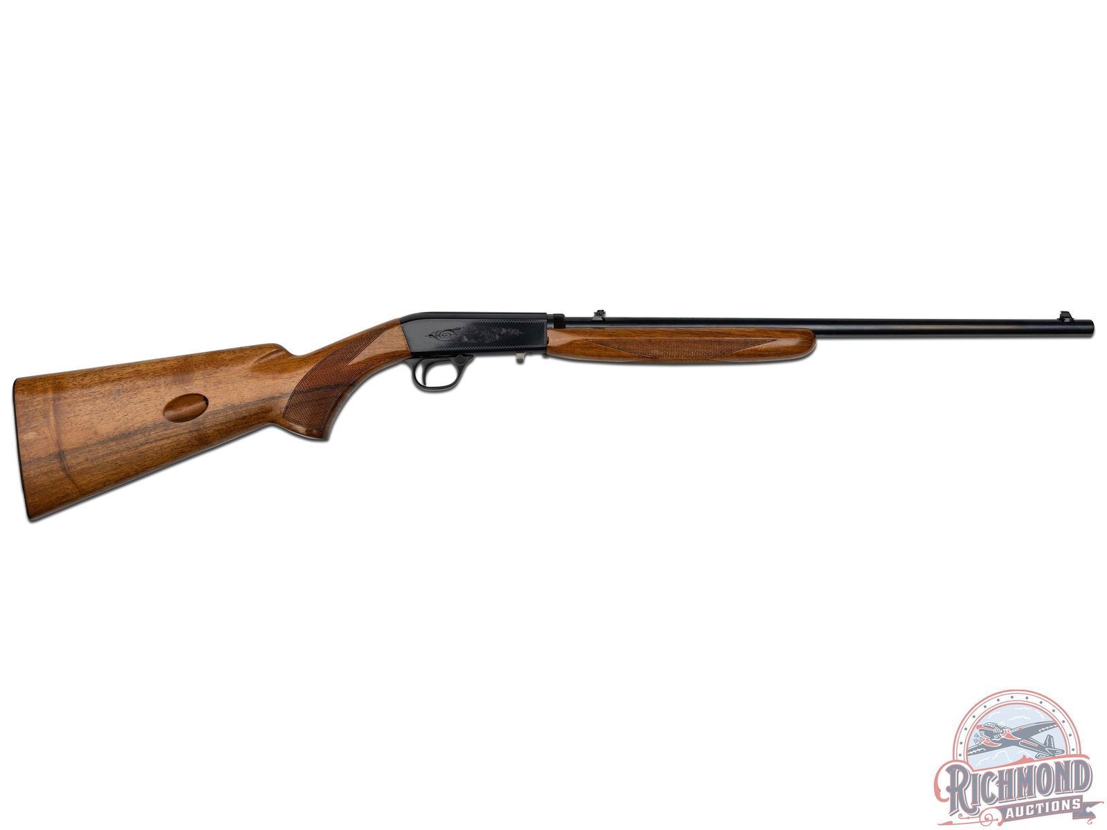 Manufactured in 1956 in Belgium by FN for Browning. Blued round 19-3/8" barrel with hunting sights and Browning logo on barrel. Blued floral engraved takedown receiver. Blued trigger with push button safety and tubular magazine. Walnut plain checkered stocks with blued serrated butt plate. This would be a difficult example to improve upon. CALIBER: 22 LR. S/N: 11442. FFL STATUS: Curio & Relic.