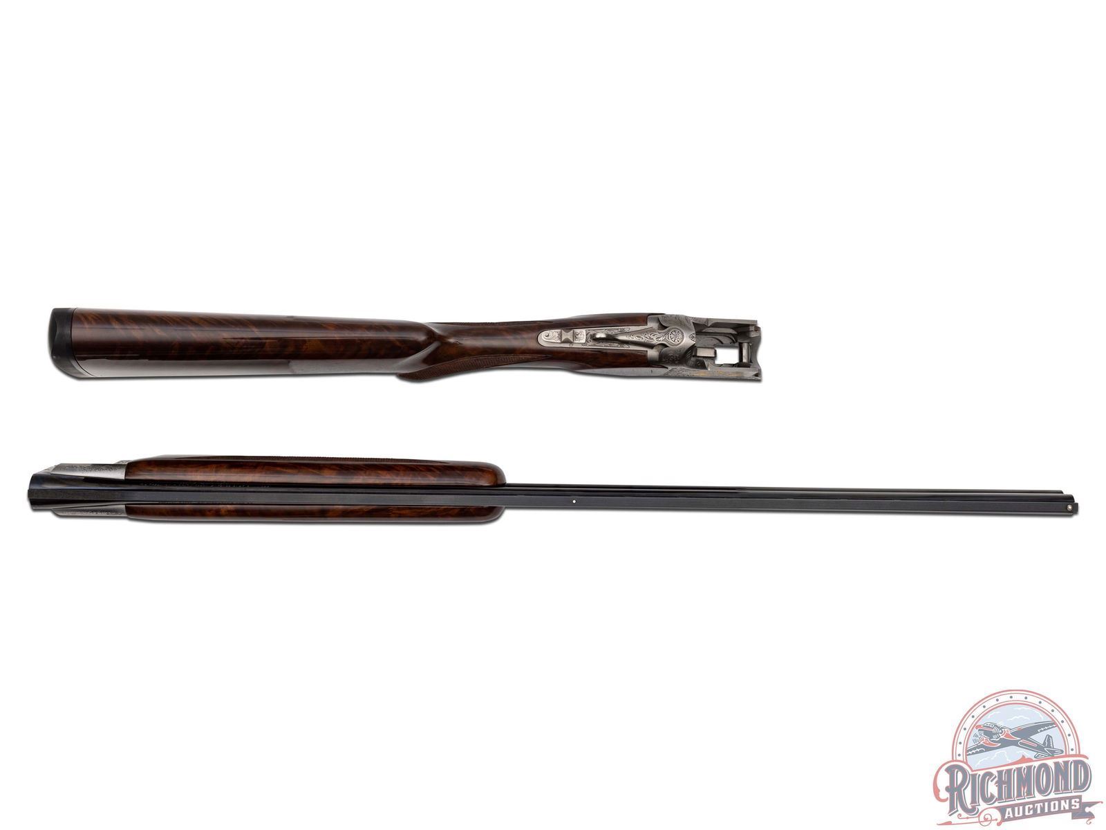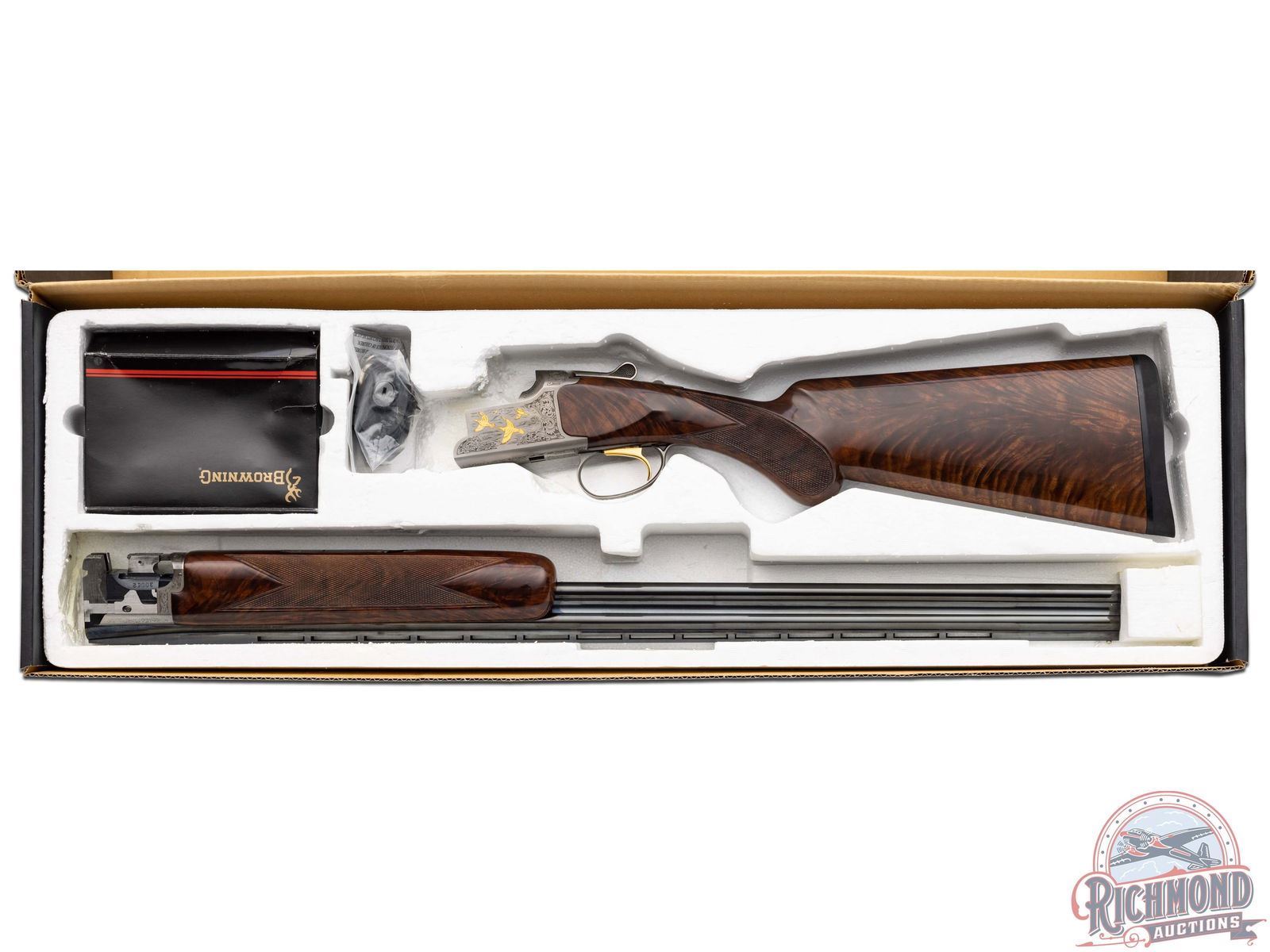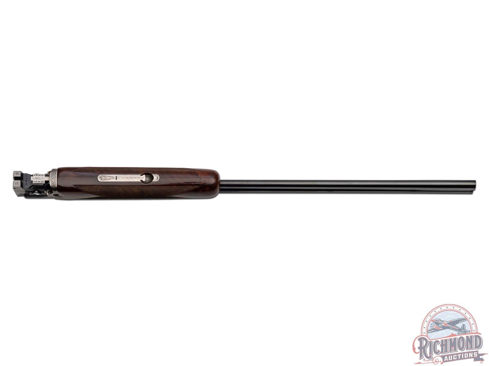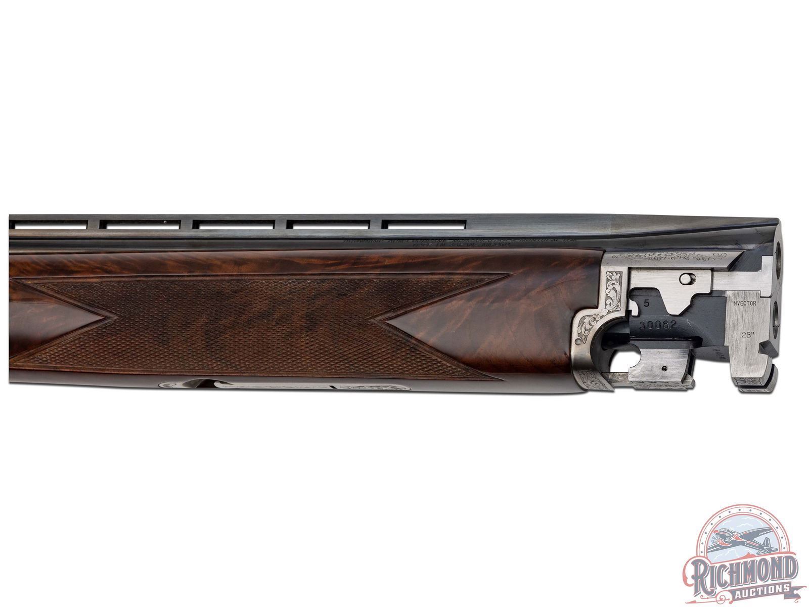Manufactured in 2000. O/U with standard markings on the barrel. Matching serials on the frame, barrel and forearm. 28" blued barrels with full vent rib barrels and steel bead front sight. Gold inlay grouse and quail on both sides of the frame. Portrait of two pointer dogs on the bottom of the frame. Fine walnut furniture with fine cut checkering on the forearm and pistol grip wrist. Factory black rubber butt plate. Gold washed single trigger. Tang safety/barrel selector. 3" chamber. Invector choke tubes with full, modified and improved cylinder tubes included. Includes lock, choke tube wrench, manual and serial matching box. LOP: 14". CALIBER: 410. S/N: 30062MM131. FFL STATUS: Modern.