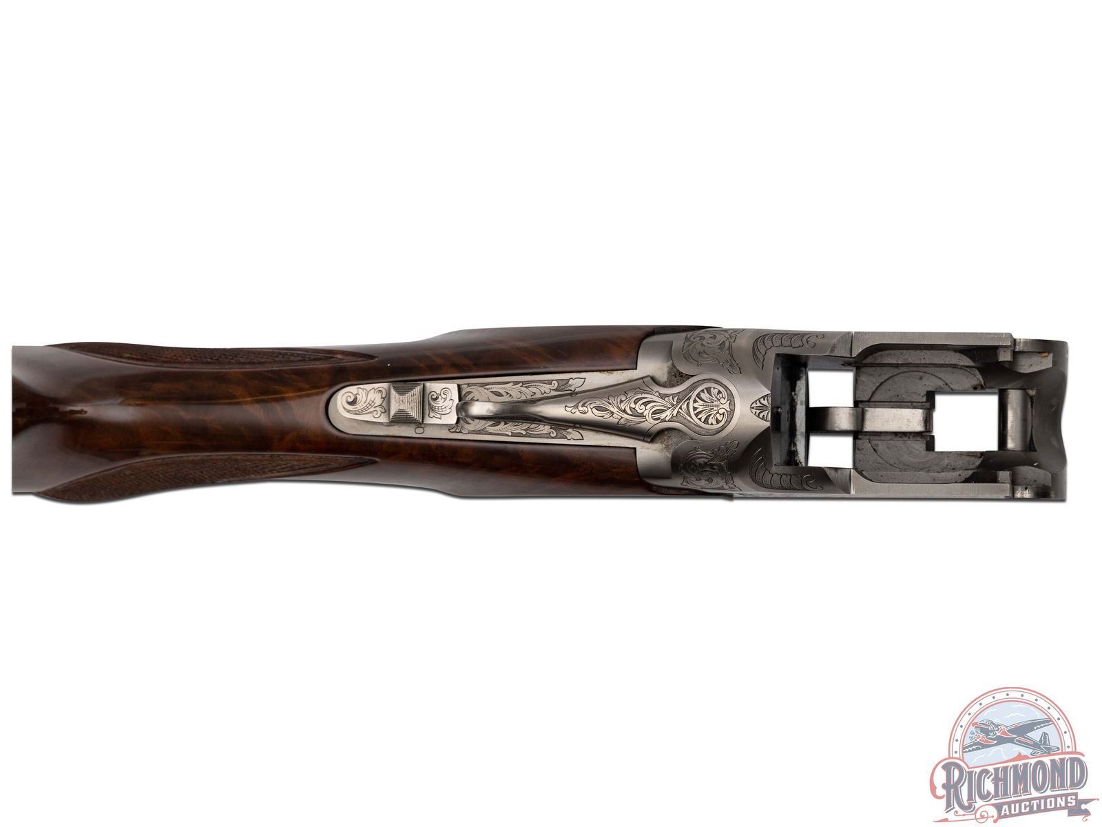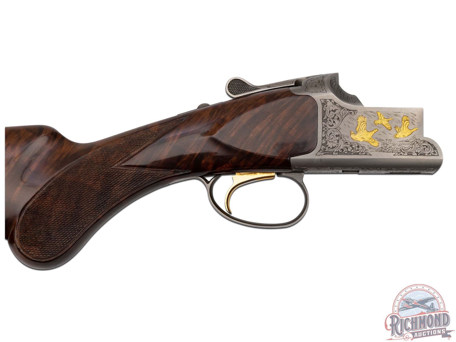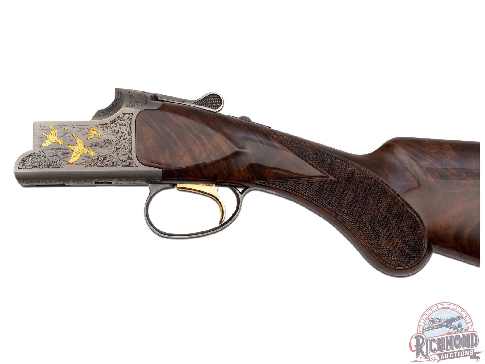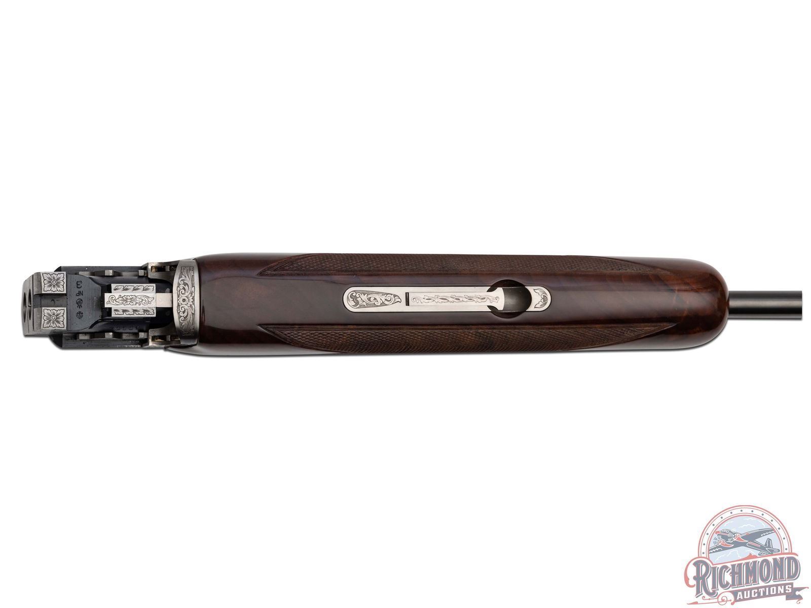 Manufactured in 2000. O/U with standard markings on the barrel. Matching serials on the frame, barrel and forearm. 28" blued barrels with full vent rib barrels and steel bead front sight. Gold inlay grouse and quail on both sides of the frame. Portrait of two pointer dogs on the bottom of the frame. Fine walnut furniture with fine cut checkering on the forearm and pistol grip wrist. Factory black rubber butt plate. Gold washed single trigger. Tang safety/barrel selector. 3" chamber. Invector choke tubes with full, modified and improved cylinder tubes included. Includes lock, choke tube wrench, manual and serial matching box. LOP: 14". CALIBER: 410. S/N: 30062MM131. FFL STATUS: Modern.
