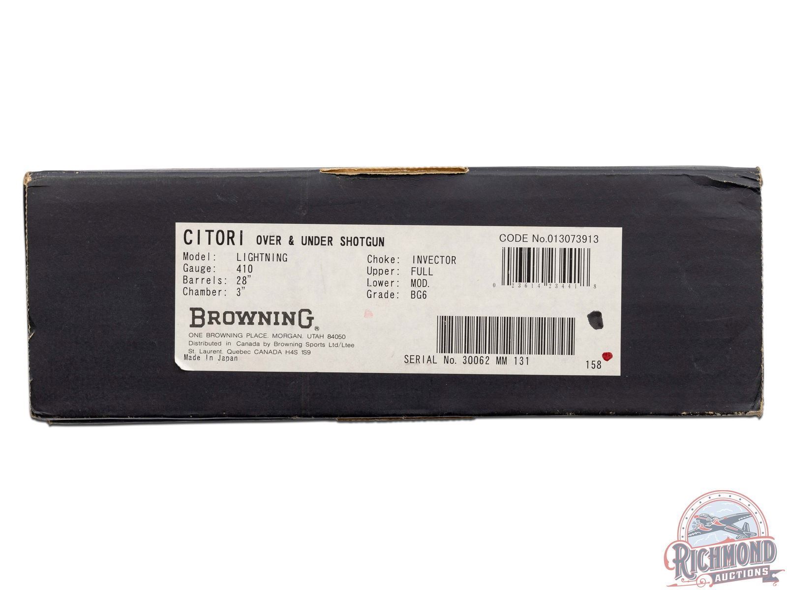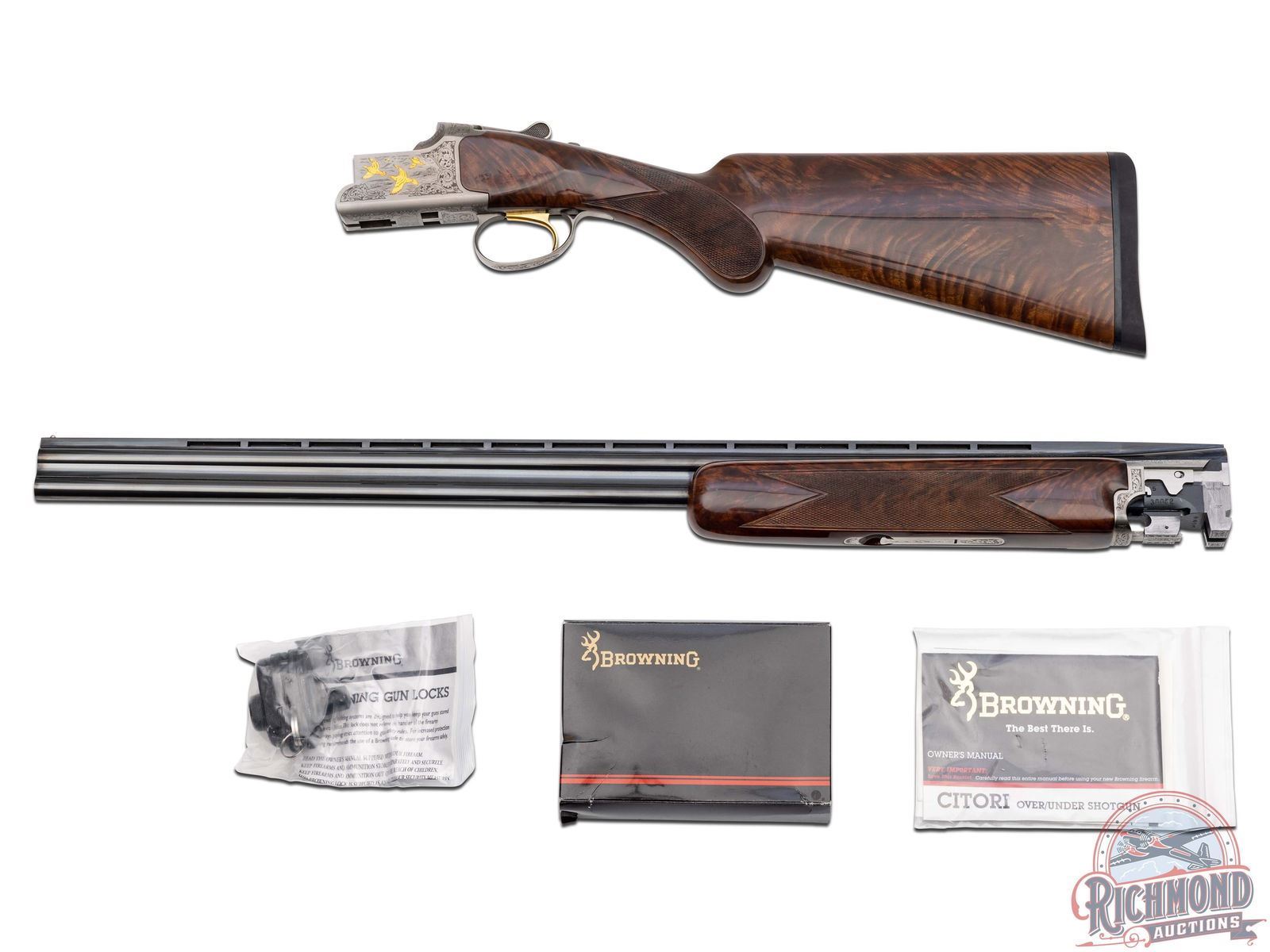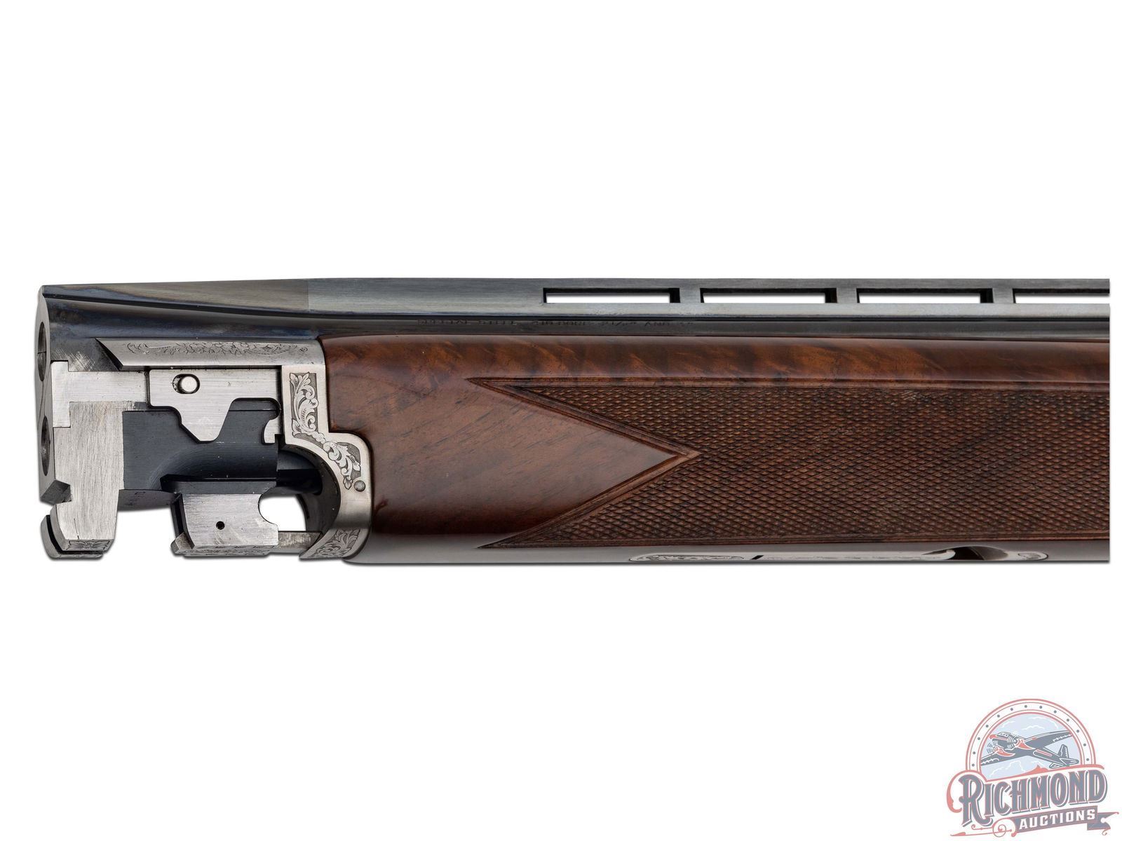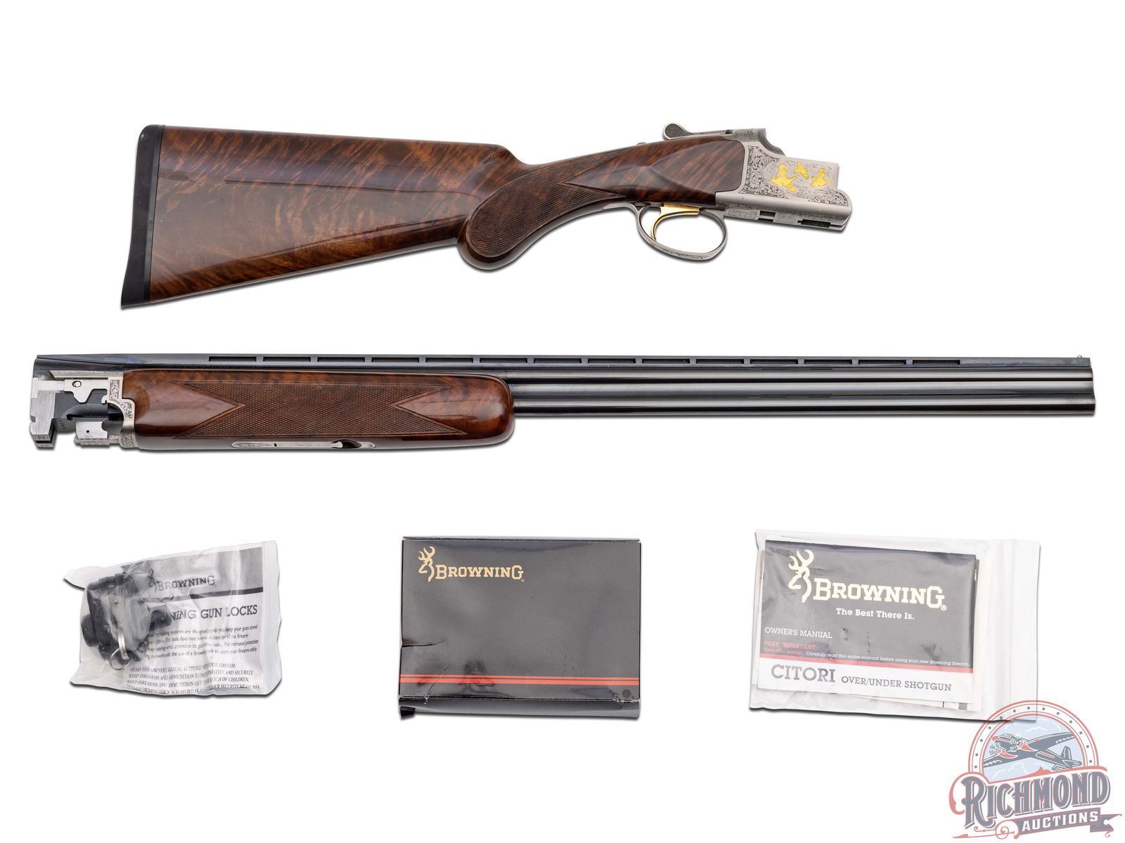 Manufactured in 2000. O/U with standard markings on the barrel. Matching serials on the frame, barrel and forearm. 28" blued barrels with full vent rib barrels and steel bead front sight. Gold inlay grouse and quail on both sides of the frame. Portrait of two pointer dogs on the bottom of the frame. Fine walnut furniture with fine cut checkering on the forearm and pistol grip wrist. Factory black rubber butt plate. Gold washed single trigger. Tang safety/barrel selector. 3" chamber. Invector choke tubes with full, modified and improved cylinder tubes included. Includes lock, choke tube wrench, manual and serial matching box. LOP: 14". CALIBER: 410. S/N: 30062MM131. FFL STATUS: Modern.