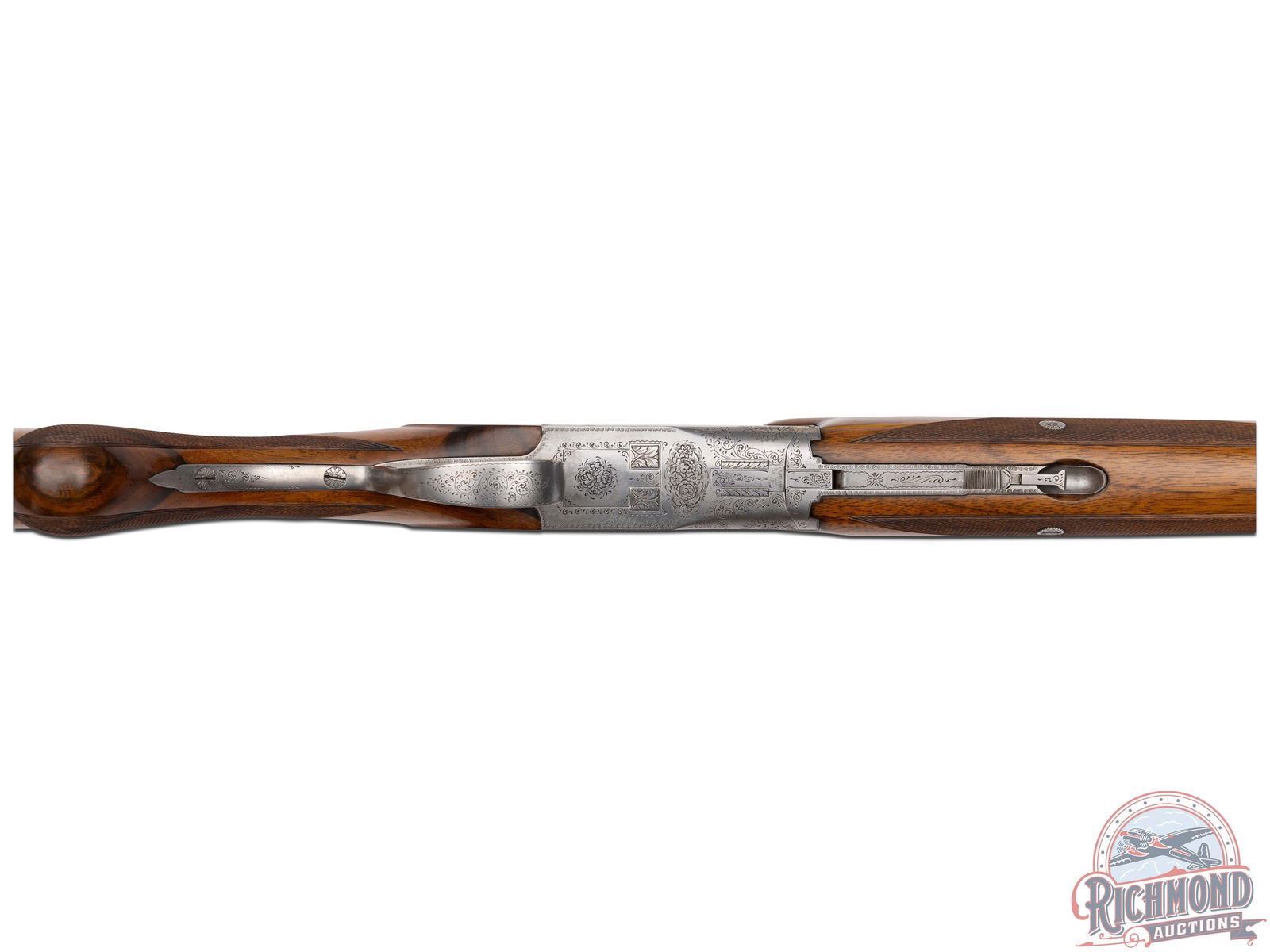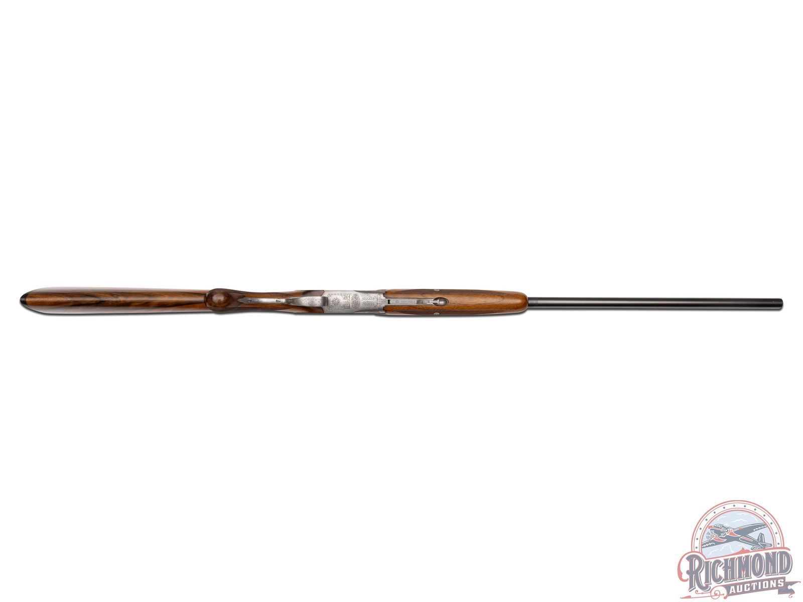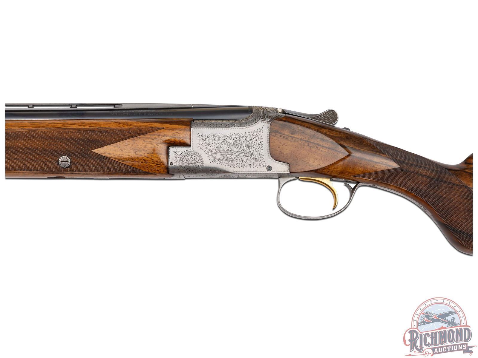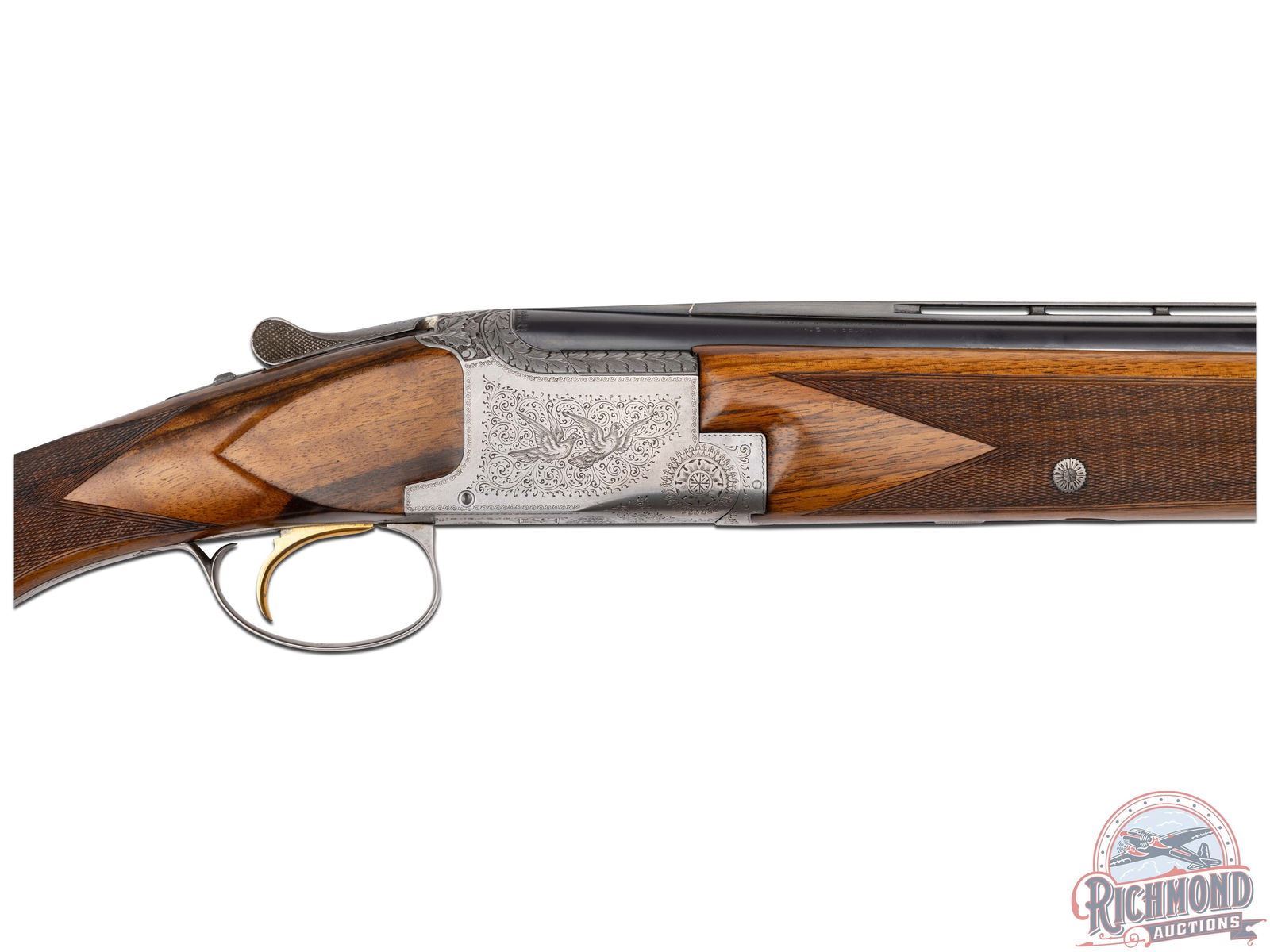 Made in Herstal, Belgium by Browning in 1959. Fitted with blued 28" Special Steel 20 gauge barrels with ventilated rib, twin bead sights, ejectors, 3" chambers, Browning St. Louis, Missouri address marking, and Skeet and Skeet chokes. Satin finish Pigeon Grade style engraved action with single gold washed selective trigger and top tang safety and barrel selector. Action is engraved with vignette engraving and flying Pigeon panel scenes. French walnut round knob long tang pistol grip stock with fine checkering and "Browning" hard rubber butt plate. Matching sporting style checkered attached forearm. Comes in tan Browning luggage case. LOP: 14-1/4". DAC: 1-1/2". DAH: 2-3/8". CALIBER: 20 GA. S/N: 14484. FFL STATUS: Curio & Relic.