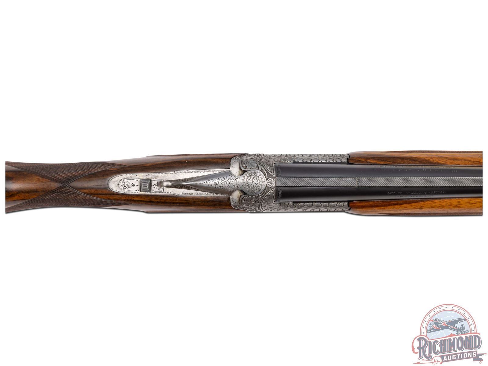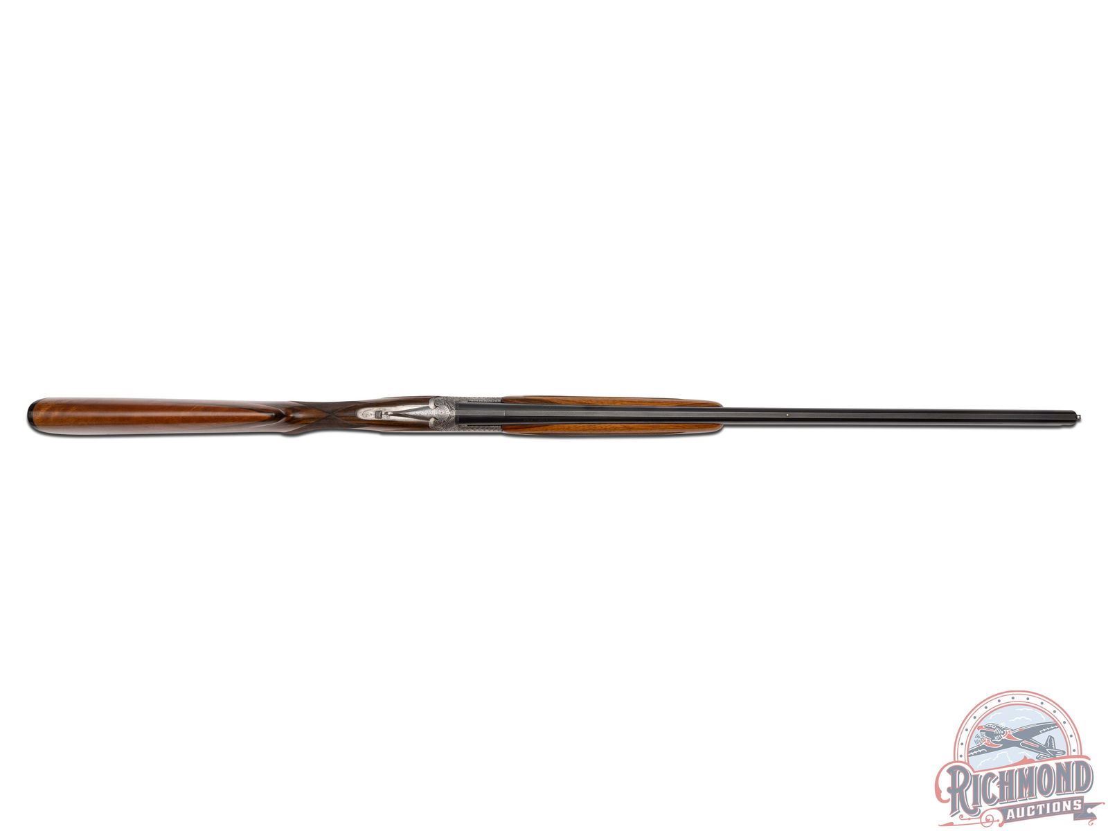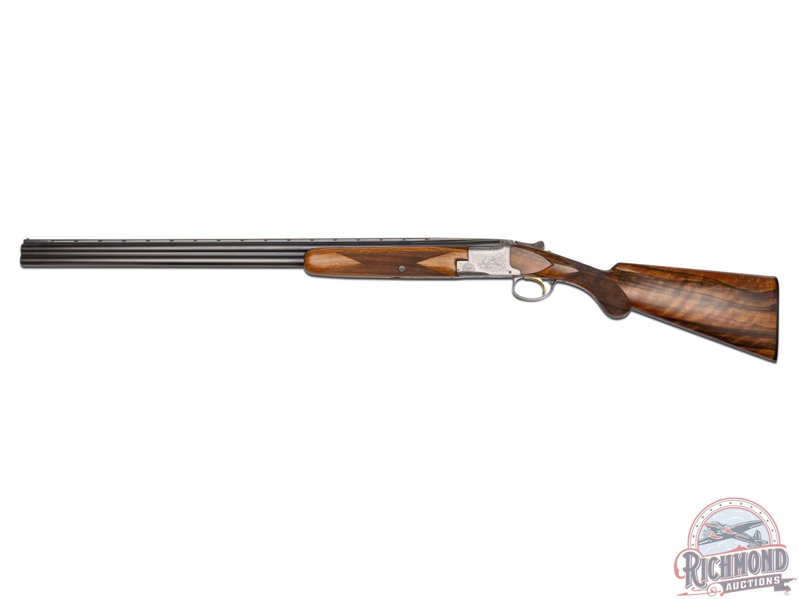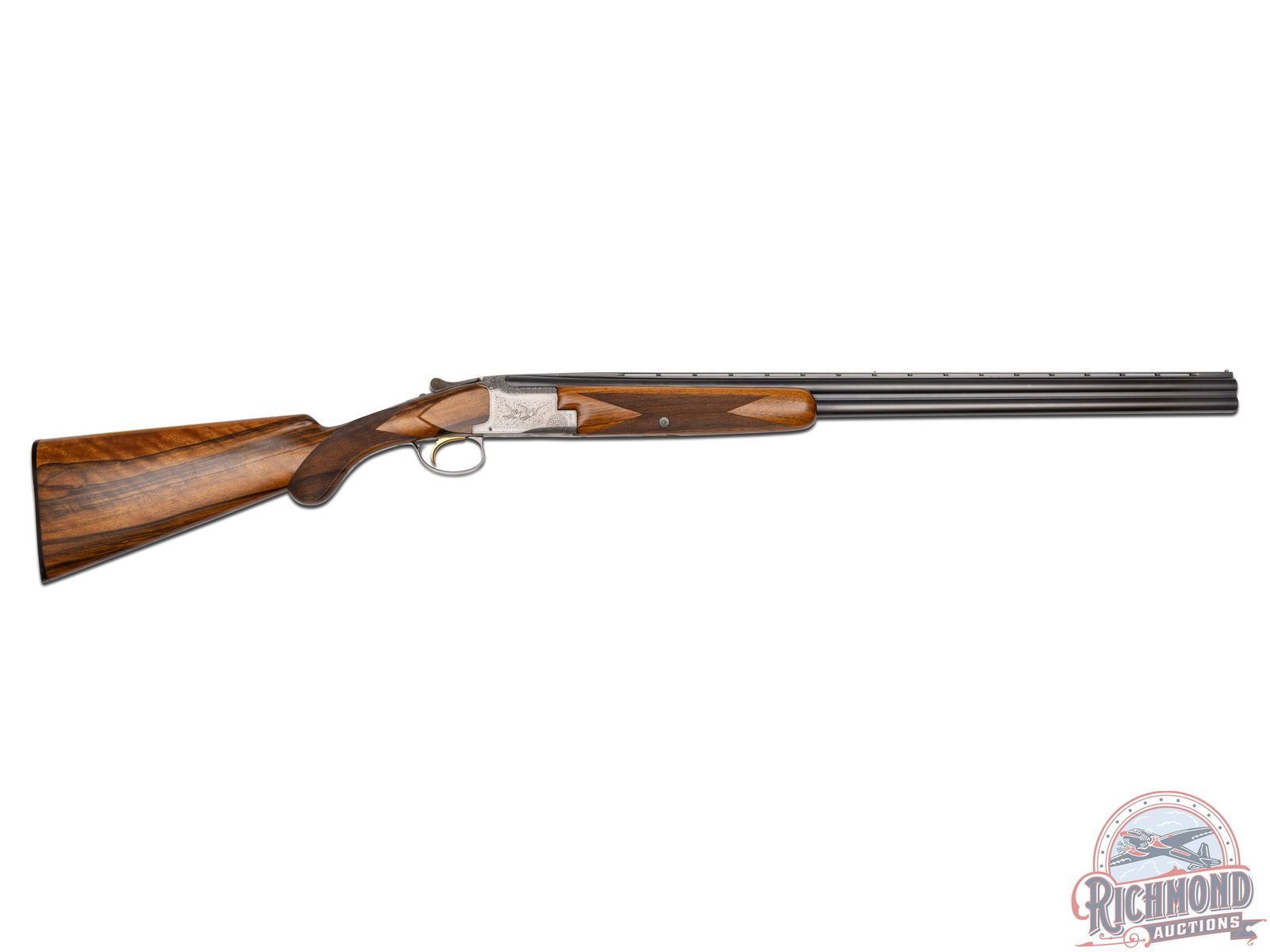 Made in Herstal, Belgium by Browning in 1959. Fitted with blued 28" Special Steel 20 gauge barrels with ventilated rib, twin bead sights, ejectors, 3" chambers, Browning St. Louis, Missouri address marking, and Skeet and Skeet chokes. Satin finish Pigeon Grade style engraved action with single gold washed selective trigger and top tang safety and barrel selector. Action is engraved with vignette engraving and flying Pigeon panel scenes. French walnut round knob long tang pistol grip stock with fine checkering and "Browning" hard rubber butt plate. Matching sporting style checkered attached forearm. Comes in tan Browning luggage case. LOP: 14-1/4". DAC: 1-1/2". DAH: 2-3/8". CALIBER: 20 GA. S/N: 14484. FFL STATUS: Curio & Relic.