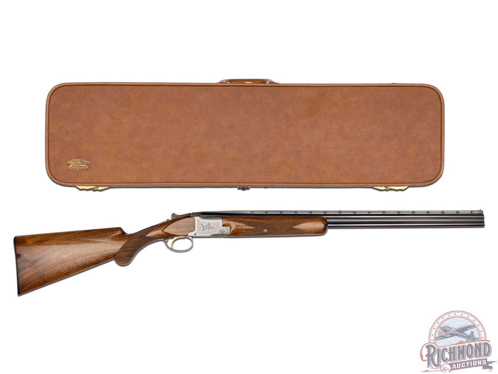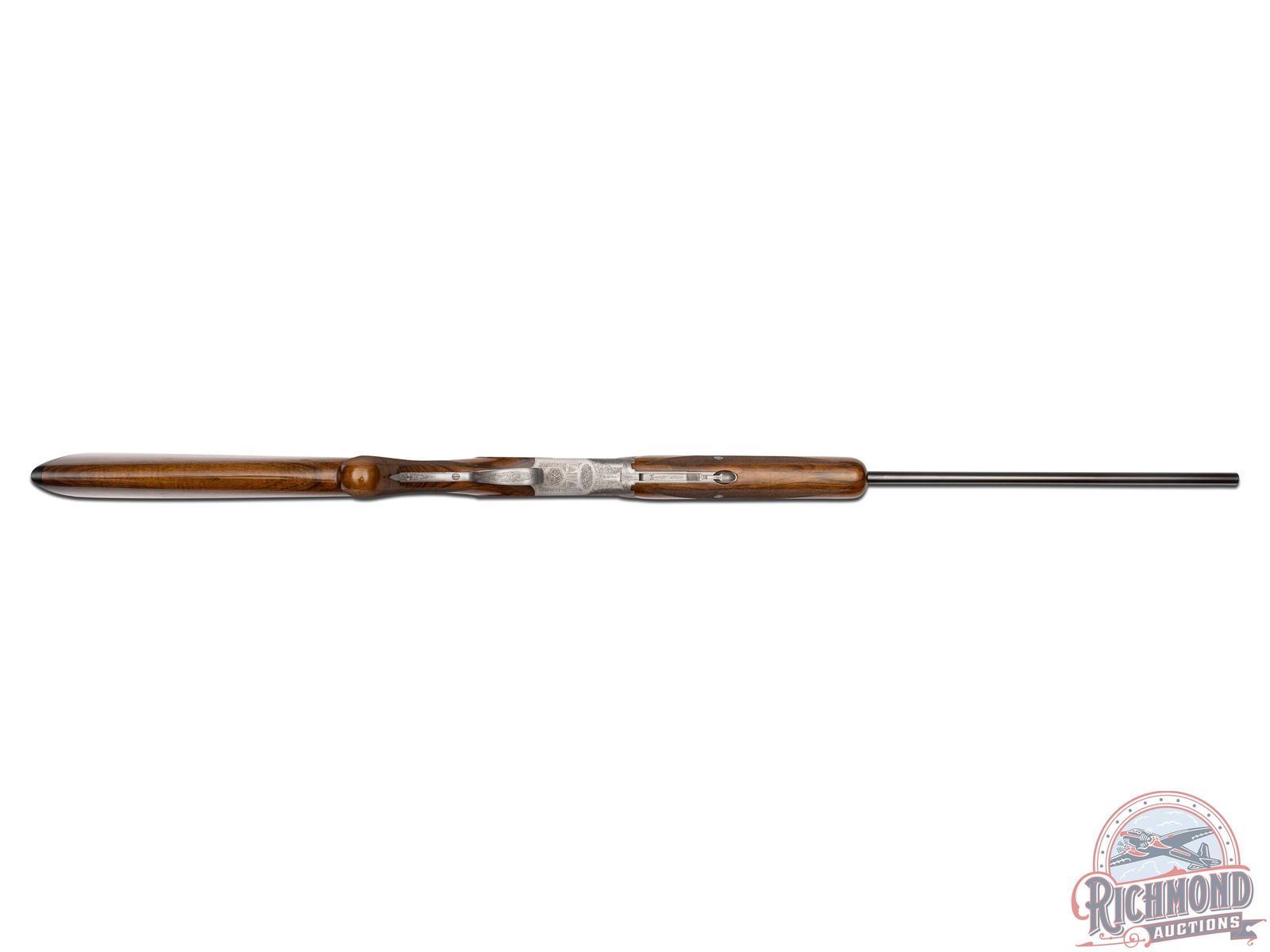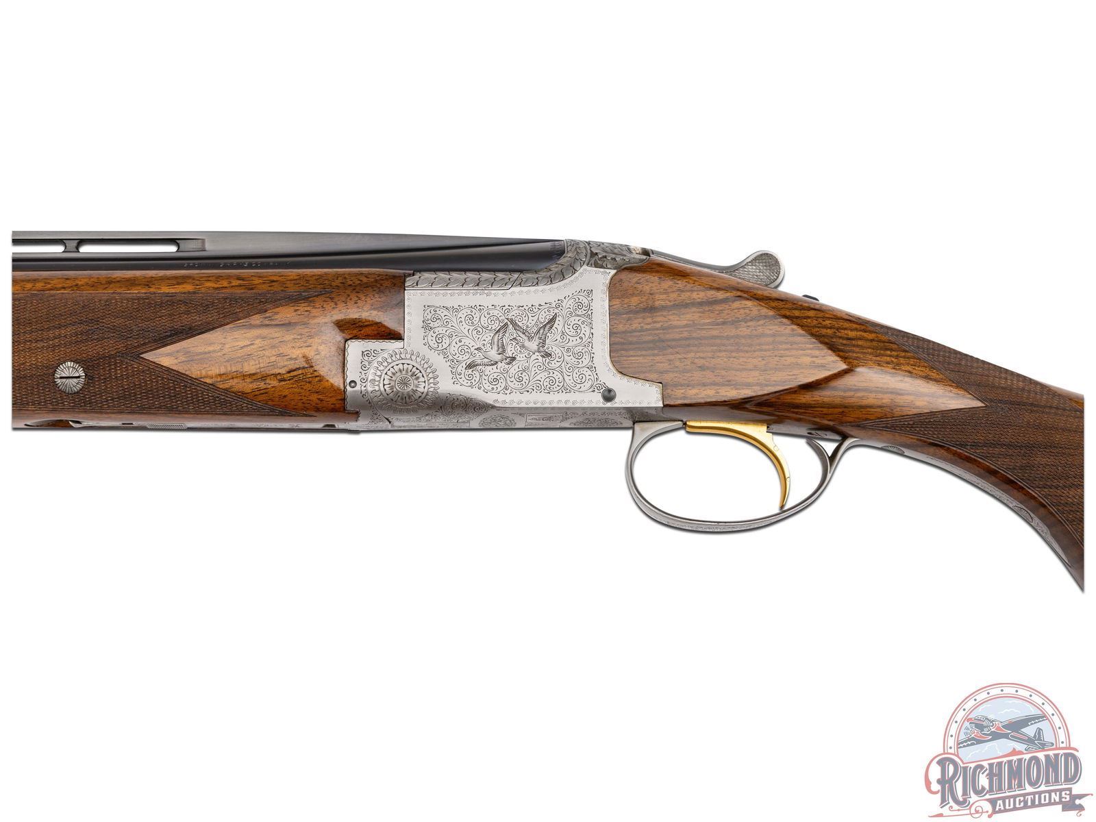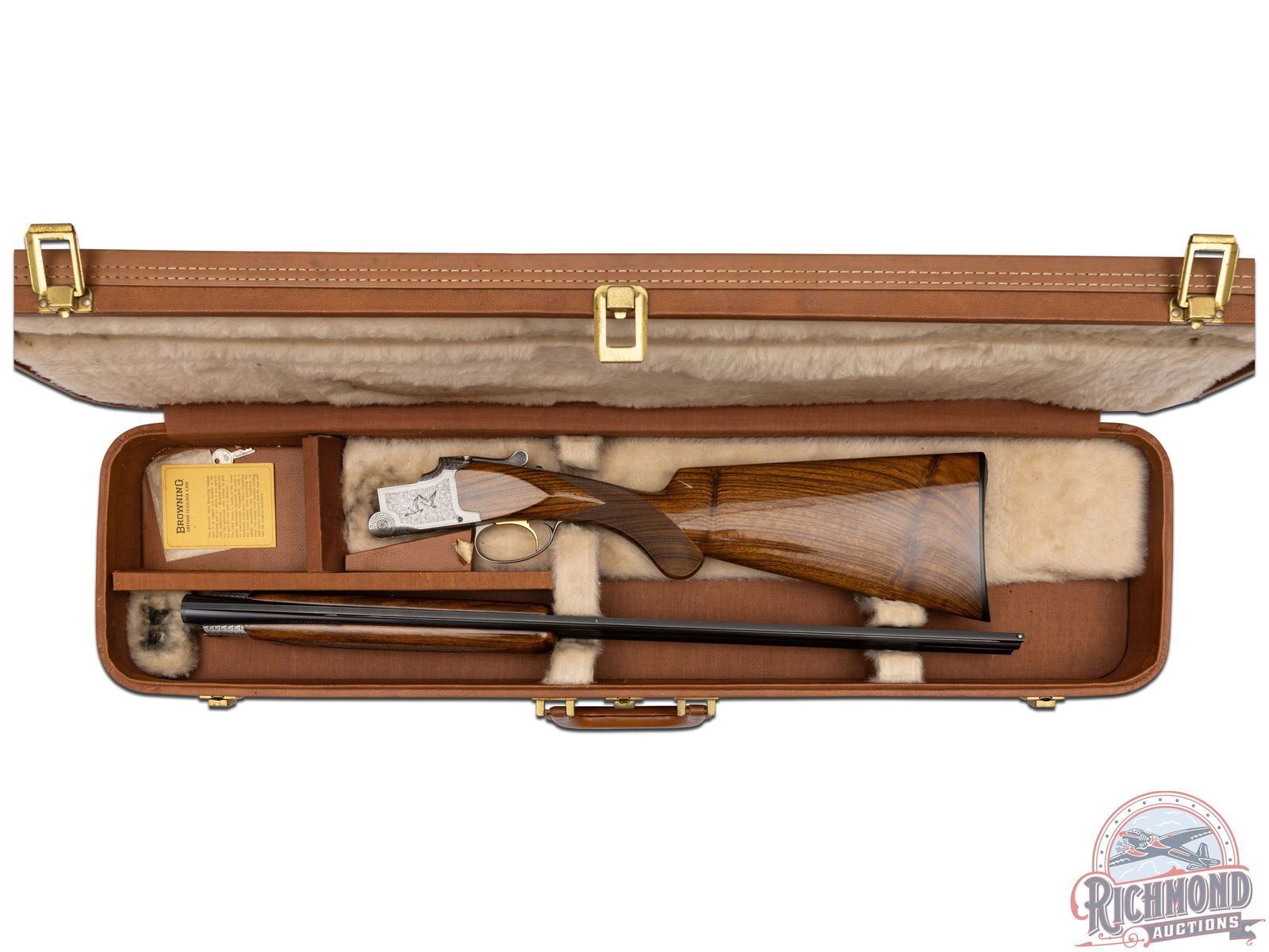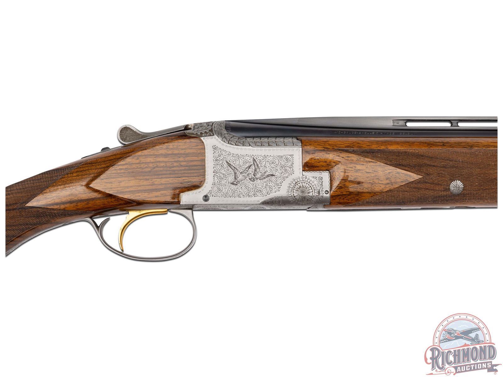Made in Herstal, Belgium by Browning in 1965. 26-3/8" blued Special Steel barrels with ventilated rib, bead front sight, ejectors, 3" chambers, Browning Arms Company marking, and both chokes are improved cylinder. Satin finish Pigeon Grade style engraved action with single gold washed selective trigger with top tang safety and barrel selector. Action is engraved with vignette engraving and flying pigeon panel scenes. Light tone French walnut round knob long tang pistol grip stock with 22 lines per inch checkering and "Browning" hard rubber butt plate. Matching sporting style checkered attached forearm. Comes in tan Browning luggage case. LOP: 14-1/4". DAC: 1-1/2". DAH: 2-3/8". CALIBER: 410. S/N: 1108J5. FFL STATUS: Curio & Relic.