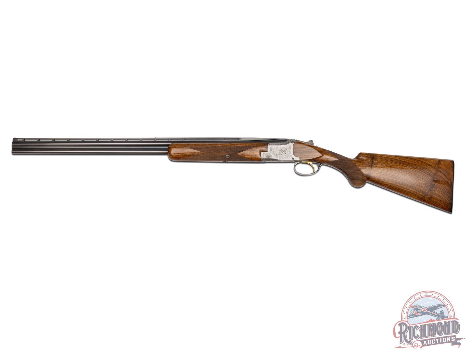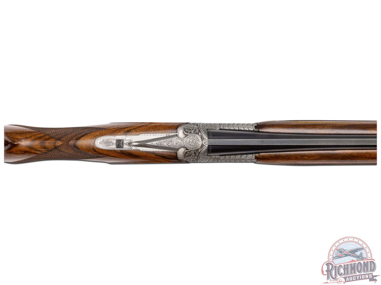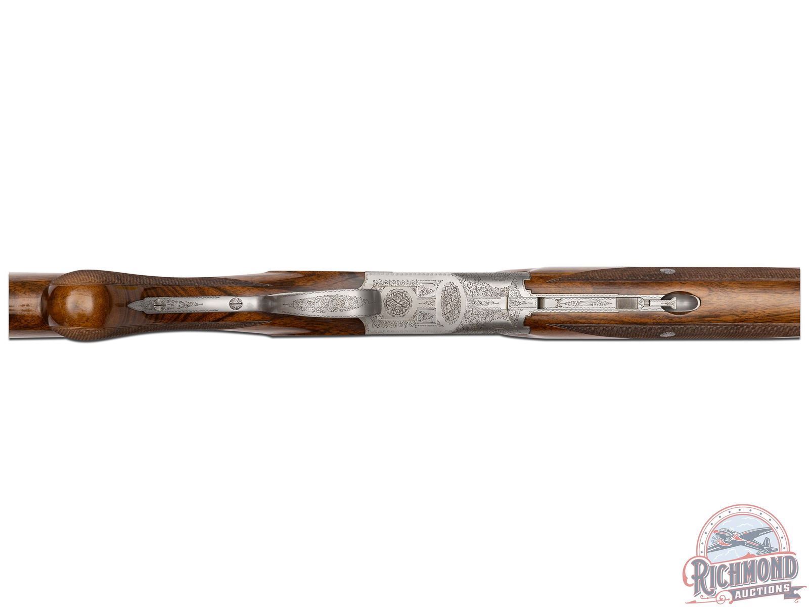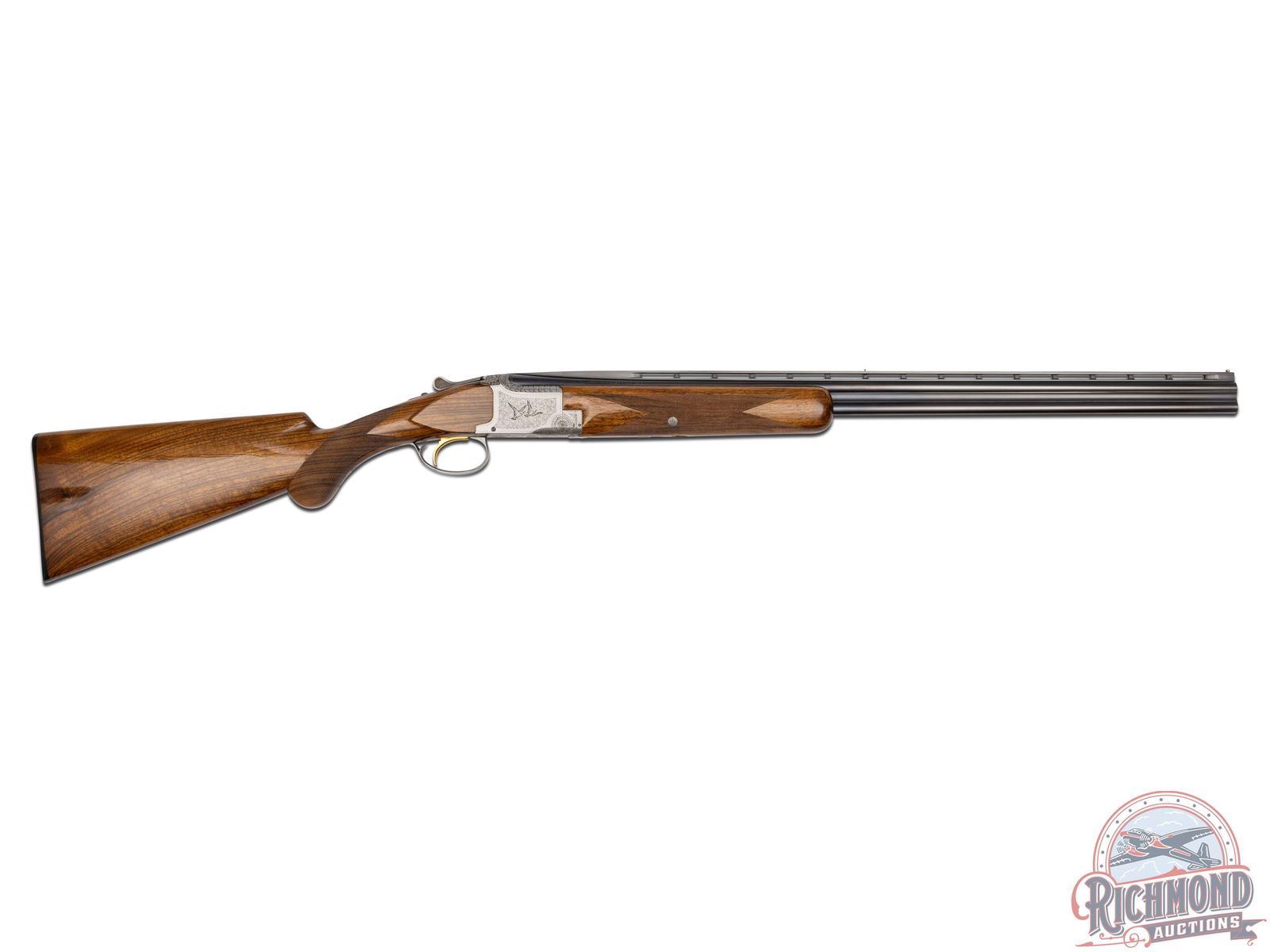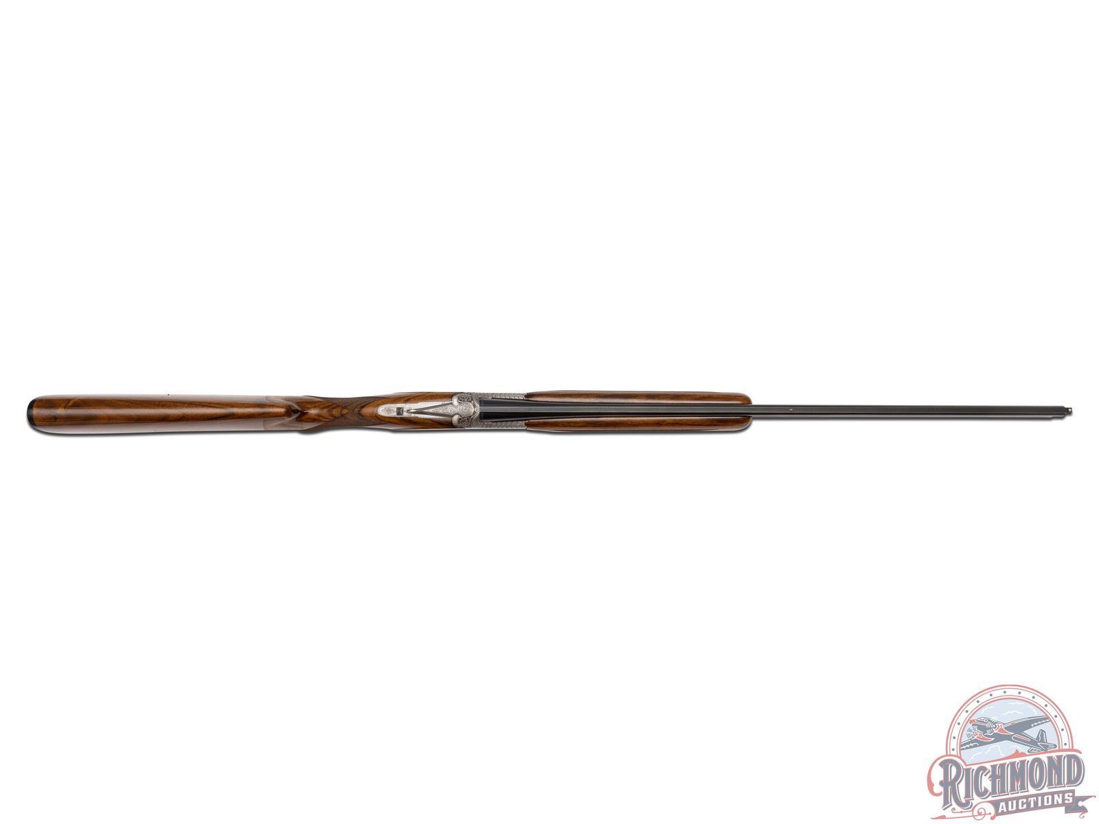 Made in Herstal, Belgium by Browning in 1965. 26-3/8" blued Special Steel barrels with ventilated rib, bead front sight, ejectors, 3" chambers, Browning Arms Company marking, and both chokes are improved cylinder. Satin finish Pigeon Grade style engraved action with single gold washed selective trigger with top tang safety and barrel selector. Action is engraved with vignette engraving and flying pigeon panel scenes. Light tone French walnut round knob long tang pistol grip stock with 22 lines per inch checkering and "Browning" hard rubber butt plate. Matching sporting style checkered attached forearm. Comes in tan Browning luggage case. LOP: 14-1/4". DAC: 1-1/2". DAH: 2-3/8". CALIBER: 410. S/N: 1108J5. FFL STATUS: Curio & Relic.