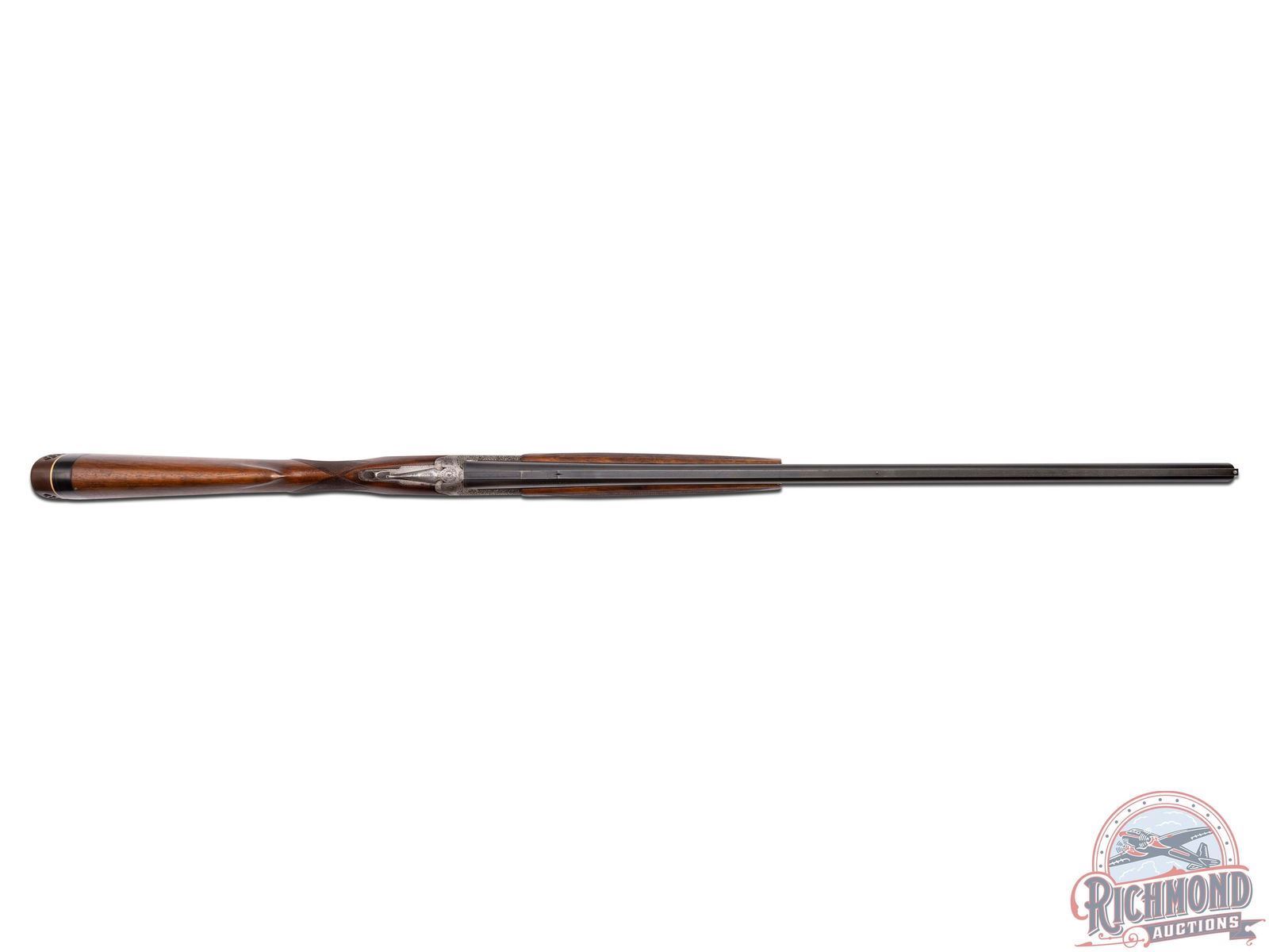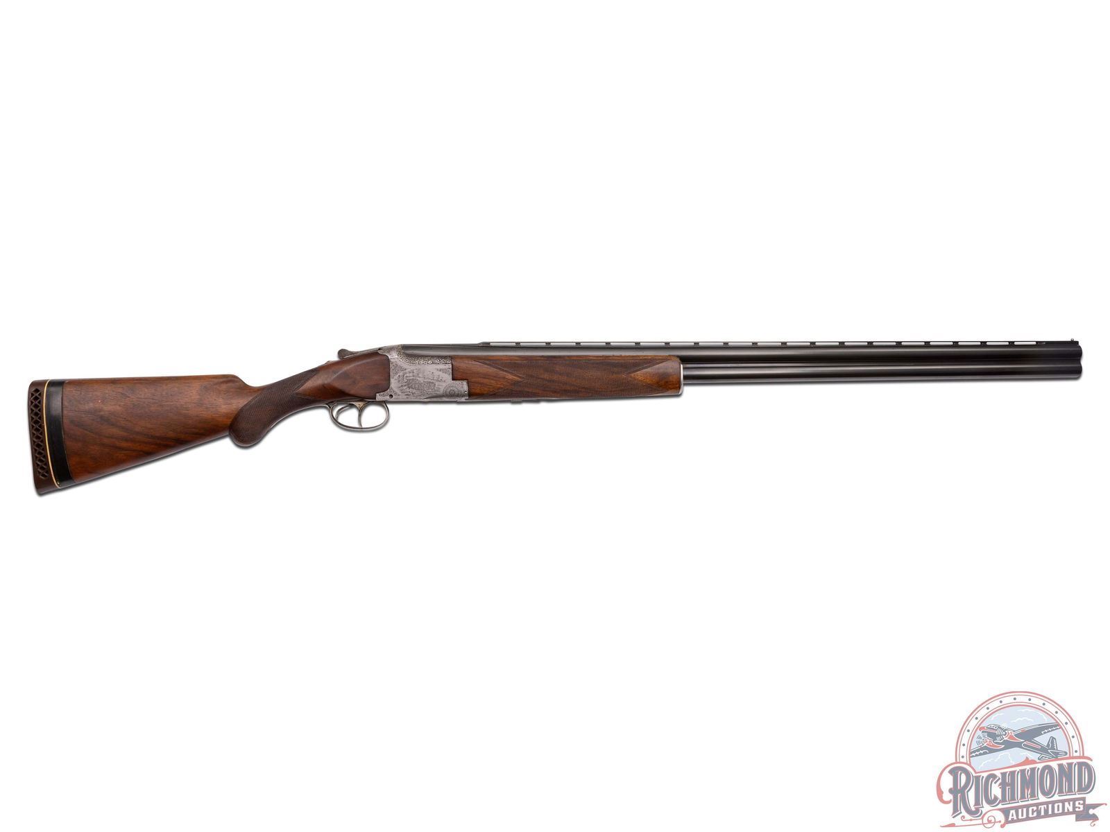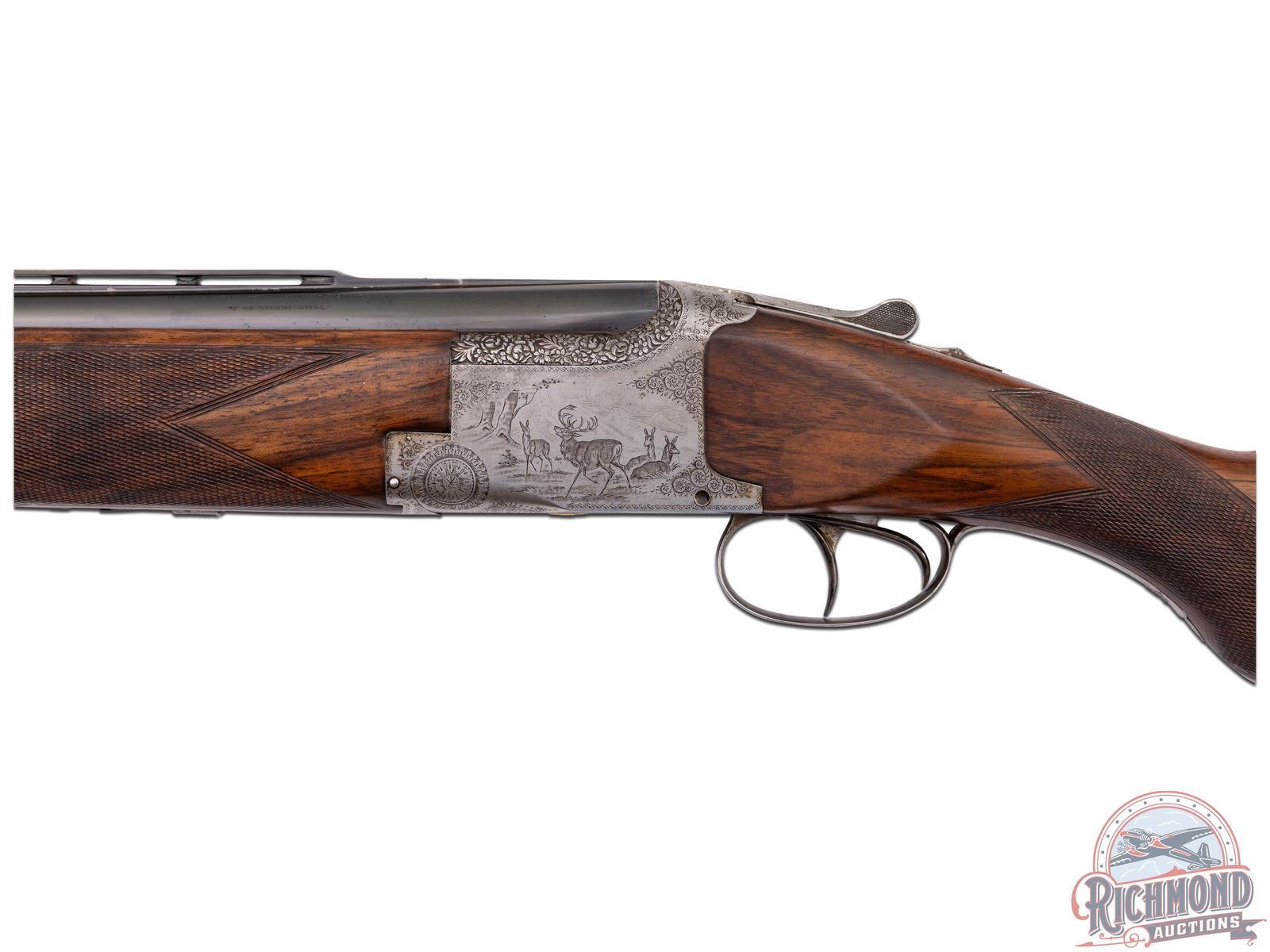 Made in Belgium by Browning in 1933. These Pre-World II guns are hard to find, especially in high grades. 32" blued Special Steel 12 gauge barrels with stepped ventilated rib ejectors with 2-3/4" chambers and full and full chokes. Rib is fitted with bead front sight and bead mid sight with barrel marked with Gauge and Browning, St. Louis, Missouri address and Browning Patents. Satin finish boxlock action with double triggers and non-automatic safety with "S" in gold. Action is engraved with standard Diana or C-2 Grade boar scene on right and hirsch on left. Bottom is vignette engraved with three gold quail. This is considered a factory special order as gold is not listed as an option. Breeches have the usual chiseled floral pattern. Walnut checkered round knob, pistol grip, long tang stock, with added spacer and Pachmayr pad. Matching walnut checkered latch release attached forearm with horseshoe plate. LOP: 14". DAC: 1-1/2". DAH: 1-3/4". CALIBER: 12 GA. S/N: 5149. FFL STATUS: Curio & Relic.