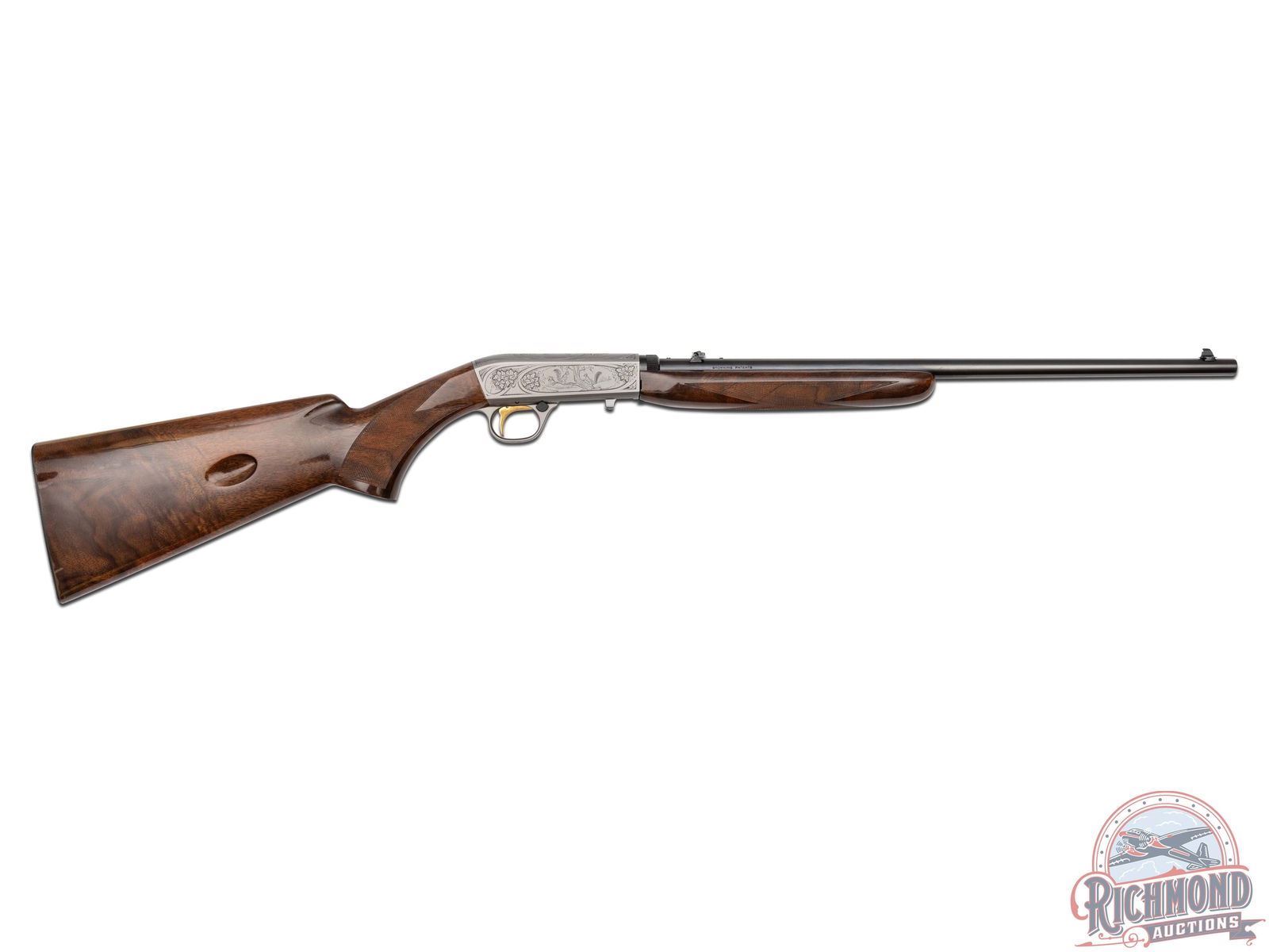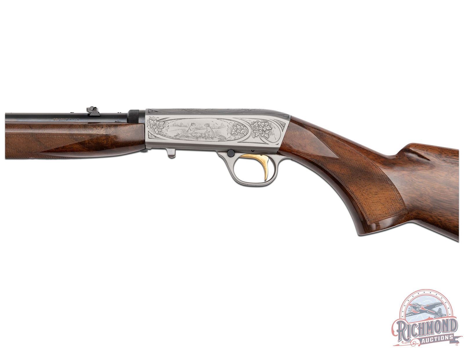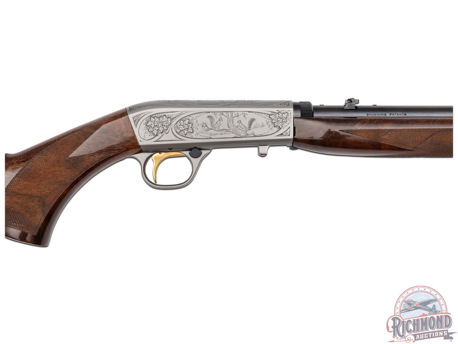 Manufactured in 1970 by FN in Belgium. Features a 19-1/4" blued round barrel stamped with single line Browning address highlighted in gold tone. Flip-up rear notch adjustable sight and blade with brass bead front sight. Coin finished receiver features Master Engraver Angelo Bee signed work. Left side features two groundhogs in a field in an oval border with grape leaf design and signed "A.BEE". Top of the receiver features a duck centered of a grape leaf design. Right side features two squirrels on a tree limb in an oval border with grape leaf design. Bottom of the trigger guard engraved with the same grape leaf design. Gold washed trigger and crossbolt safety. Grade II walnut high gloss stock and forearm with hand-checkered pistol grip and base of forearm. Comes in the original factory take-down case. CALIBER: 22 LR. S/N: 70T46470. FFL STATUS: Curio & Relic.
