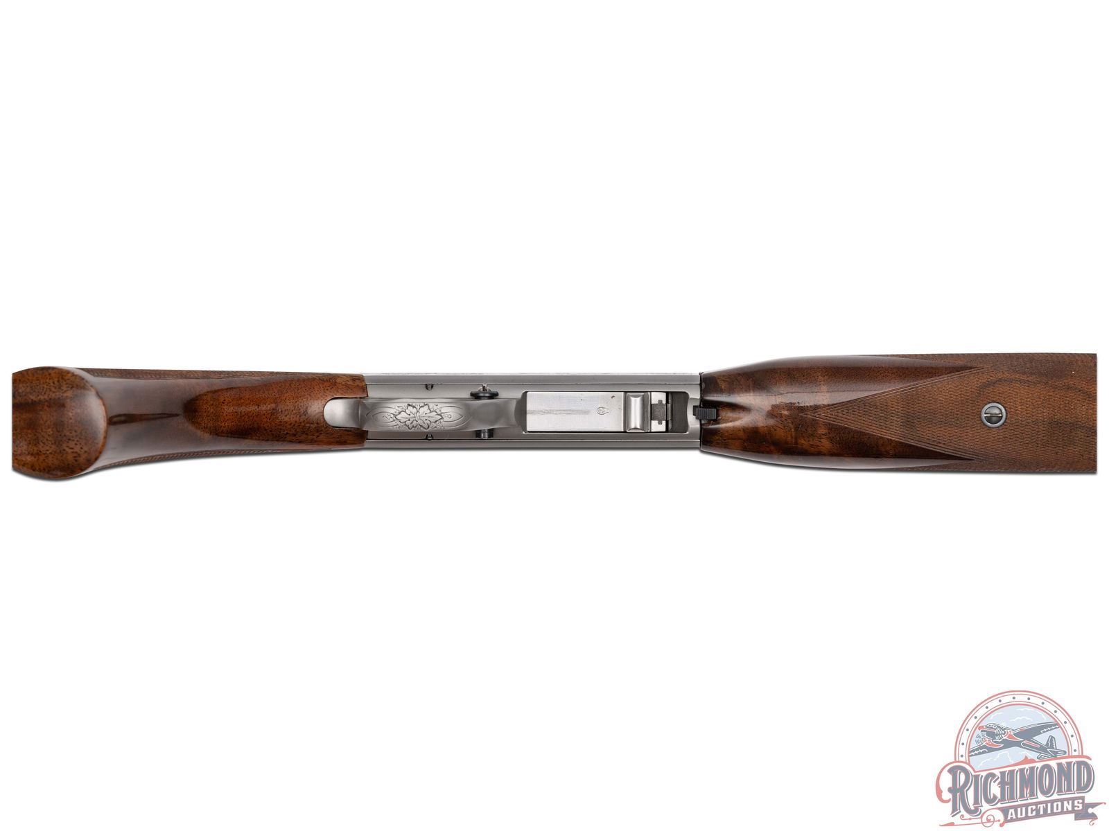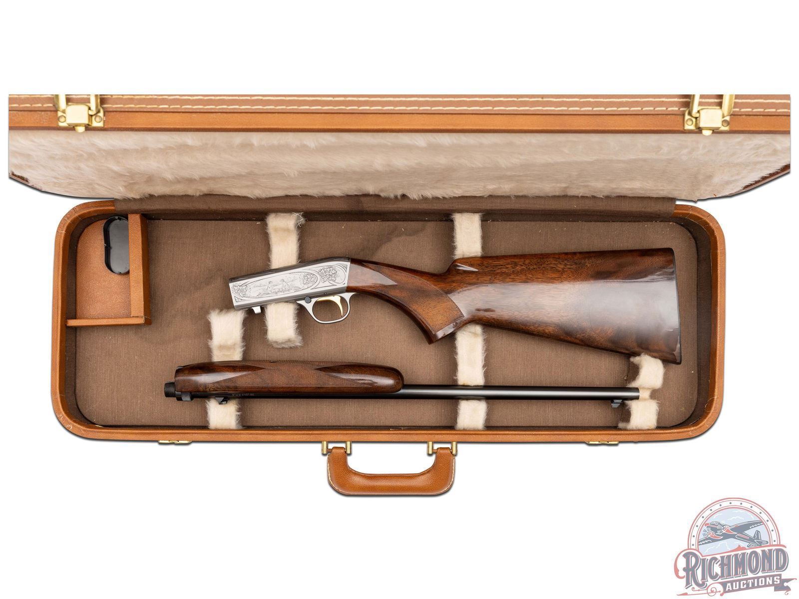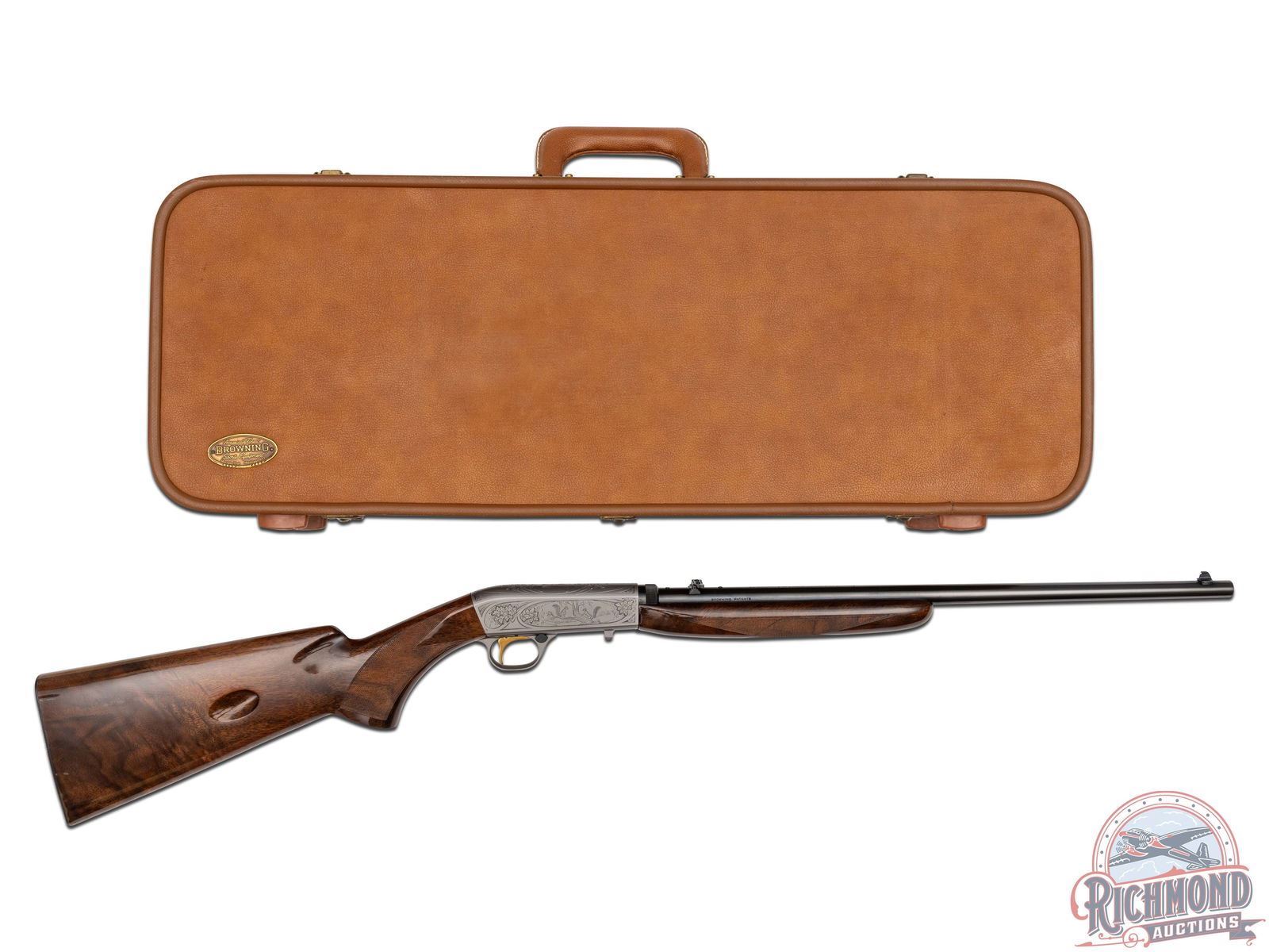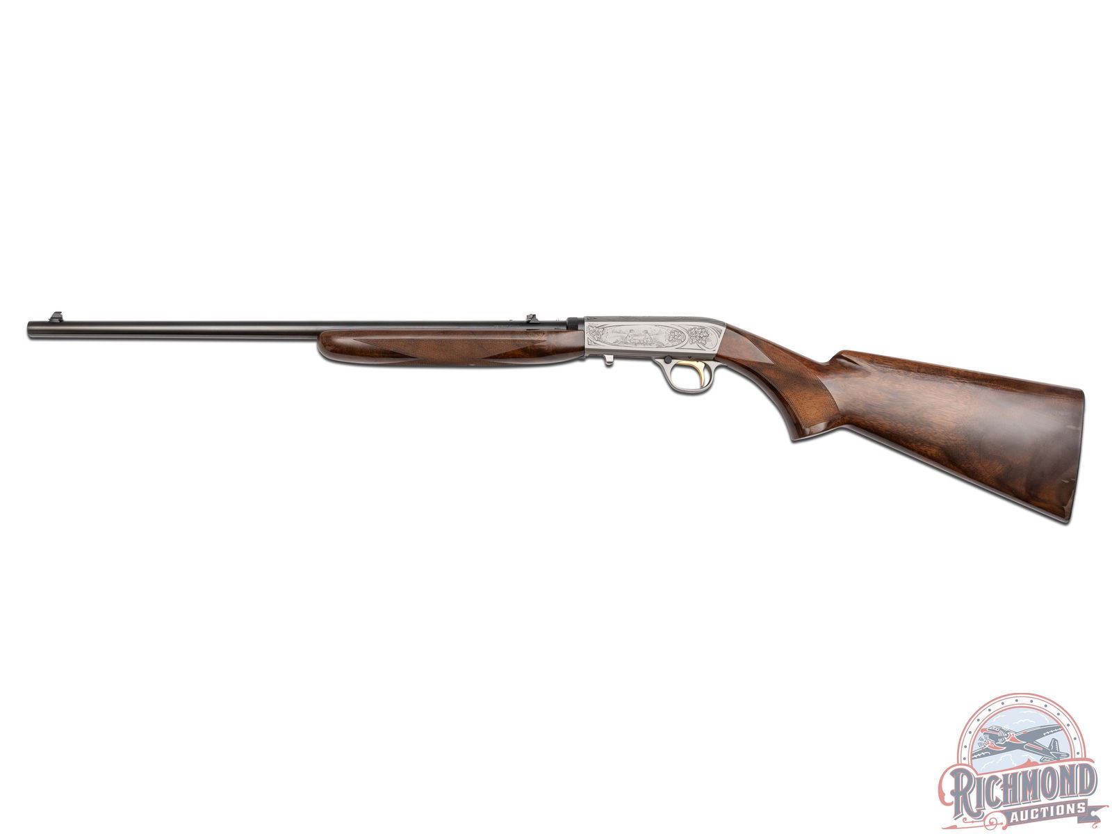 Manufactured in 1970 by FN in Belgium. Features a 19-1/4" blued round barrel stamped with single line Browning address highlighted in gold tone. Flip-up rear notch adjustable sight and blade with brass bead front sight. Coin finished receiver features Master Engraver Angelo Bee signed work. Left side features two groundhogs in a field in an oval border with grape leaf design and signed "A.BEE". Top of the receiver features a duck centered of a grape leaf design. Right side features two squirrels on a tree limb in an oval border with grape leaf design. Bottom of the trigger guard engraved with the same grape leaf design. Gold washed trigger and crossbolt safety. Grade II walnut high gloss stock and forearm with hand-checkered pistol grip and base of forearm. Comes in the original factory take-down case. CALIBER: 22 LR. S/N: 70T46470. FFL STATUS: Curio & Relic.