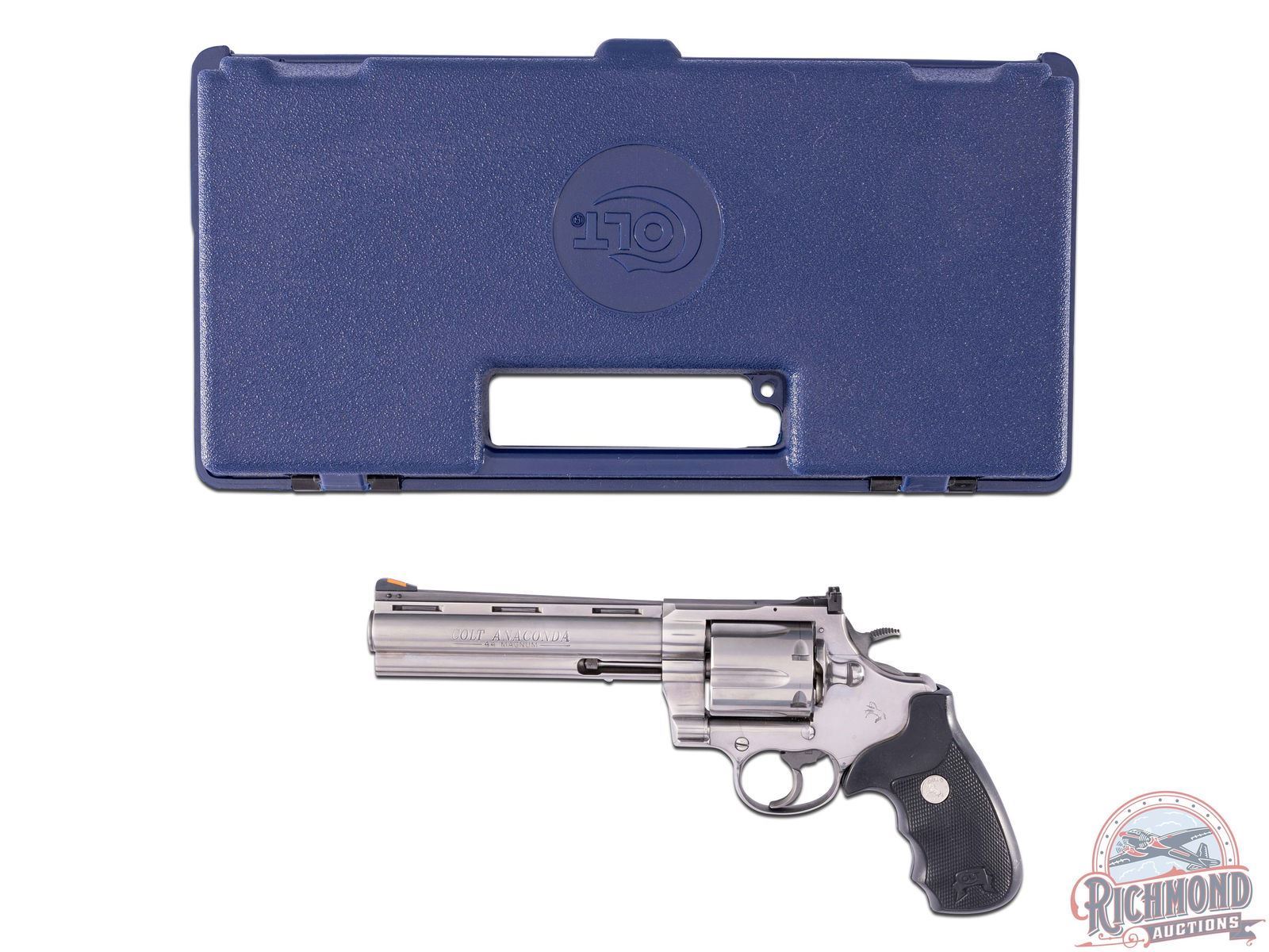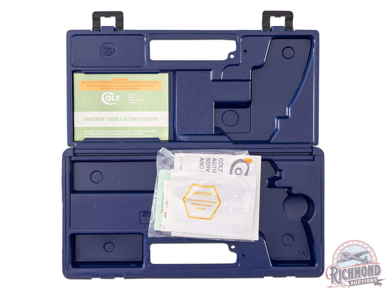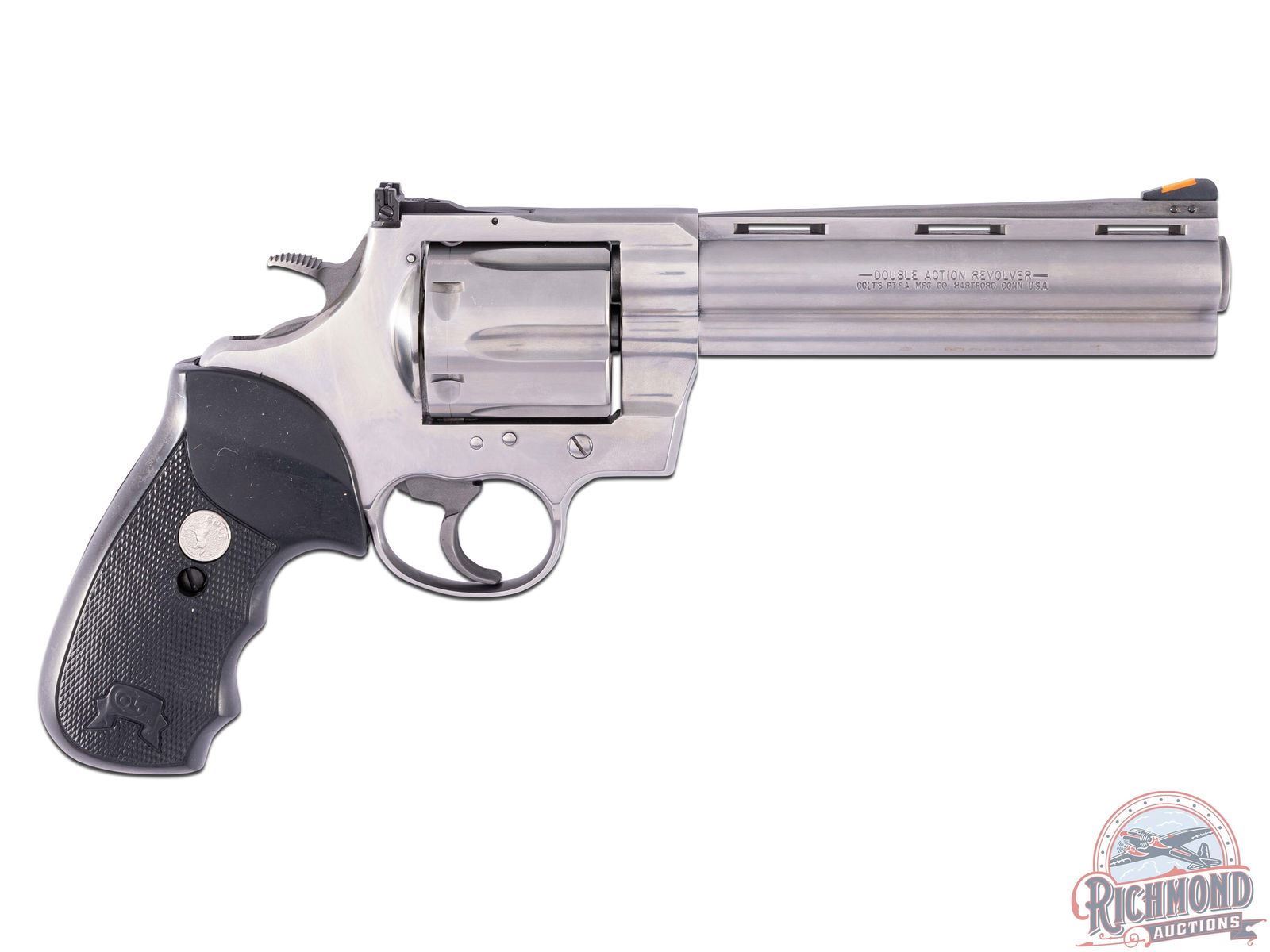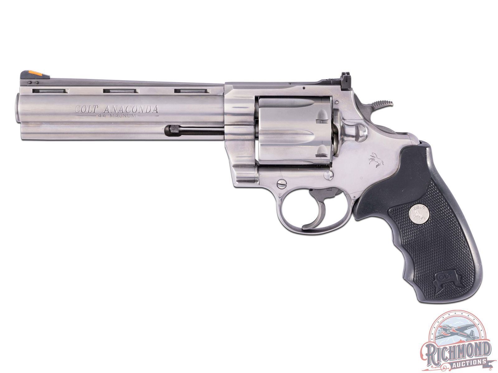 Manufactured in 1995. This powerful snake gun features a 6" ventilated rib barrel with full length ejector shroud. Rear white outlined adjustable notch sight and orange highlighted front ramp. Left side of the barrel is stamped "COLT ANACONDA / - 44 MAGNUM -". Left side of the frame is stamped with the Rampant Colt logo. Polished stainless steel finish. Six round fluted, swing-out cylinder chambered for 44 Magnum cartridges. Fitted with factory Colt checkered, finger grooved rubber grips with silver tone Colt medallions. Includes original Colt factory hard case and factory paperwork. CALIBER: 44 MAG. S/N: MM80499. FFL STATUS: Modern.