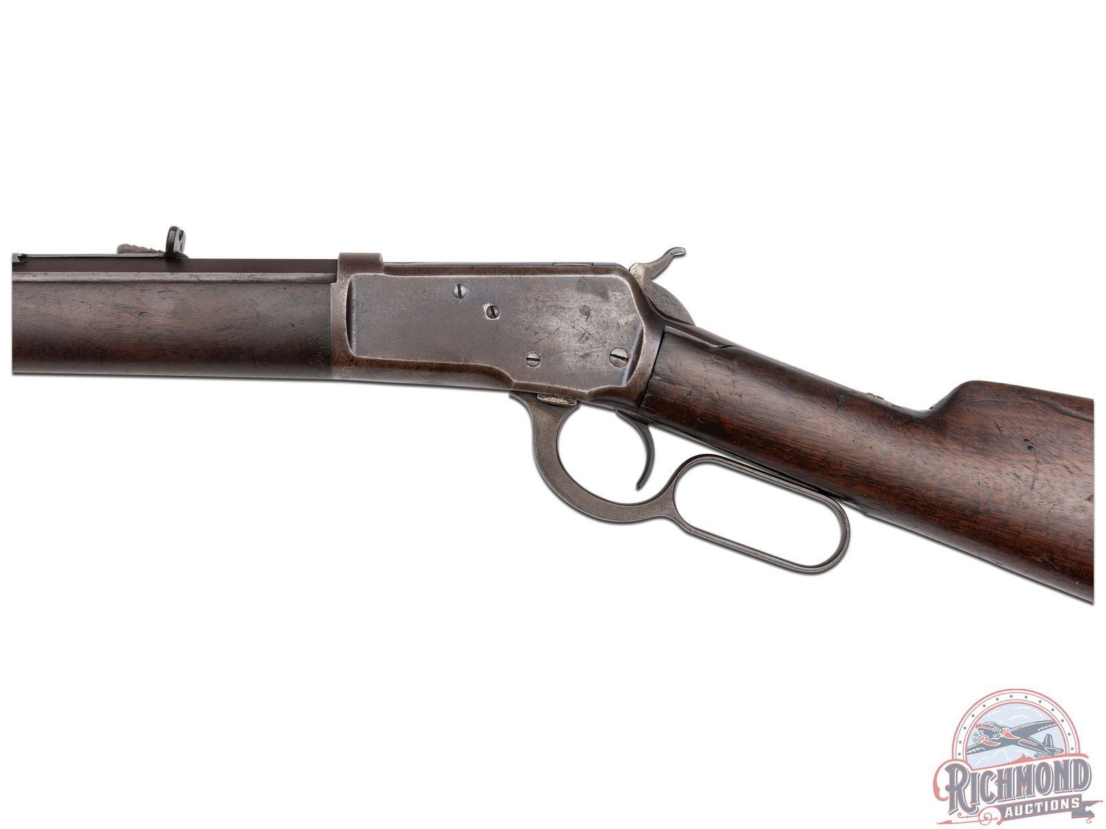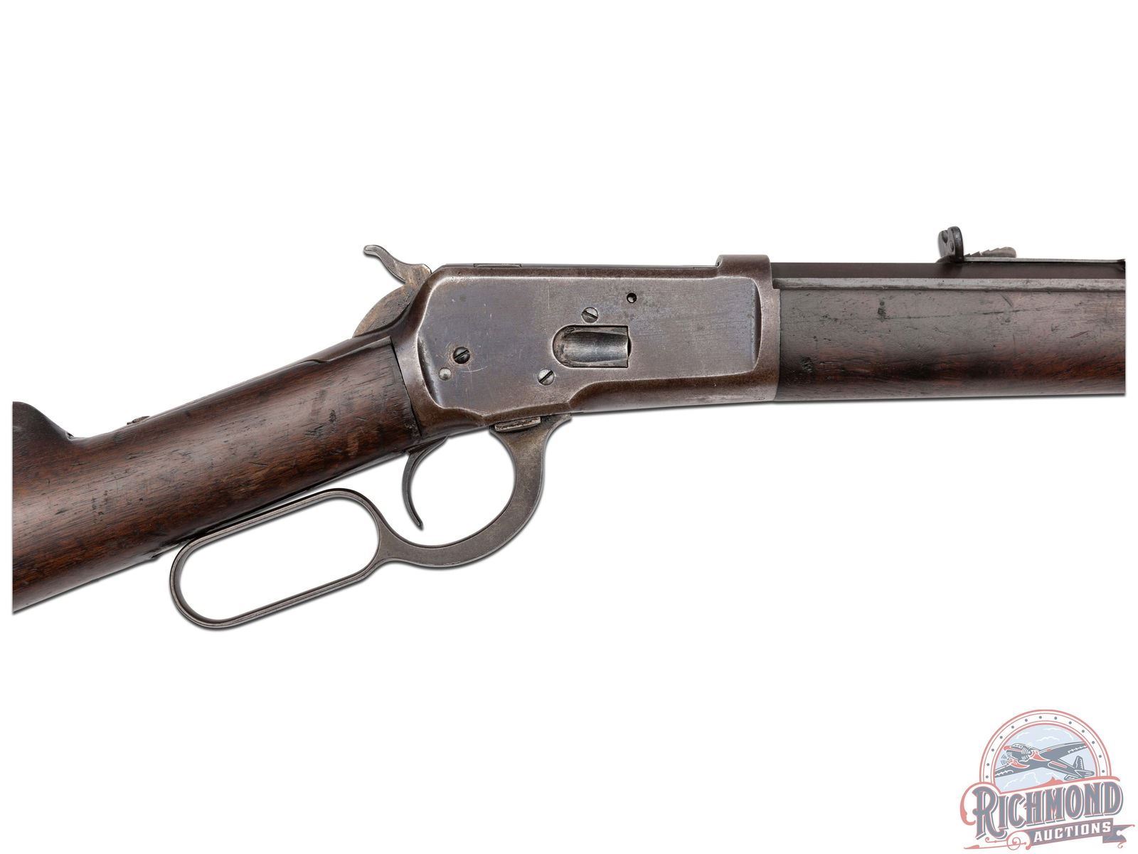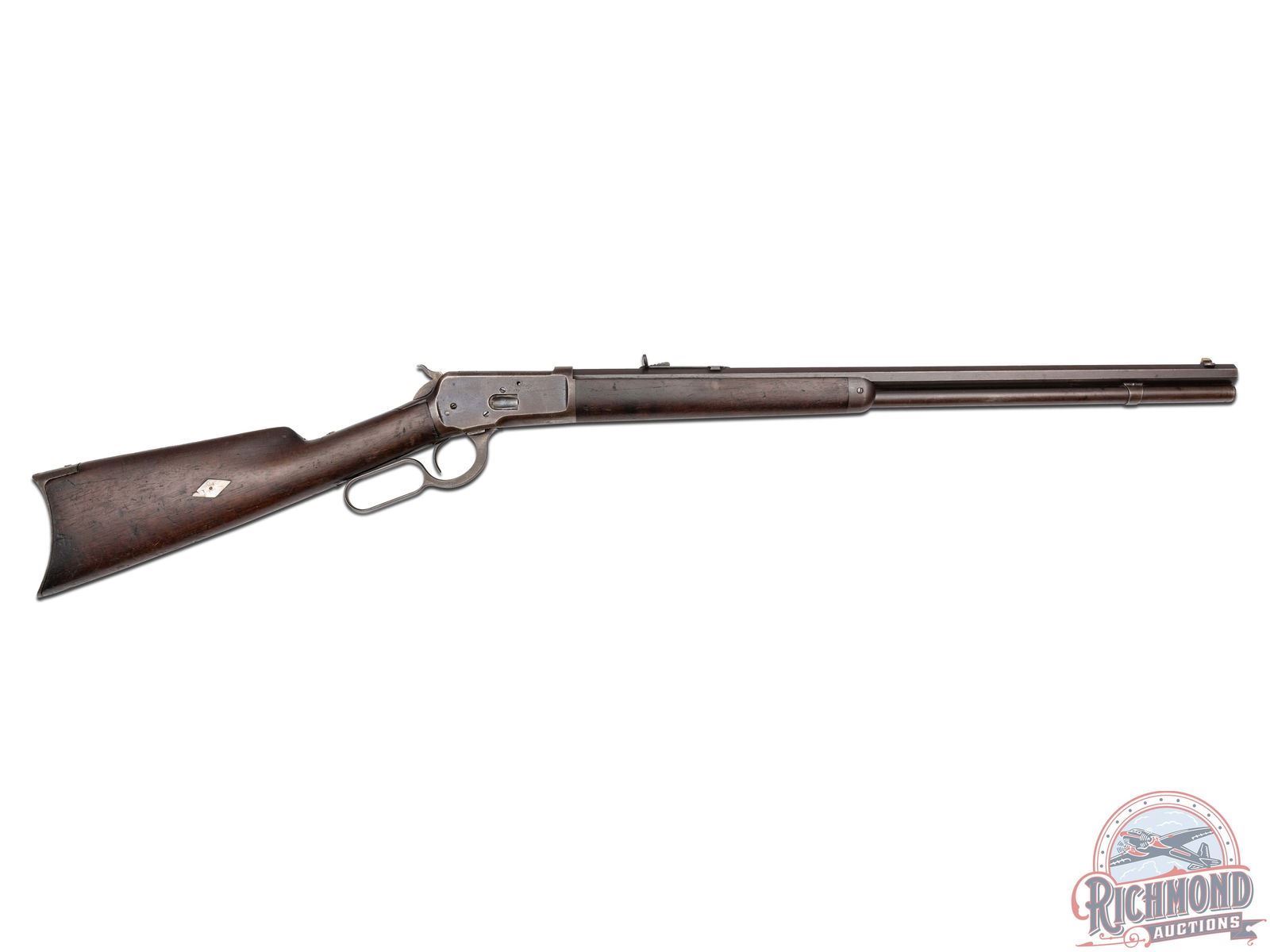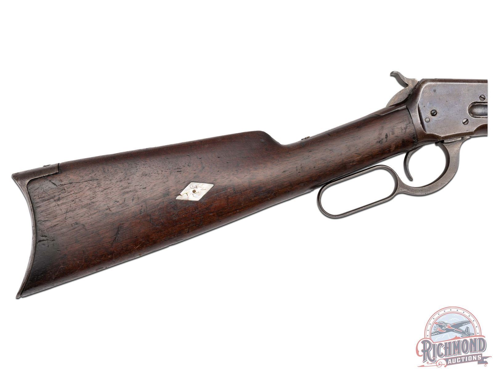 Made by Winchester Repeating Arms Company in 1892. 24" blued octagon Winchester Steel Barrel in 38-40 caliber with painted sheared blade front sight and Buckhorn rear sight with Winchester two line address. Blued solid frame with full blued magazine, plain trigger and case-hardened hammer and lever. Standard walnut plain rifle butt stock with steel case-hardened crescent butt plate and a non-factory clamshell diamond inlay with "J.B." on it. Standard walnut plain forearm. Solid first year rifle. CALIBER: 38-40. S/N: 9143. FFL STATUS: Antique.