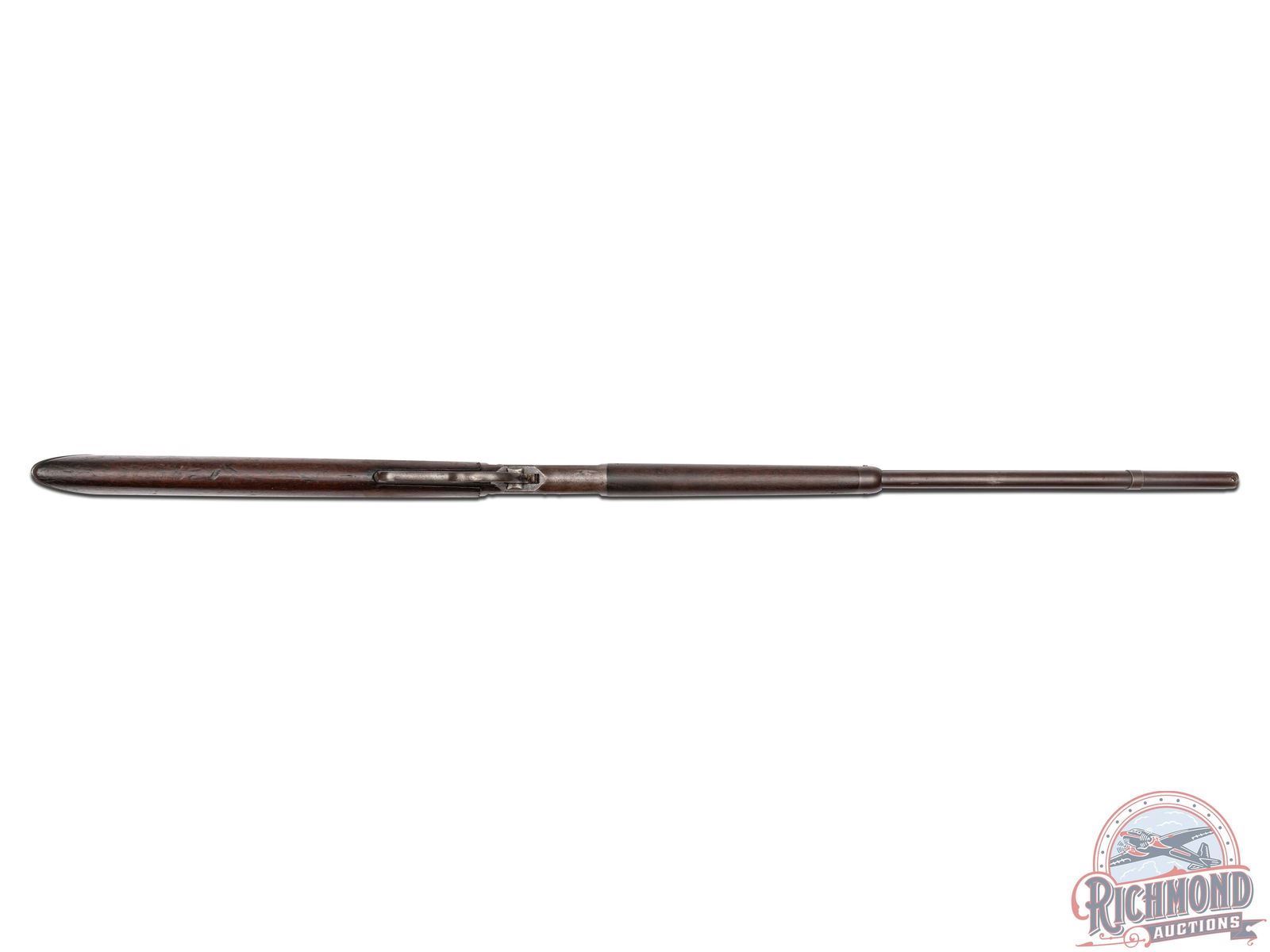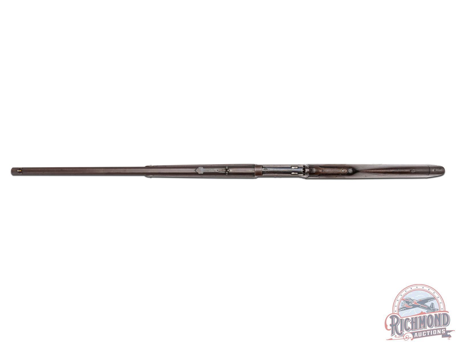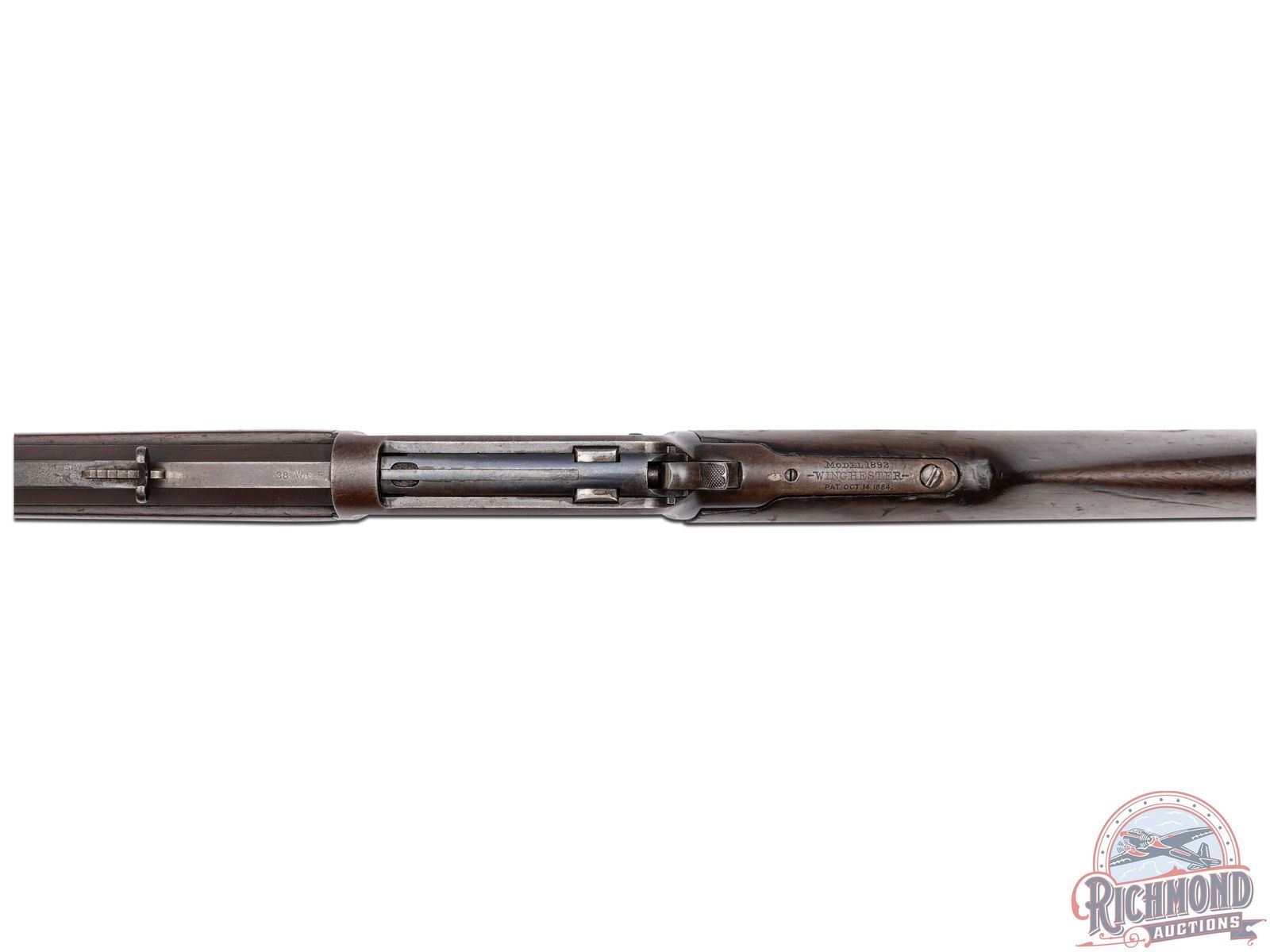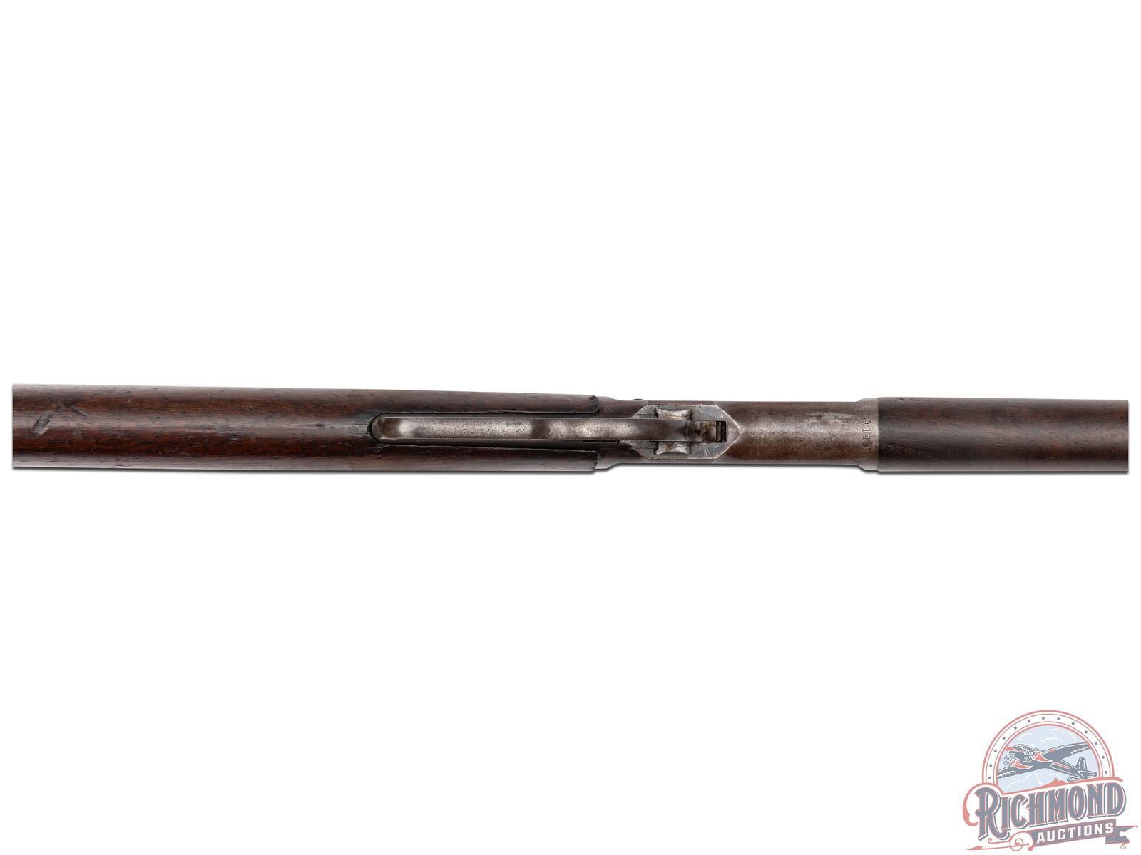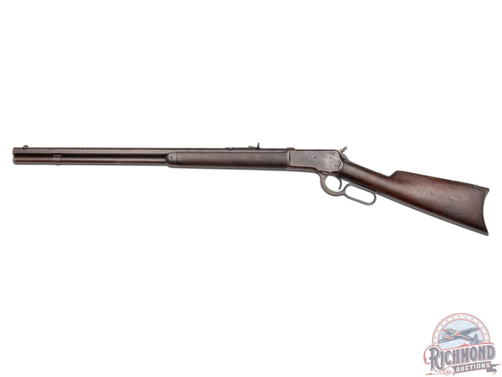 Made by Winchester Repeating Arms Company in 1892. 24" blued octagon Winchester Steel Barrel in 38-40 caliber with painted sheared blade front sight and Buckhorn rear sight with Winchester two line address. Blued solid frame with full blued magazine, plain trigger and case-hardened hammer and lever. Standard walnut plain rifle butt stock with steel case-hardened crescent butt plate and a non-factory clamshell diamond inlay with "J.B." on it. Standard walnut plain forearm. Solid first year rifle. CALIBER: 38-40. S/N: 9143. FFL STATUS: Antique.