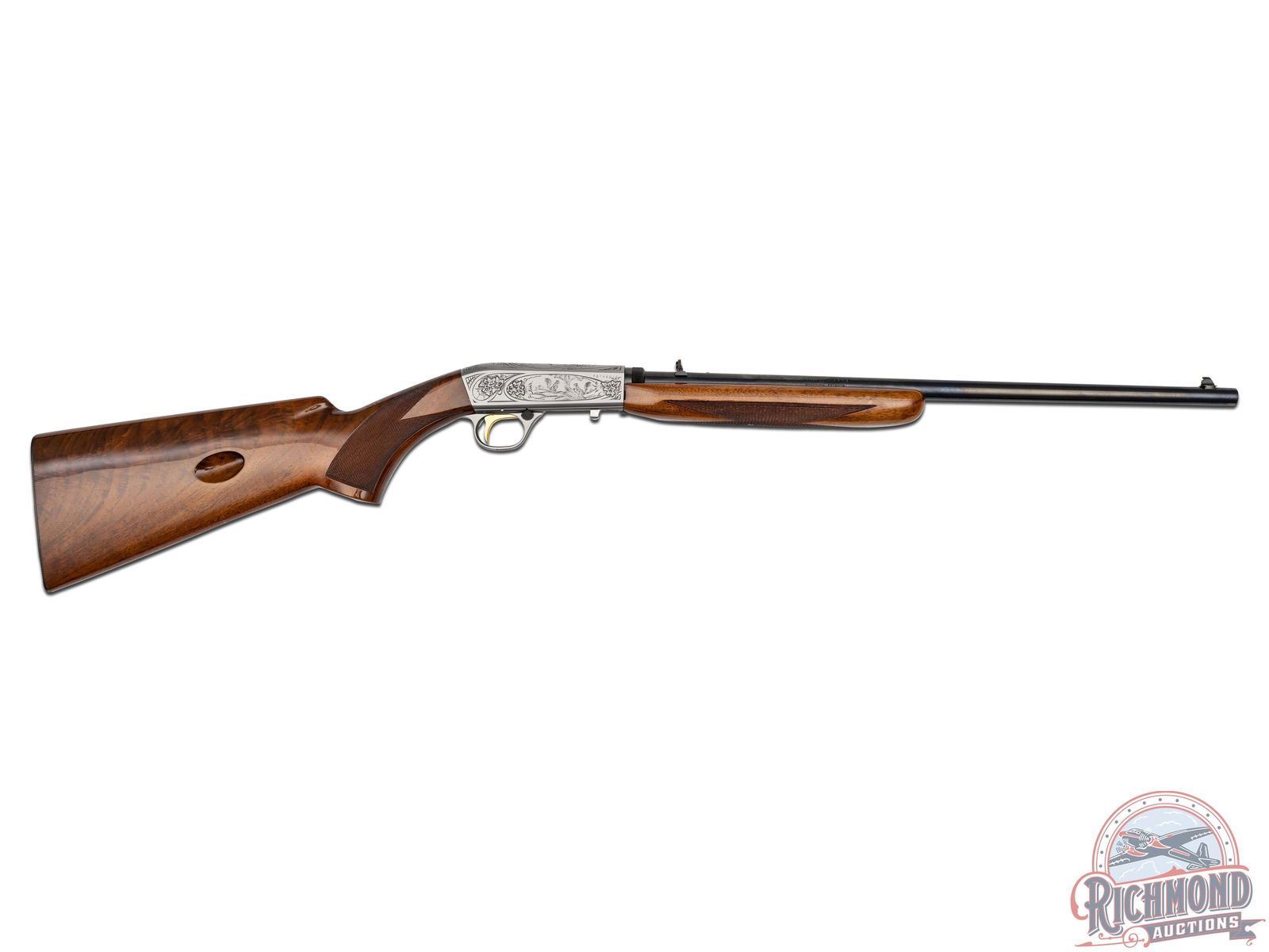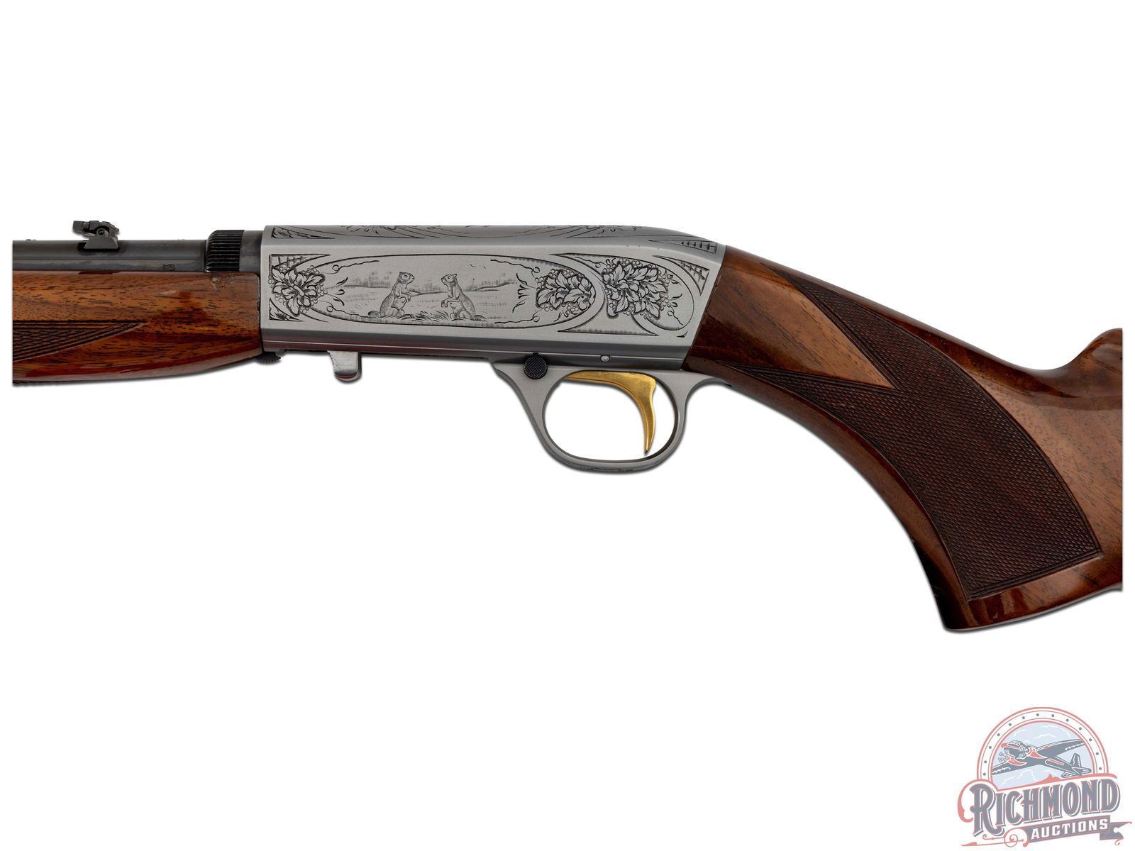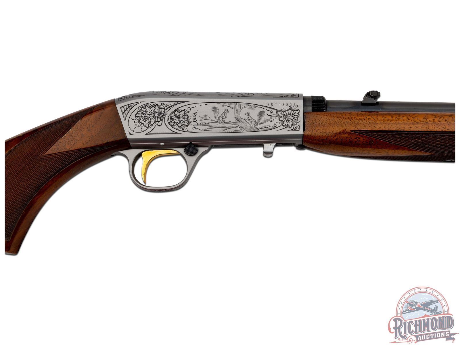 Manufactured in 1970 in Belgium by FN for Browning. Blued round 19-3/8" barrel with hunting sights and factory drilled scope holes. grayed polished takedown receiver with squirrel, duck, and floral engraving, signed "FM" on top by master engraver Francois Marechal. gold-plated trigger with push button safety and tubular magazine. Walnut checkered figured two piece stocks with blued serrated butt plate. CALIBER: 22 LR. S/N: 70T48836. FFL STATUS: Curio & Relic.