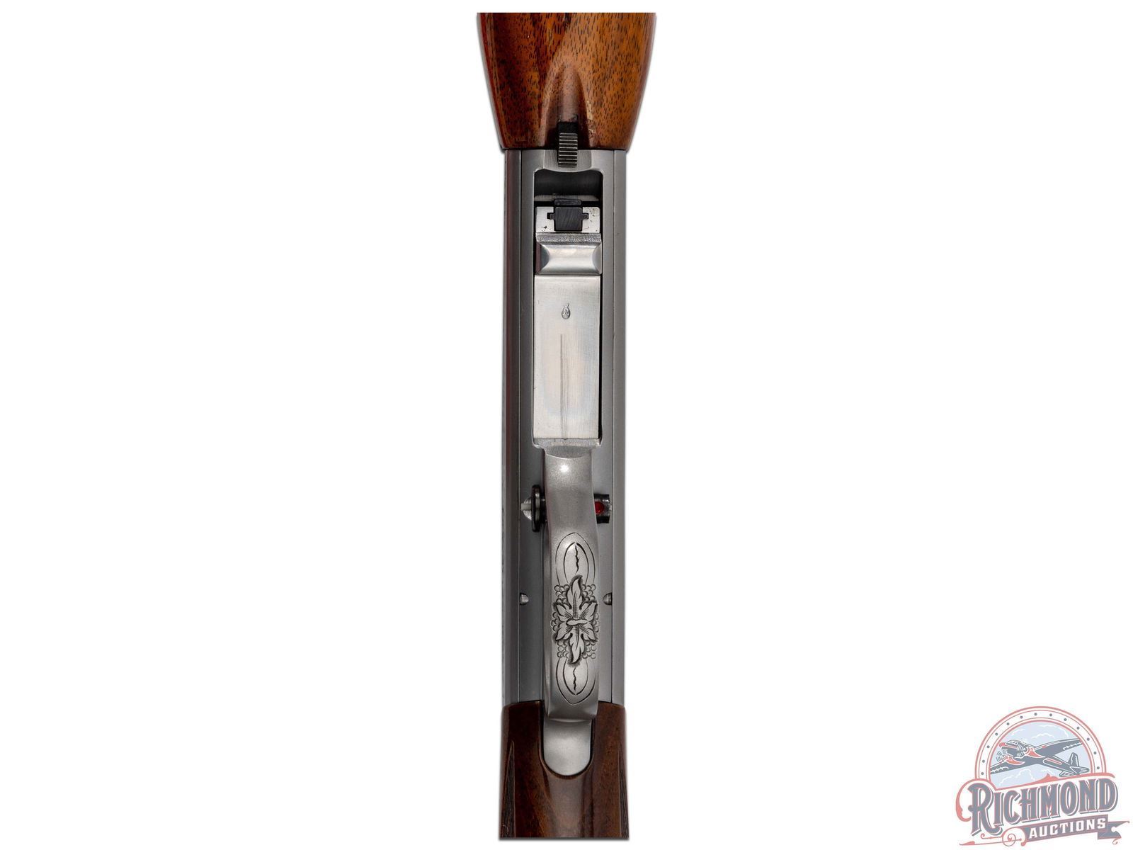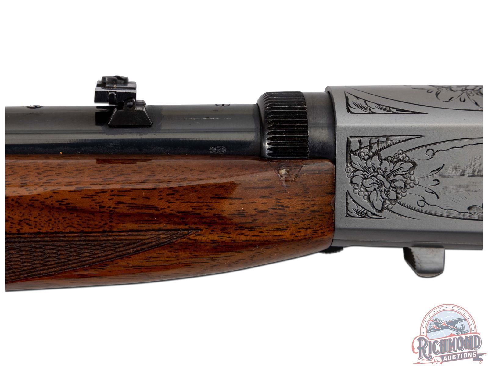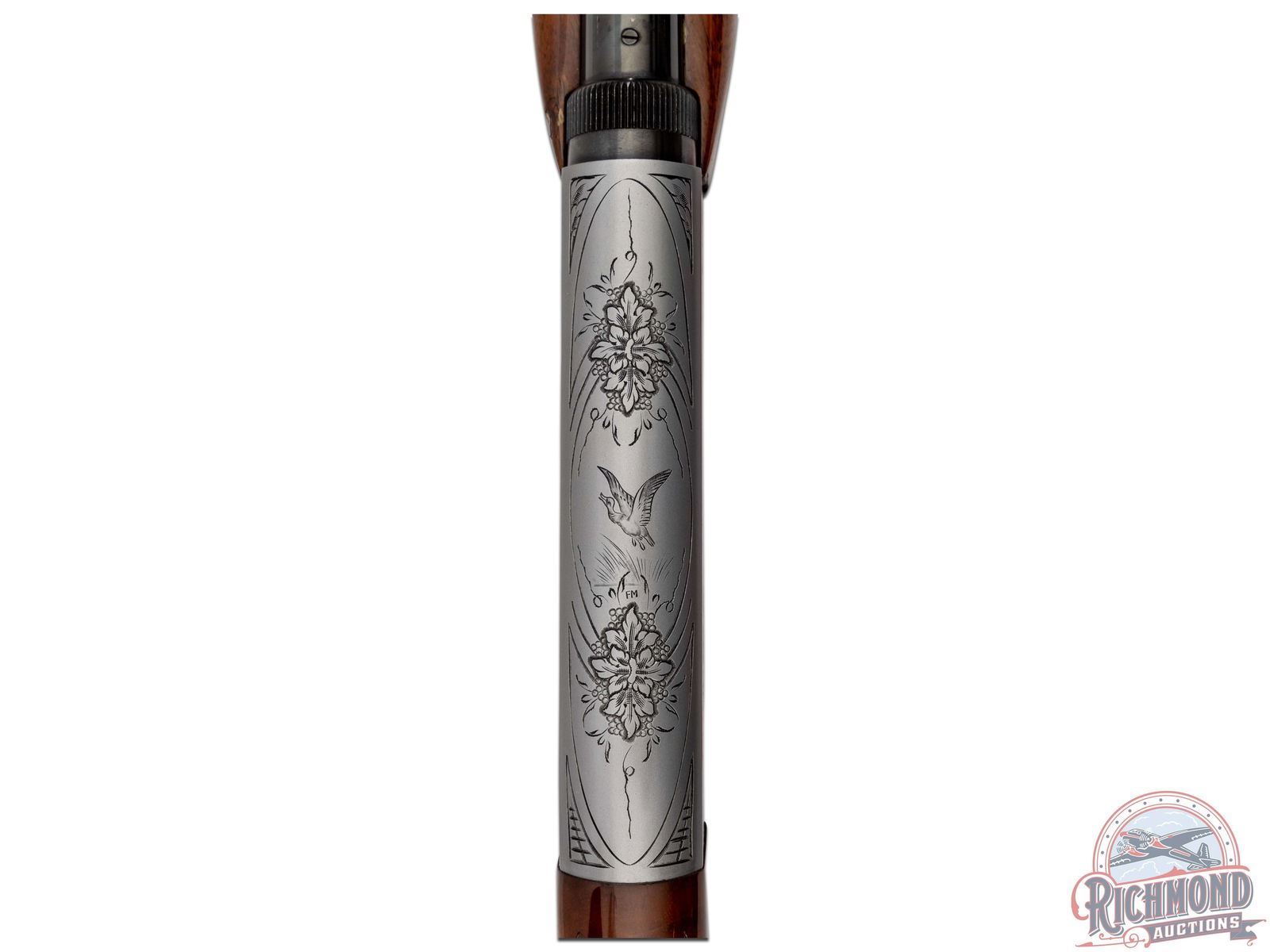 Manufactured in 1970 in Belgium by FN for Browning. Blued round 19-3/8" barrel with hunting sights and factory drilled scope holes. grayed polished takedown receiver with squirrel, duck, and floral engraving, signed "FM" on top by master engraver Francois Marechal. gold-plated trigger with push button safety and tubular magazine. Walnut checkered figured two piece stocks with blued serrated butt plate. CALIBER: 22 LR. S/N: 70T48836. FFL STATUS: Curio & Relic.