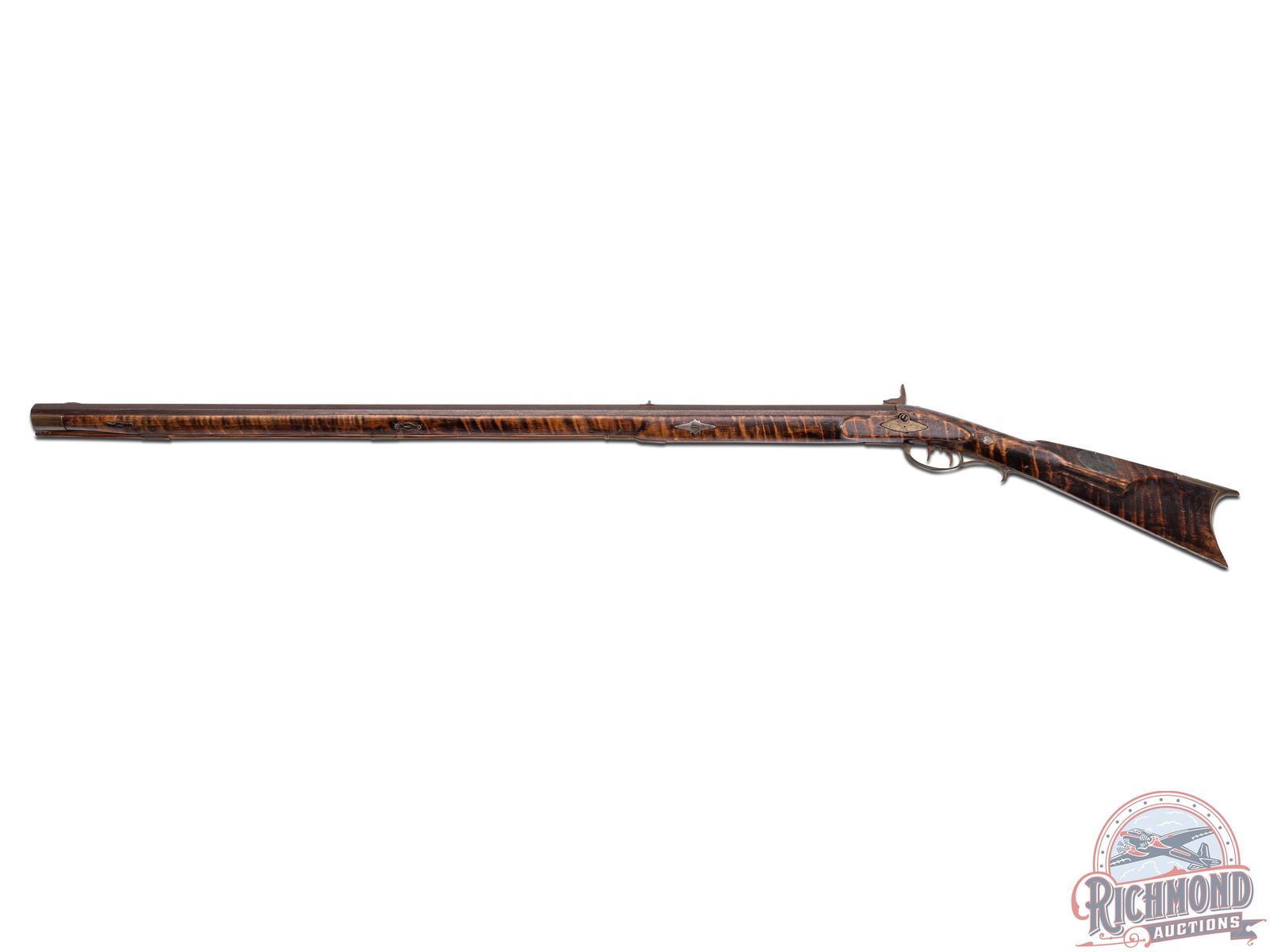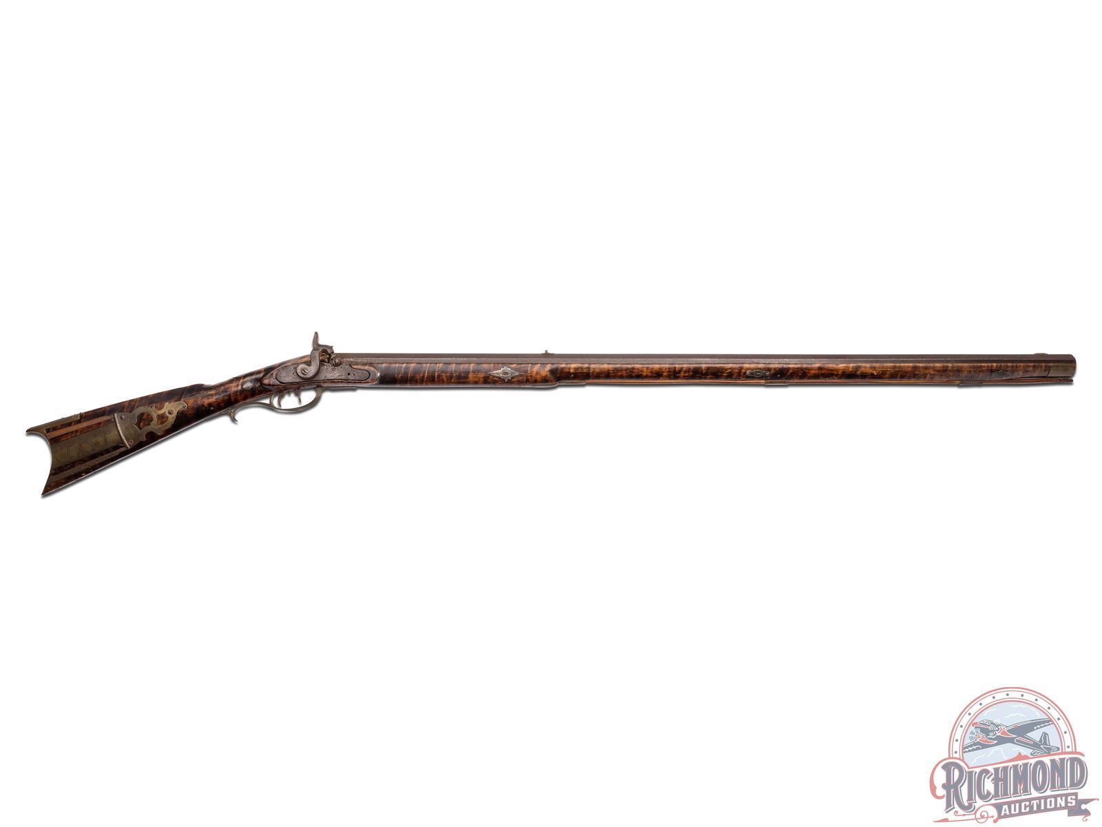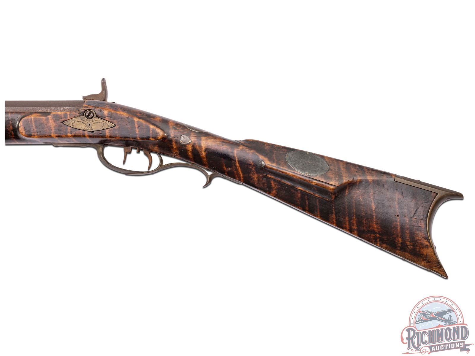 Unusual percussion Kentucky rifle attributed to Nicholas Shennefelt of Huntingdon County, PA. and later of Clarion County, PA., circa 1840. This rifle measures 56" overall with a 40" octagon rifled barrel in 44 caliber with no markings. This rifle has some parts which appear to be recycled from an earlier rifle of higher quality. The silver heart wrist inlays, the Hunter's Star barrel escutcheons, silver thumbpiece, brass football sideplate and double shield patchbox with Ram's Horn engraved lid resemble parts from a John Armstrong rifle. The lid of the patchbox shows evidence of fitting with engraving being cut off as does the sideplate. Although both makers used this style patchbox, architecture resembles more what Shennefelt did and is comparable to other rifles. Rifle has a "Josh Golcher" percussion lock with double set trigger control. Full curly maple stock with profile similar to Shennefelts with ten coin silver inlays, including an eagle similar to Shennefelt. CALIBER: 44. FFL STATUS: Antique.