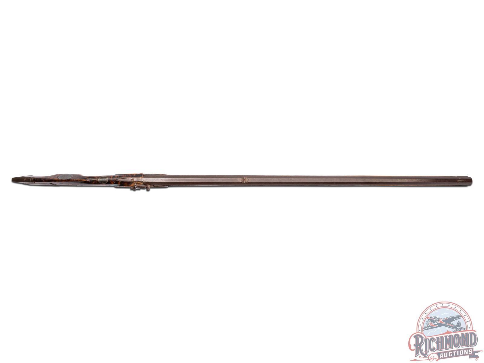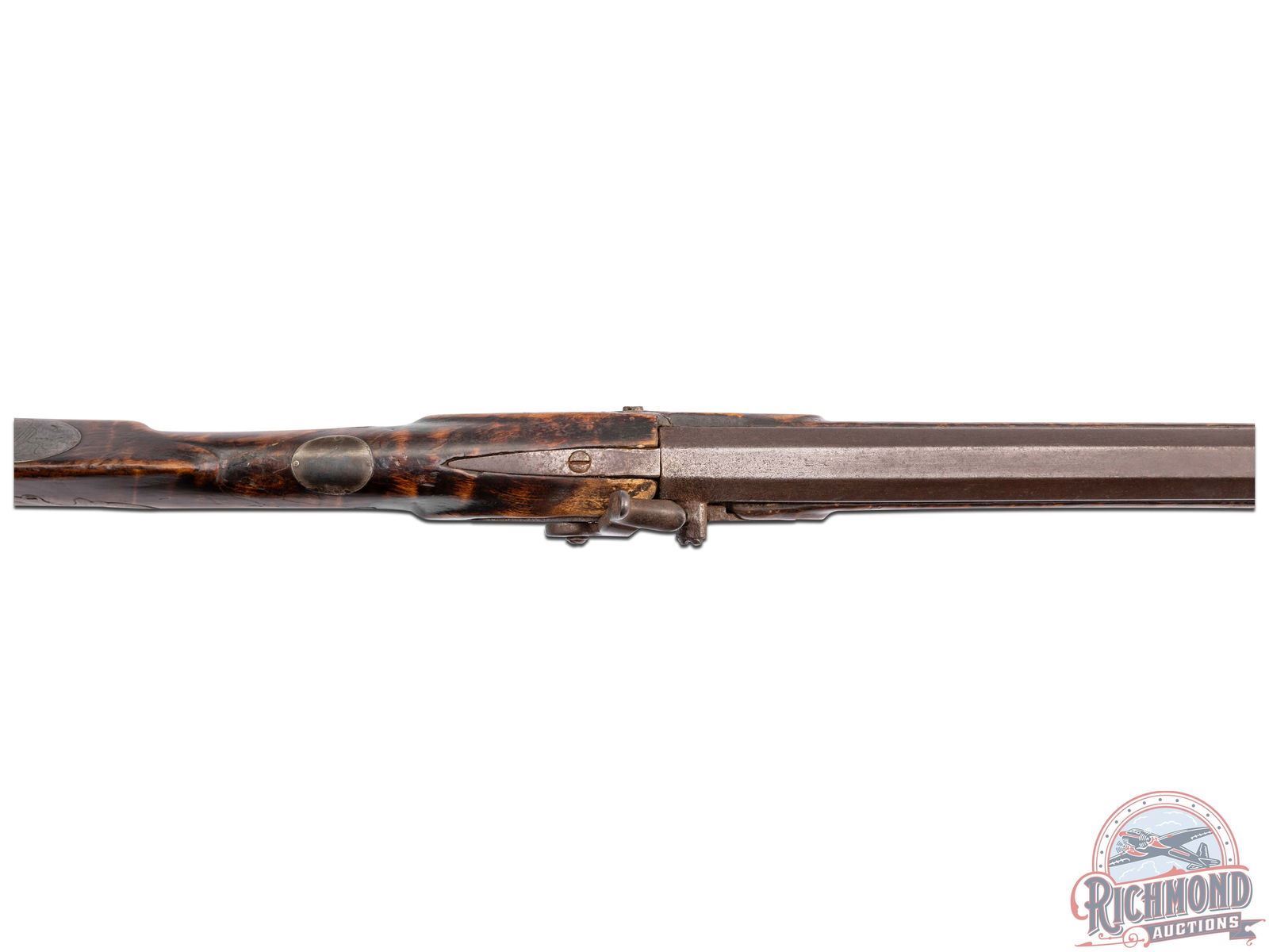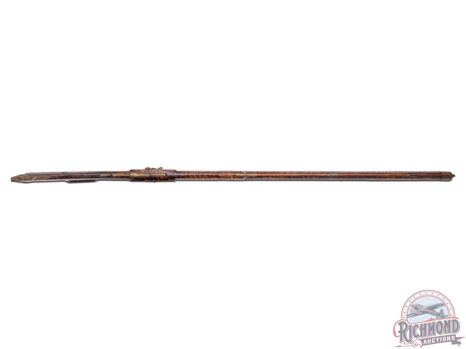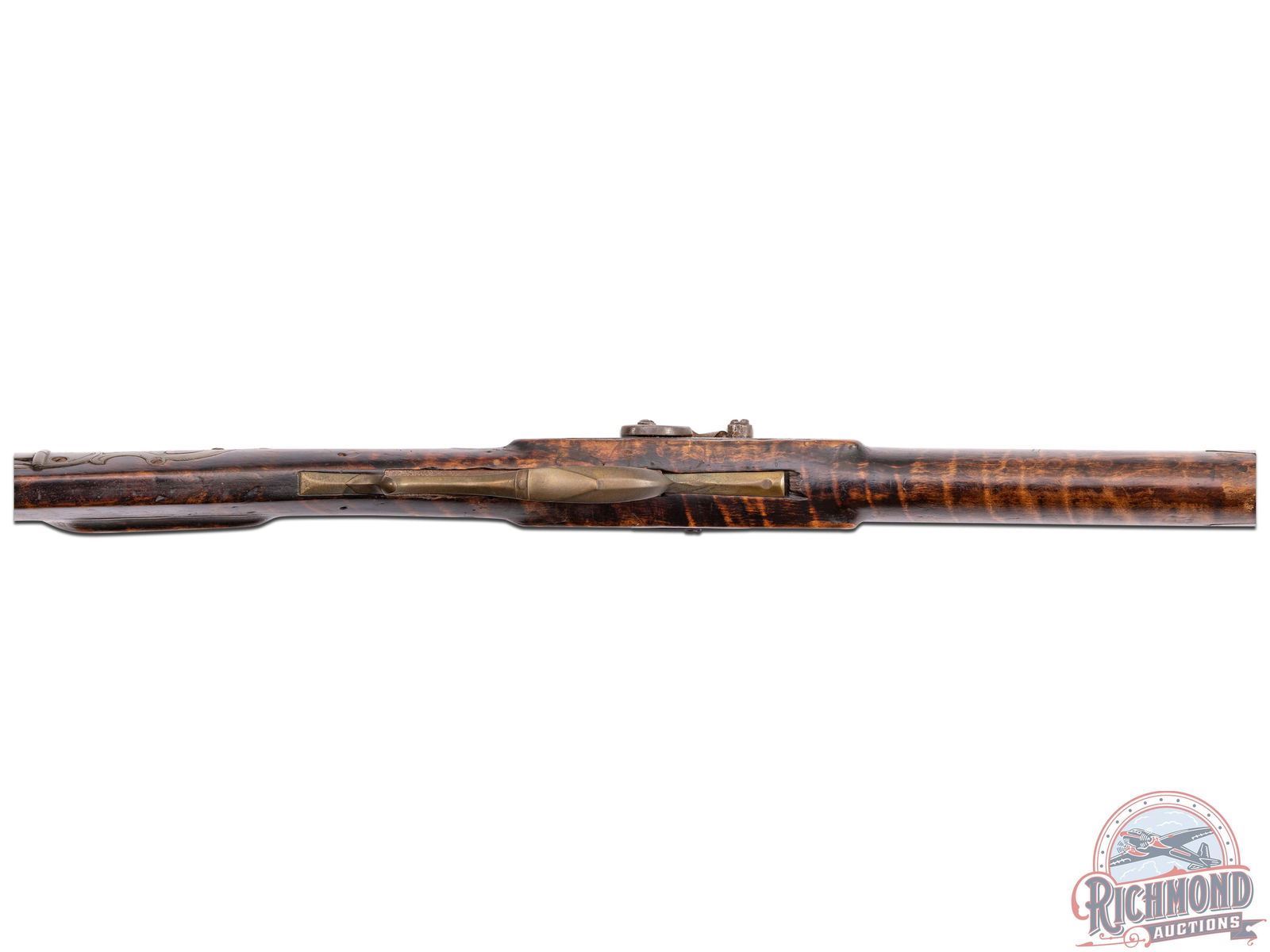 Unusual percussion Kentucky rifle attributed to Nicholas Shennefelt of Huntingdon County, PA. and later of Clarion County, PA., circa 1840. This rifle measures 56" overall with a 40" octagon rifled barrel in 44 caliber with no markings. This rifle has some parts which appear to be recycled from an earlier rifle of higher quality. The silver heart wrist inlays, the Hunter's Star barrel escutcheons, silver thumbpiece, brass football sideplate and double shield patchbox with Ram's Horn engraved lid resemble parts from a John Armstrong rifle. The lid of the patchbox shows evidence of fitting with engraving being cut off as does the sideplate. Although both makers used this style patchbox, architecture resembles more what Shennefelt did and is comparable to other rifles. Rifle has a "Josh Golcher" percussion lock with double set trigger control. Full curly maple stock with profile similar to Shennefelts with ten coin silver inlays, including an eagle similar to Shennefelt. CALIBER: 44. FFL STATUS: Antique.