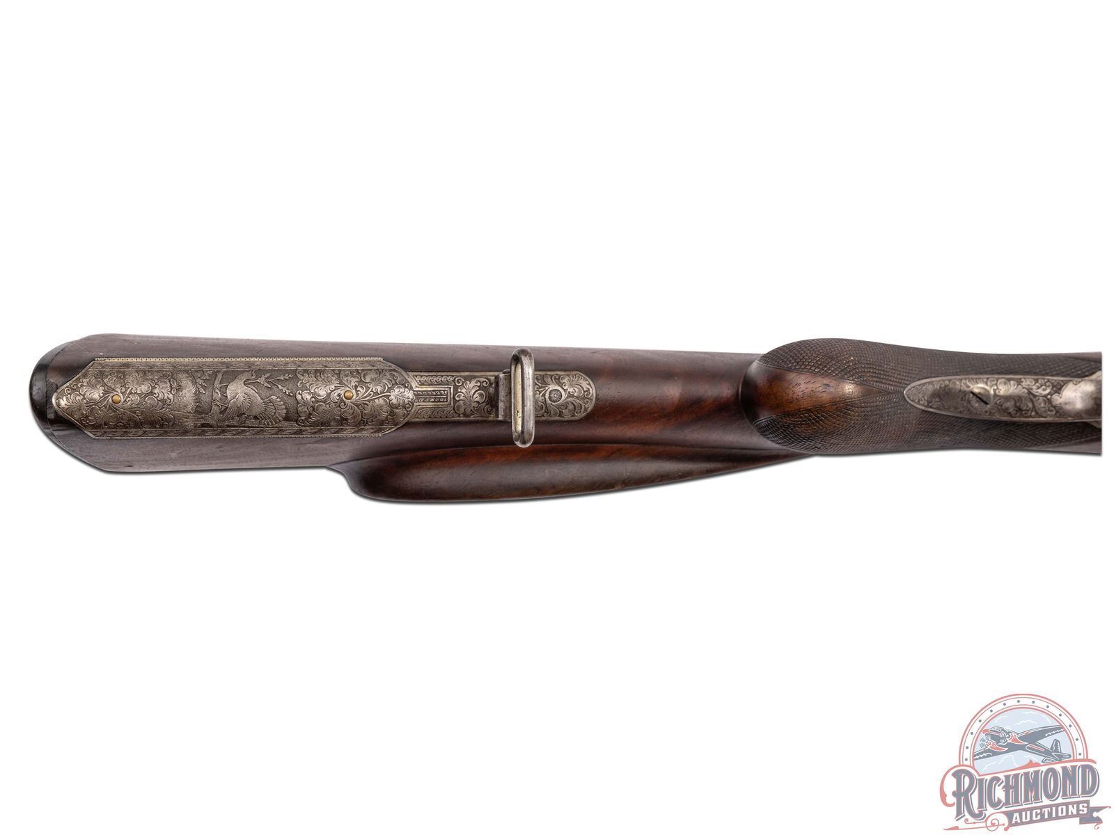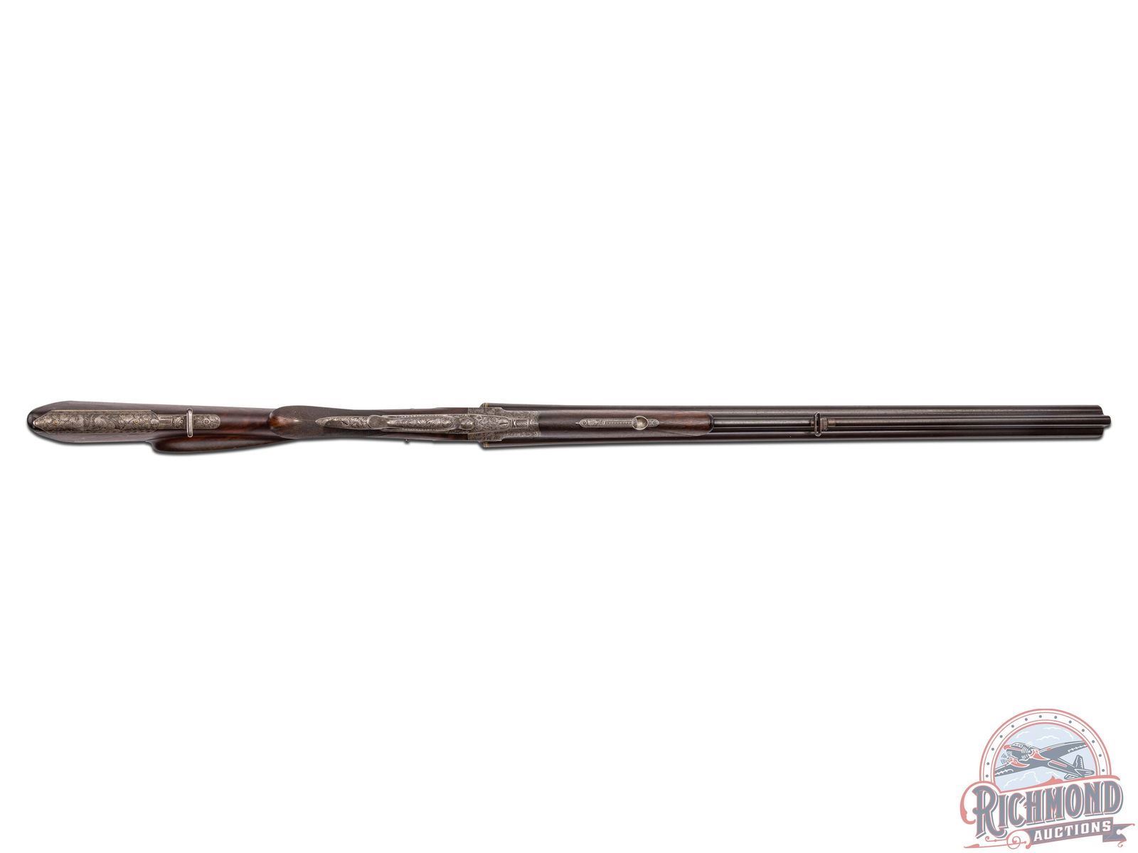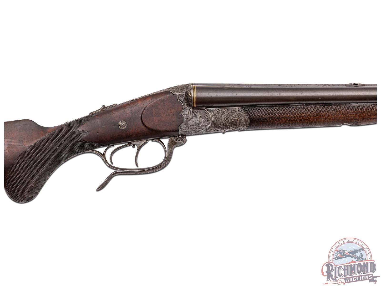 Made in Braunscheig, Germany by G.L. Rasch in 1916. 26-3/4" blued fluid steel barrels with maker markings, matted rib, gold breech rings, rifle sights, and extractors in 16 gauge over 8x72R rifle. Barrels have 2-9/16" chambers and Modified cylinder chokes. Coin finished maker marked underlever action with game scene engraving, Greener safety, top tang barrel selector, and underlever opener. Action has bore scene on left and hirsch scene on right. Walnut checkered round knob pistol grip stock with right-handed cheekpiece, turkey engraved bullet trap and horn butt plate. Matching walnut checkered splinter forearm with latch release. LOP: 13-1/4". DAC: 1-1/2". DAH: 2-1/4". CALIBER: 16/8x72R. S/N: 3214. FFL STATUS: Curio & Relic.