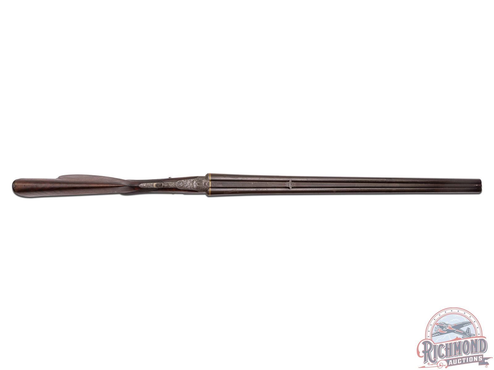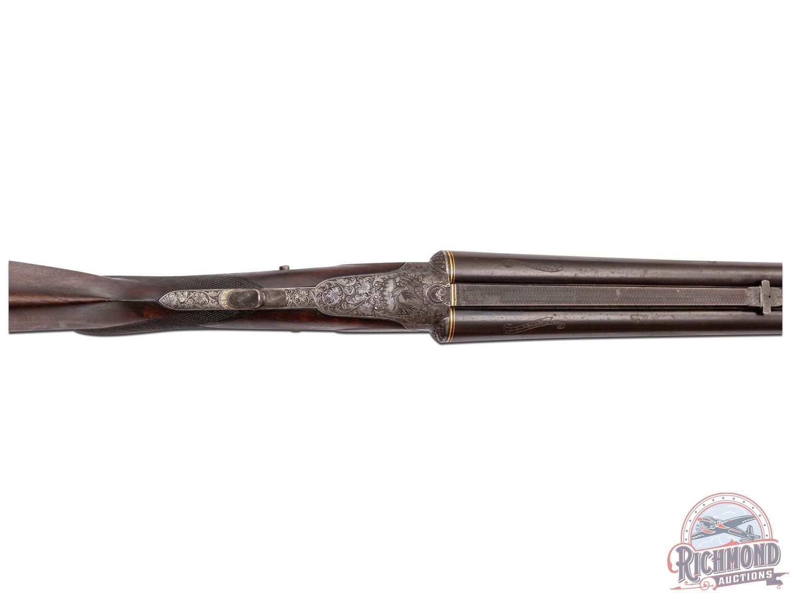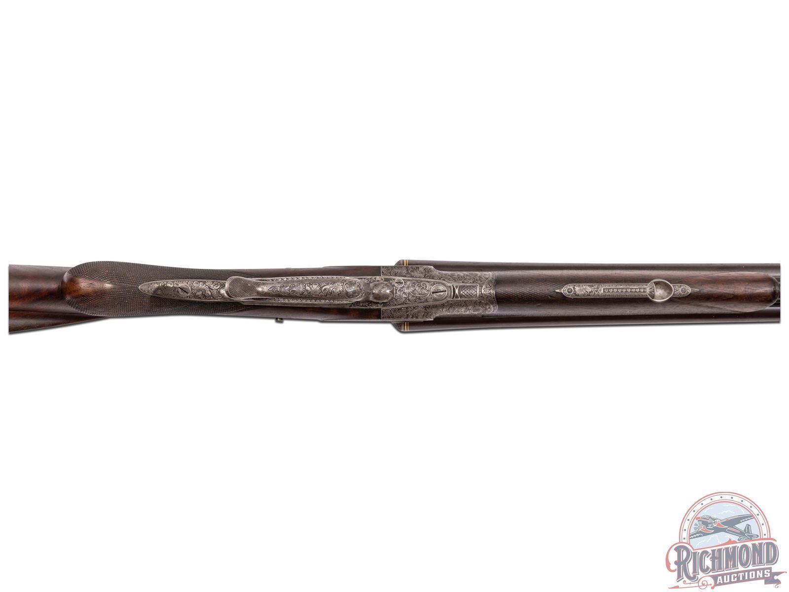 Made in Braunscheig, Germany by G.L. Rasch in 1916. 26-3/4" blued fluid steel barrels with maker markings, matted rib, gold breech rings, rifle sights, and extractors in 16 gauge over 8x72R rifle. Barrels have 2-9/16" chambers and Modified cylinder chokes. Coin finished maker marked underlever action with game scene engraving, Greener safety, top tang barrel selector, and underlever opener. Action has bore scene on left and hirsch scene on right. Walnut checkered round knob pistol grip stock with right-handed cheekpiece, turkey engraved bullet trap and horn butt plate. Matching walnut checkered splinter forearm with latch release. LOP: 13-1/4". DAC: 1-1/2". DAH: 2-1/4". CALIBER: 16/8x72R. S/N: 3214. FFL STATUS: Curio & Relic.
