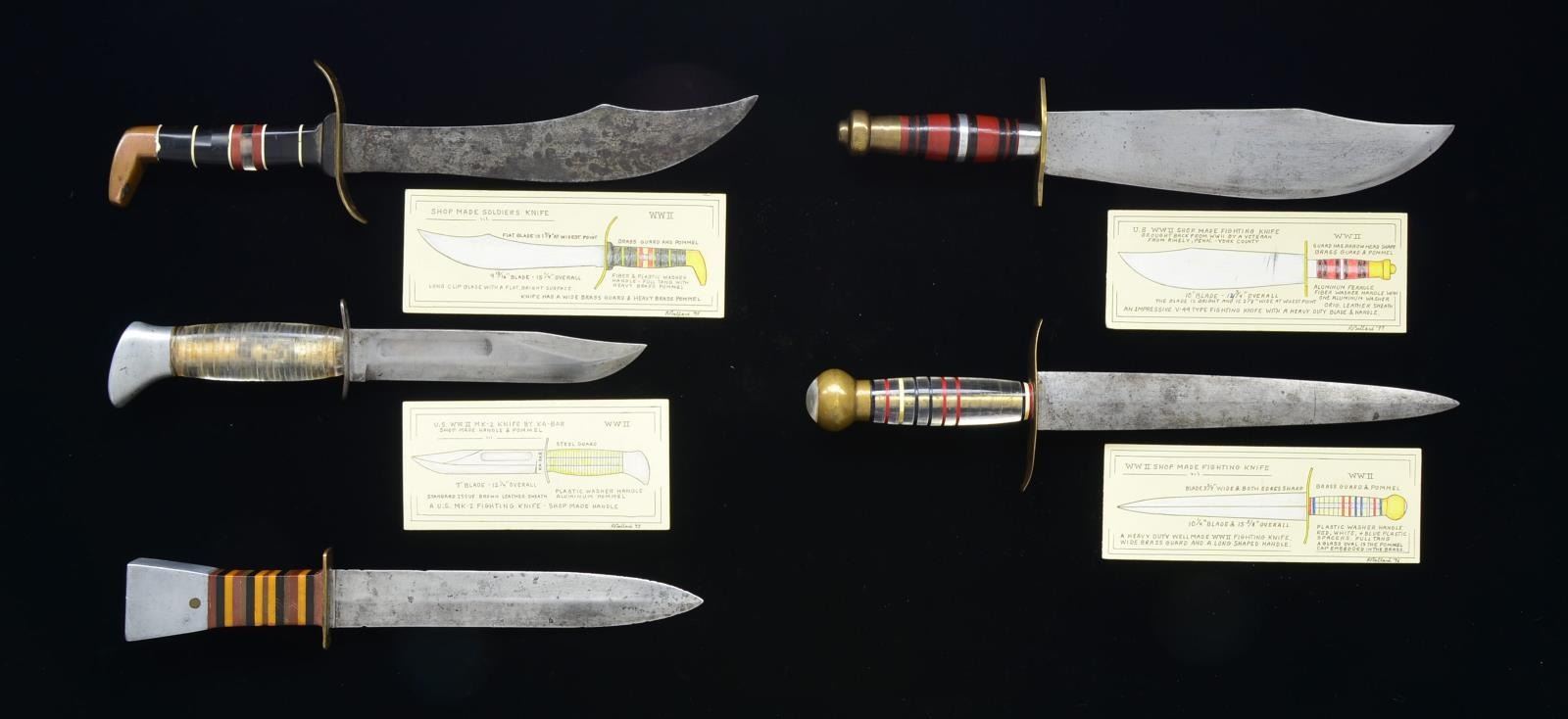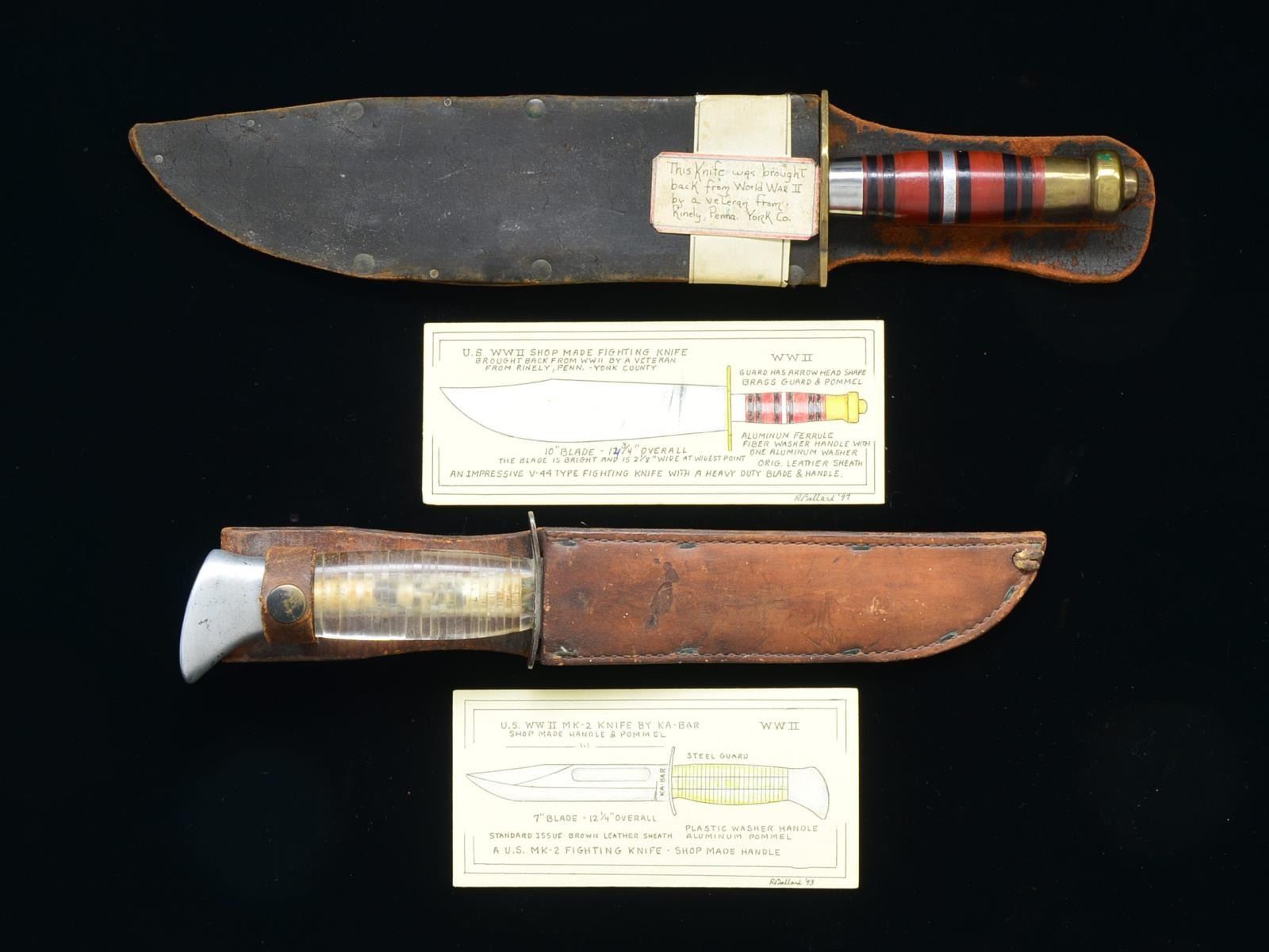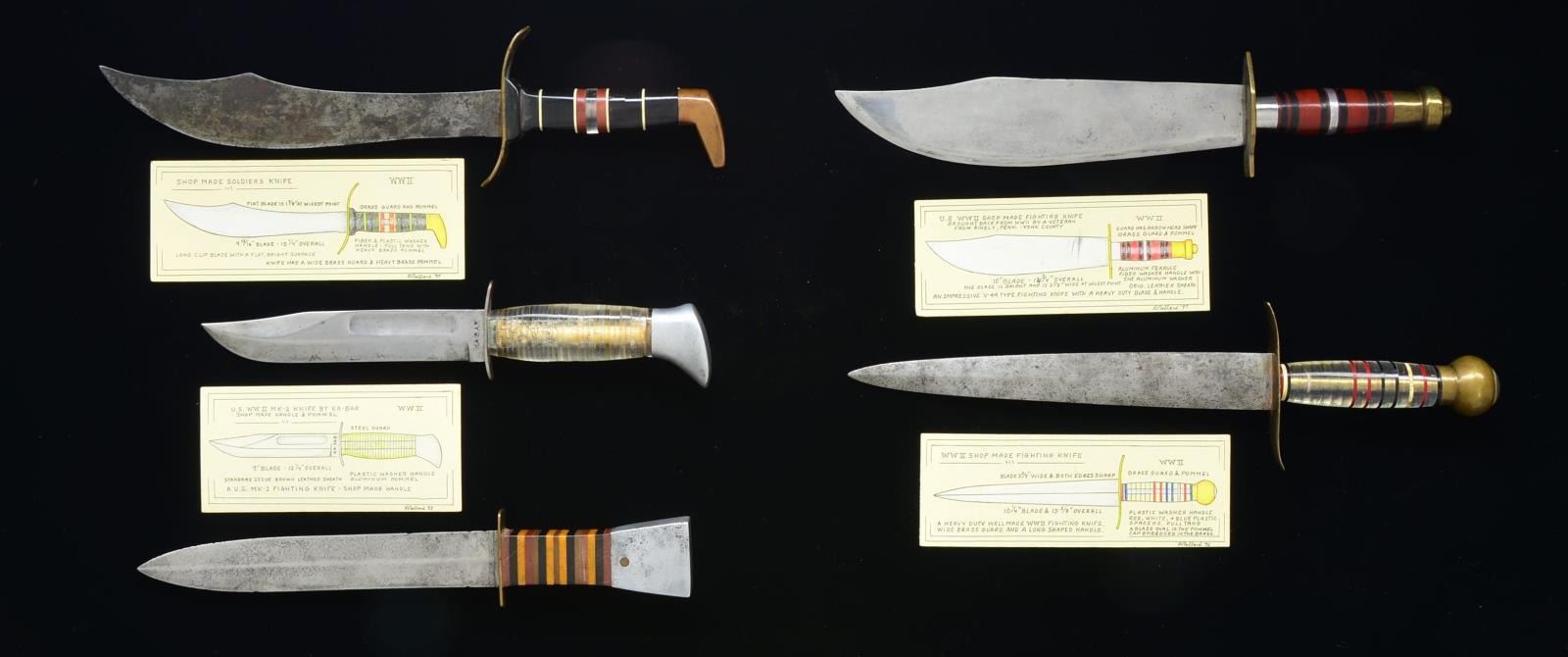1) Impressive V-44 style 10" blade, 14.75" overall. Aluminum, black & red hard rubber washer stacked grip, lg. brass pommel, 3" arrow shaped cross guard, original leather sheath w/ note: “this knife was brought back from World War II by a veteran from Rinely, Penn, yard sale 1991”. CONDITION: knife is very good overall, sheath is sound & solid w/ scuffed & flaked surface. 2) “KABAR” marked MK-2 7” blade & cross guard w/ custom shop made stacked clear plastic washer grip & shaped aluminum pommel. CONDITION: good to very good overall in leather sheath. 3) Impressive & sturdy, very sharp 10" dagger point blade, 4.25" slight “S” shape tapered brass cross guard, stacked clear plastic washer grip, red, white, & black edge decoration, heavy brass pommel w/ lg. inset clear plastic cabochon. CONDITION: good overall. 4) Serviceman name: “Virgil B. Minturn” etched on 8.75" double-edged blade, 13.25" overall, heavy aluminum tapered block pommel, stacked black, brown, yellow & red washer grip. CONDITION: good to very good overall. 5) 15.25" overall, almost 10" scimitar shaped blade, 4" brass “S” shaped cross guard, stacked grip made from black, white, red & clear plastic washers. Screwed on heavy brass “L” shaped pommel. CONDITION: good to very good overall, stacked washers slightly askew due to loose pommel. UNATTACHED ACCESSORIES: all knives have hand drawn collection cards by Roger Ballard. PROVENANCE: Collection of Roger Ballard. (02-15158 & 02-15159/JS). $700-900.