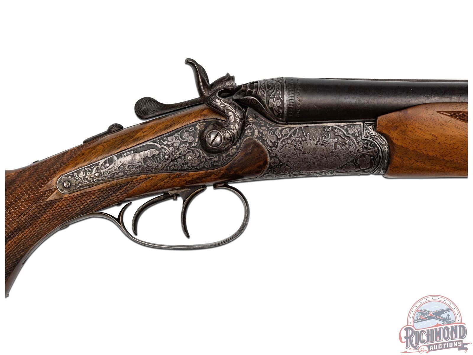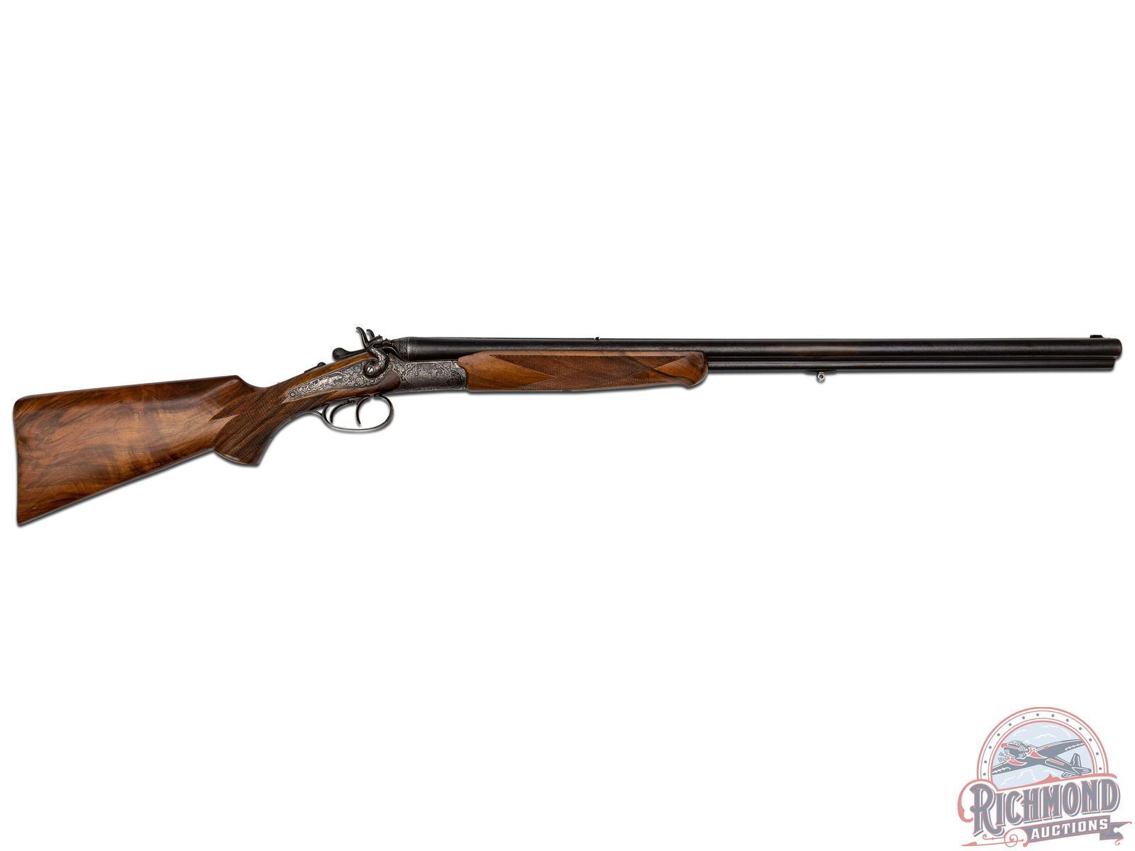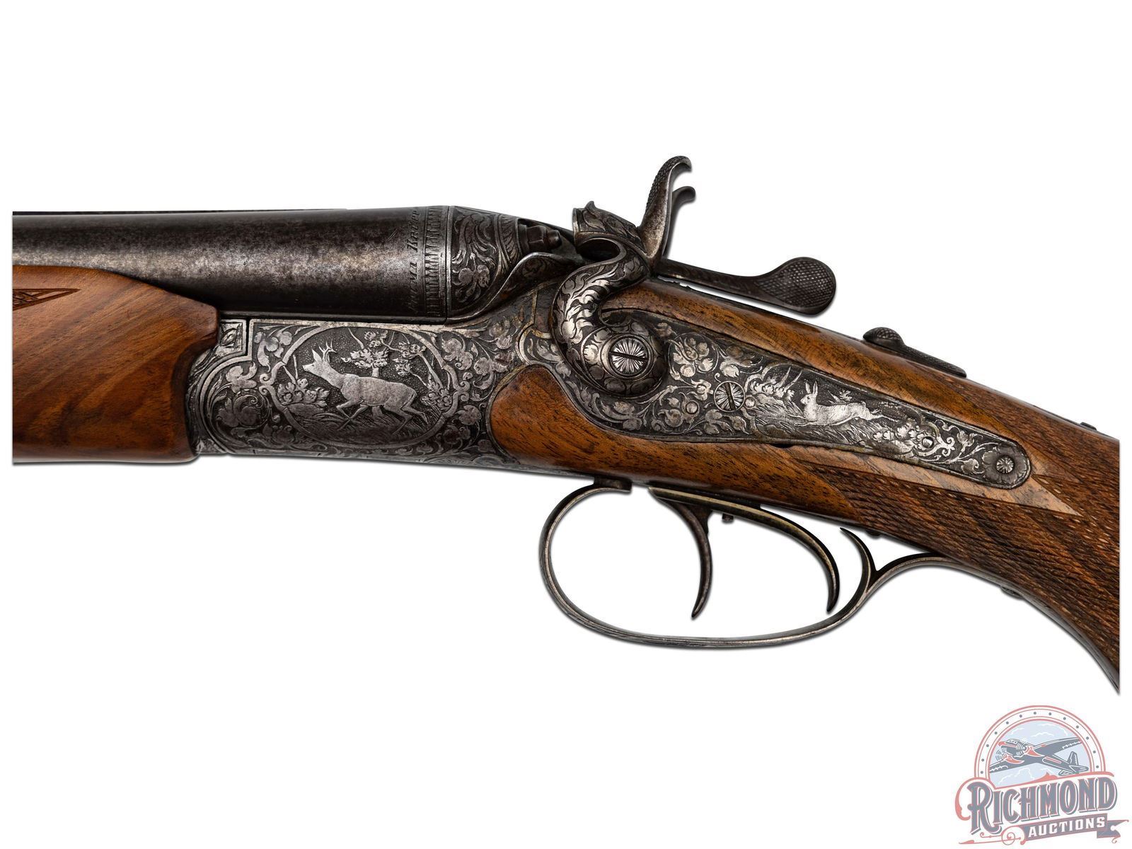 Manufactured circa 1920's in Germany. Barrel rib is marked "ED KETTNER, COLN R". No visible import marks. Matching serials on the frame and barrels. Standard commercial proofs. 26-3/4" blued steel barrels with blade front sight and flip up u-notch rear. Rifle appears to be .43 caliber (should be chamber cast to verify). Polished and game scene engraved round bottom frame featuring a deer on the left side and stag on the right. Lock plate features engraved rabbits on the left side and a dog on the right. Tang safety and double set triggers. Replaced forearm and butt stock with fine cut checkering on both. Carved cheekpiece on the right side of the butt. Checkered metal butt plate. Bores appear to measure at full/full. LOP: 13-1/2". CALIBER: 16 Gauge & .43 CAL. S/N: 509. FFL STATUS: Curio & Relic.