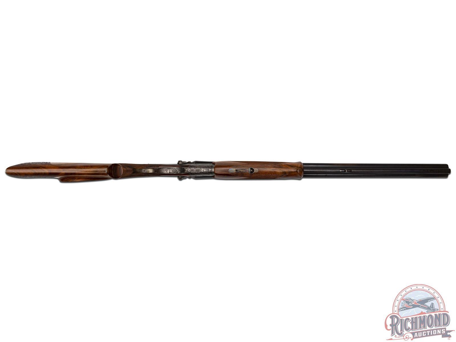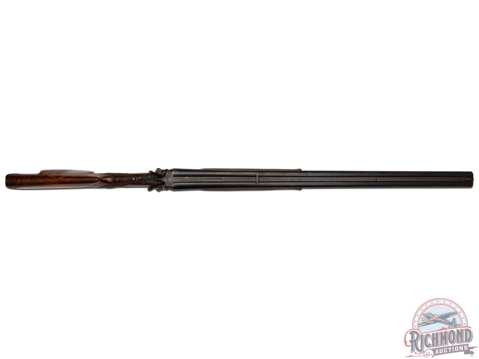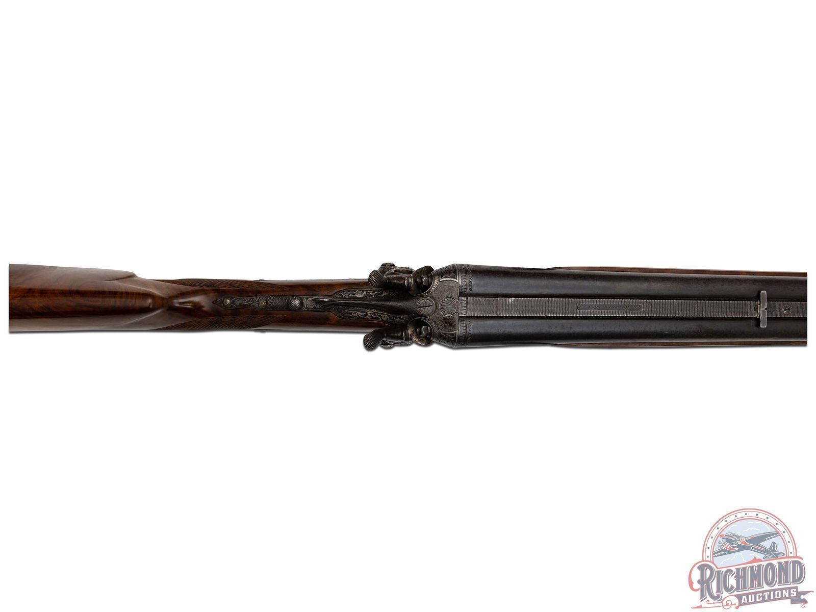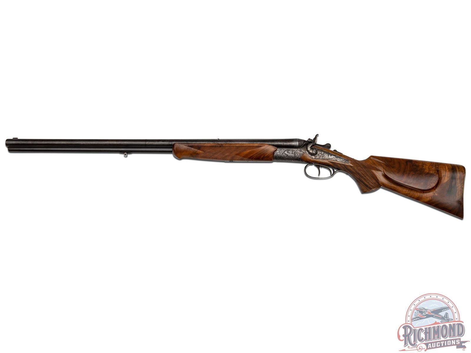 Manufactured circa 1920's in Germany. Barrel rib is marked "ED KETTNER, COLN R". No visible import marks. Matching serials on the frame and barrels. Standard commercial proofs. 26-3/4" blued steel barrels with blade front sight and flip up u-notch rear. Rifle appears to be .43 caliber (should be chamber cast to verify). Polished and game scene engraved round bottom frame featuring a deer on the left side and stag on the right. Lock plate features engraved rabbits on the left side and a dog on the right. Tang safety and double set triggers. Replaced forearm and butt stock with fine cut checkering on both. Carved cheekpiece on the right side of the butt. Checkered metal butt plate. Bores appear to measure at full/full. LOP: 13-1/2". CALIBER: 16 Gauge & .43 CAL. S/N: 509. FFL STATUS: Curio & Relic.
