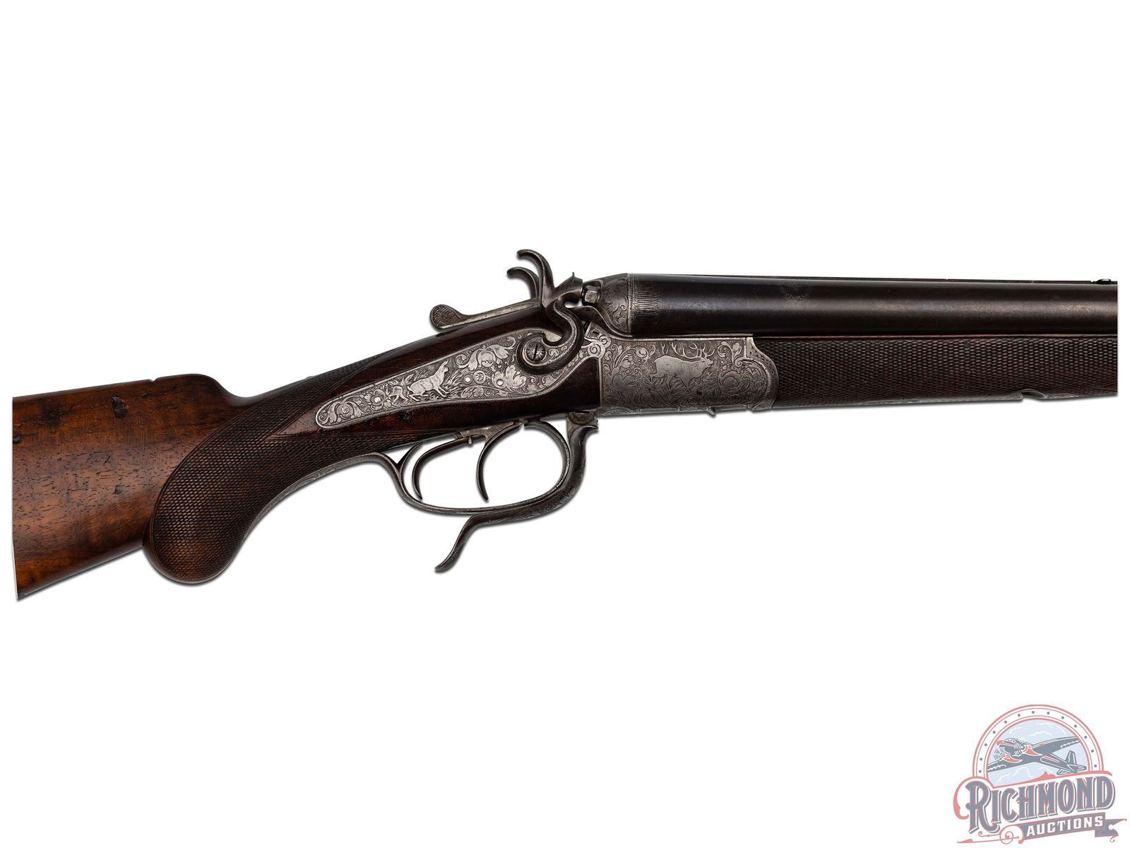 Metal is very good overall. Frame has lost the bulk of its case coloring. Barrels are turning a brown patina. Wood has light scrapes and scratches. Bores have a few minor pits. Rifle bore is frosted. Rifling is very good overall. Action is tight, as are the hammers.