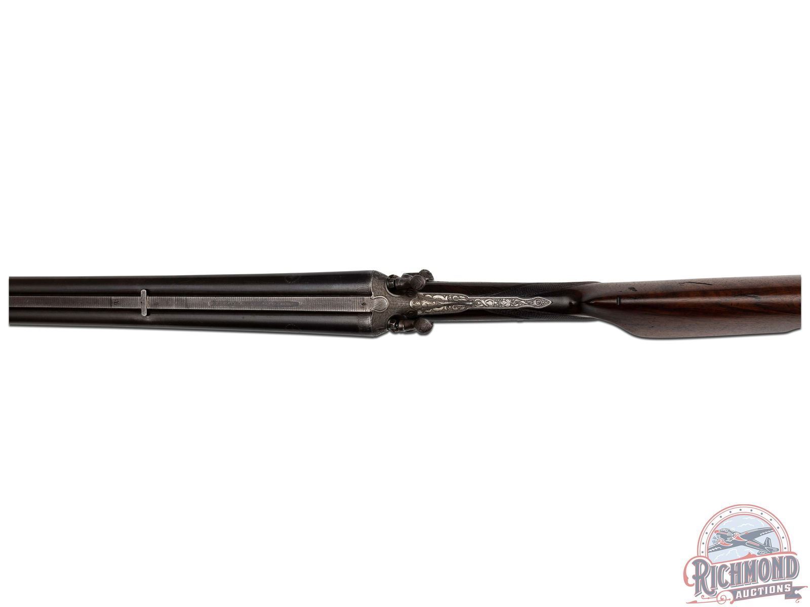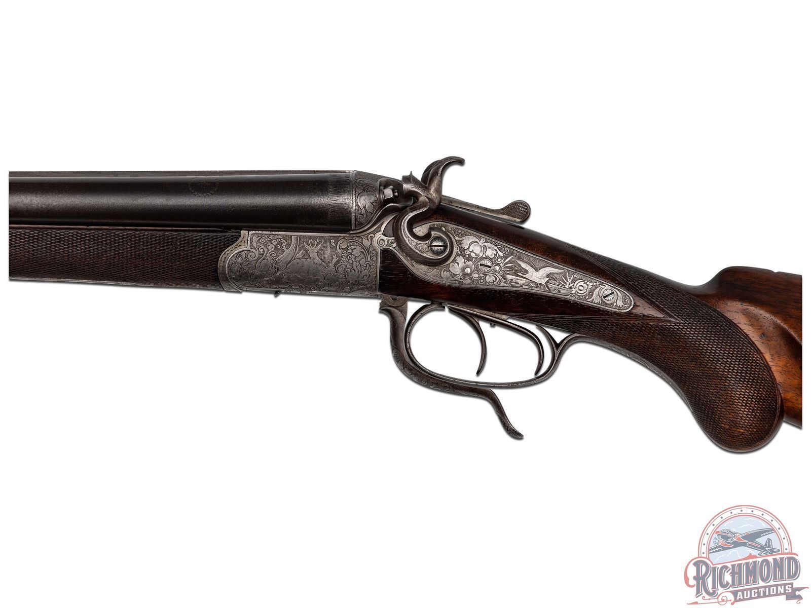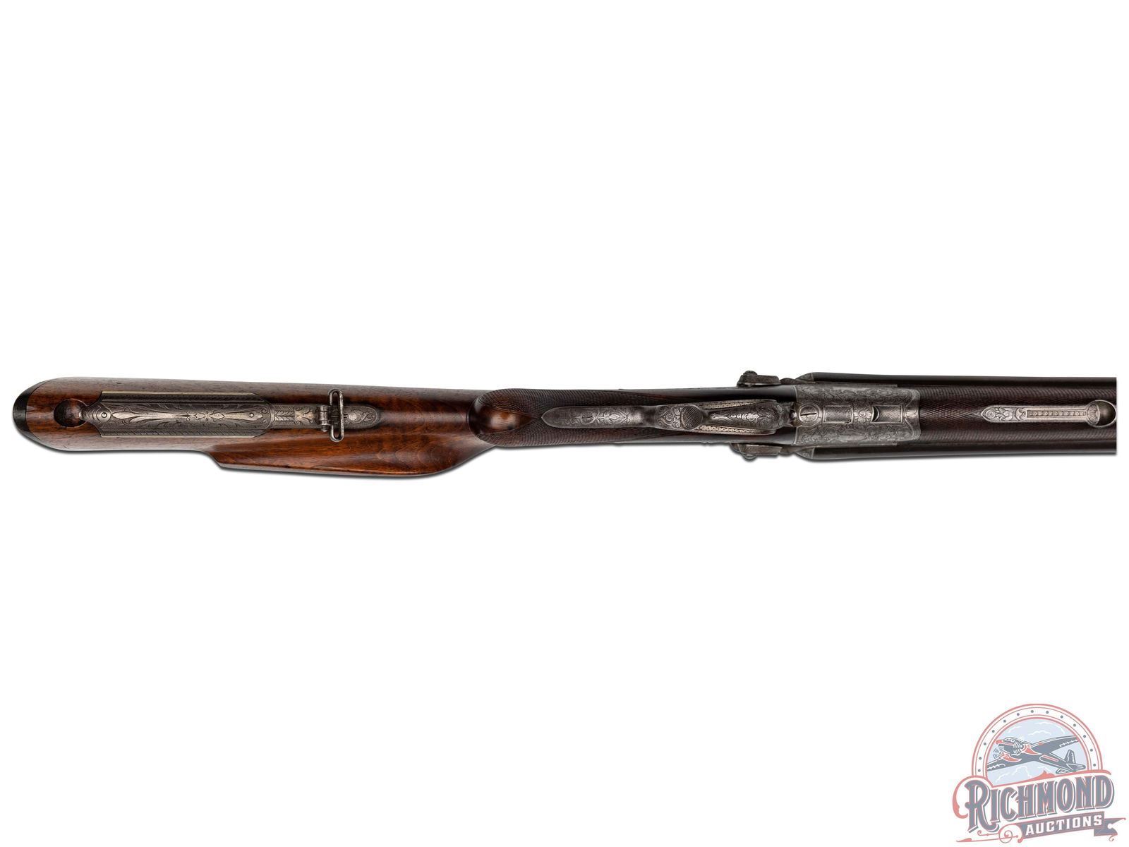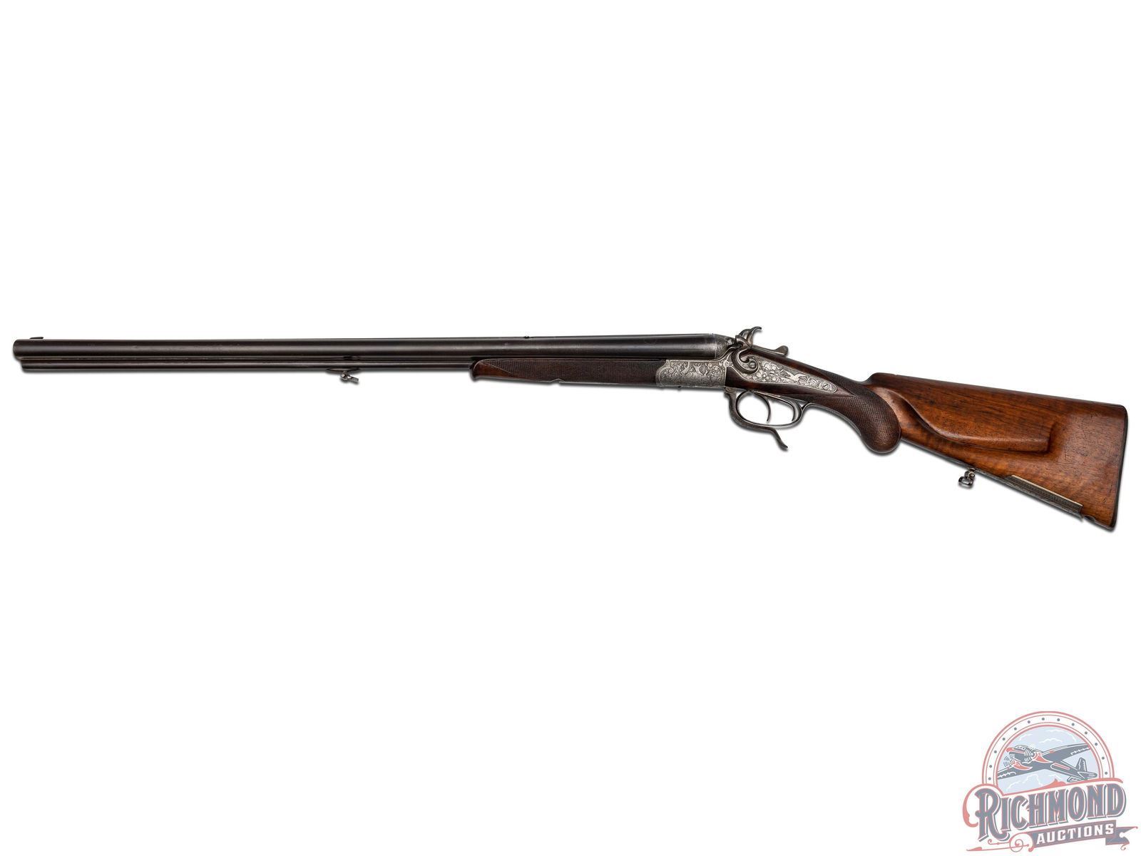 Manufactured circa 1920's in Germany. Barrel rib is marked "G.WAHRENBERG BRADENBURG". No visible import marks. Matching serials on the barrel and frame. Forearm is not numbered. Bottom left of the barrel is marked "KRUPP". Standard commercial proofs on the bottom of both the barrel and action. Barrels are 26-3/4". Rifle appears 9 x 72 R caliber (should be chamber cast to verify). Solid rib with blade front sight and flip up rear sight, activated by the lever on the frame. underlever, back action, exposed hammer design with a rounded bottom receiver. Case colored frame has fine game scene engraving with a punch dot background. Left side shows a deer with an elk on the right. Both sideplates are engraved with a hare on the right and a duck on the left. Double set triggers. Oiled wood stock and forearm with fine cut checkering on the wrist and forearm. Round knob pistol grip. Small metal sling swivels with a European style small cheekpiece on the right side. Metal bullet trapdoor in the butt. Checkered horn butt plate. Bores look to be choked at full and improved modified. LOP: 13-3/4". CALIBER: 16 Gauge & 9x72. S/N: 10203. FFL STATUS: Curio & Relic.