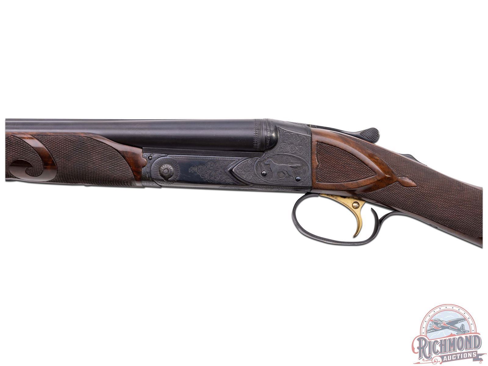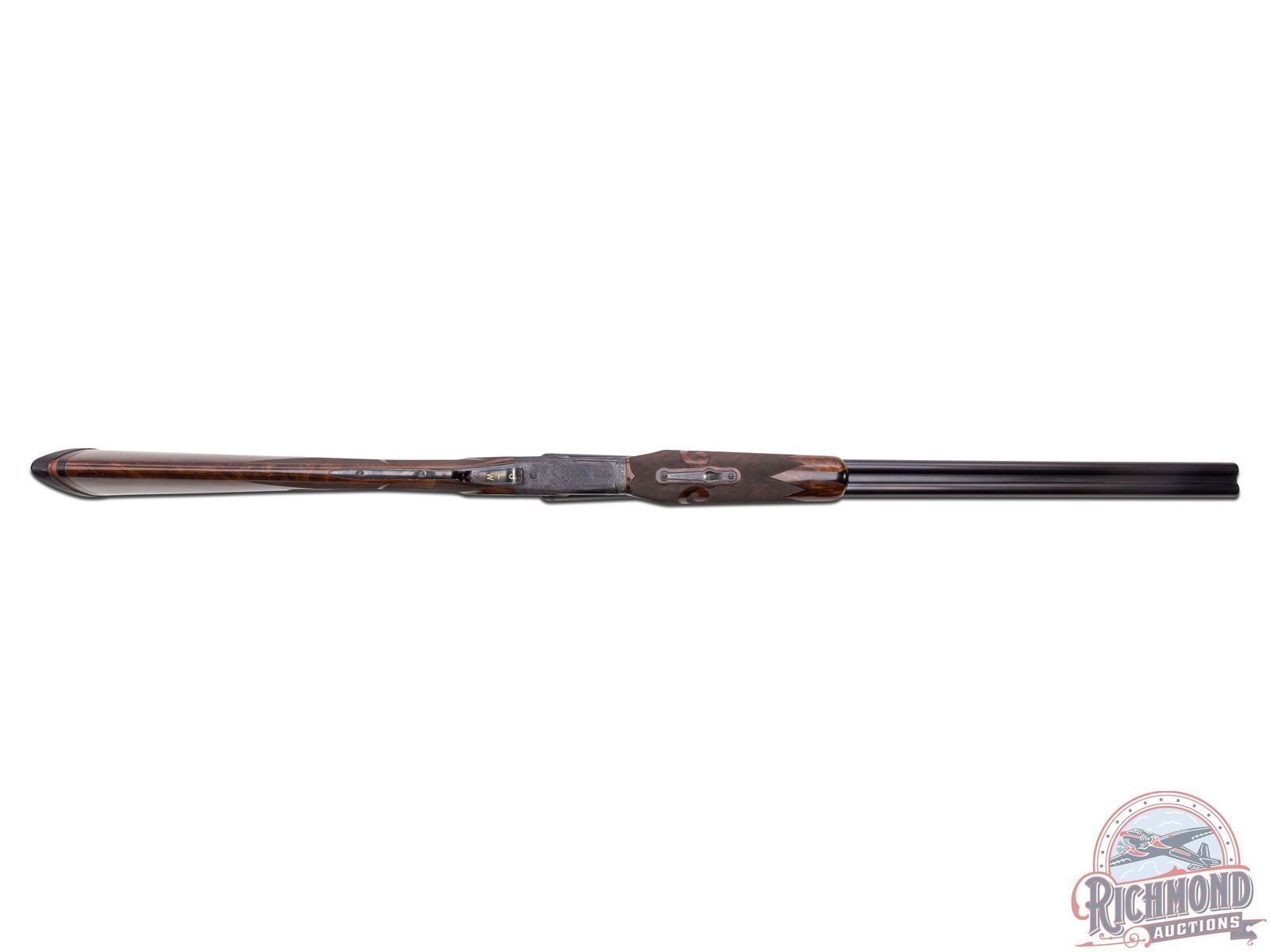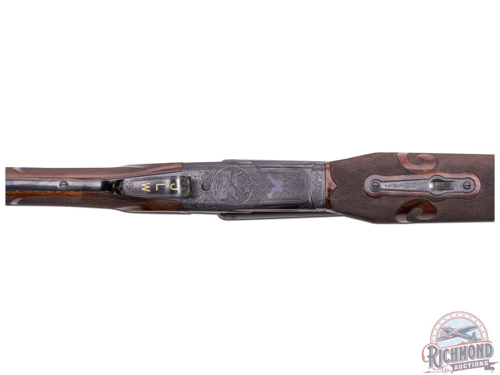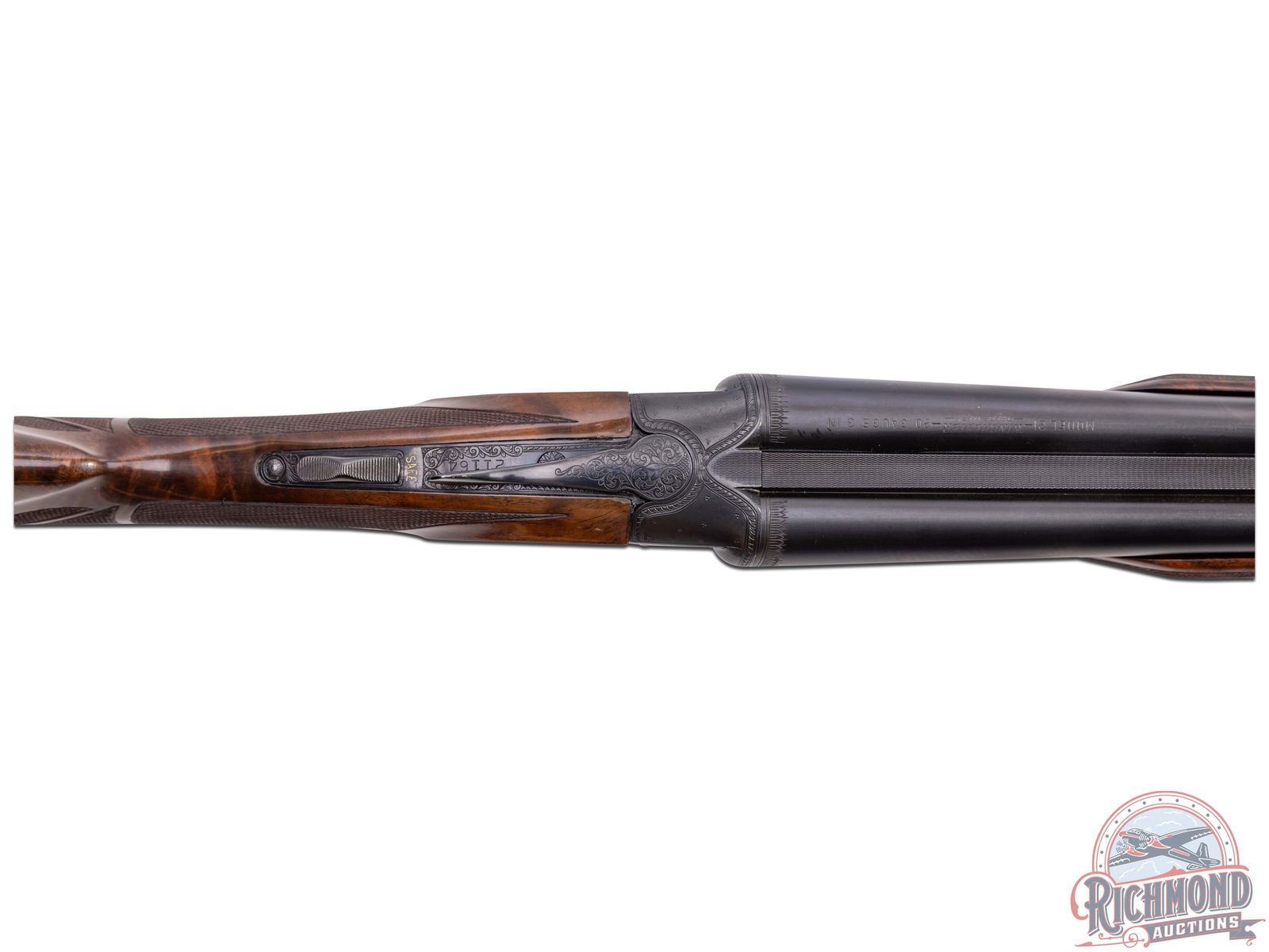Manufactured by Winchester custom shop in 1948 and includes Cody Museum research. Features rare 30" blued finish 20 gauge special order barrels. Lyman red Hi-Viz front sight. Chambered for 3" shells with ejectors and choked Full and Improved Cylinder. Barrel flats and bores are engine turned with border engraving around outside and left barrel tops. Marked "Model 21 / Winchester / Trademark - 20 Gauge 3 IN". Blued side panel frame with engine turned water table, gold washed single selective trigger with automatic safety. Action has nearly full engraved coverage vignette and dog scene in the 21-6 pattern done by George Ulrich, Master Engraver for Winchester between 1933-1949. Left panel is engraved with a setter scene and the right engraved with pointer in a banner. Trigger guard marked "Engr. by George Ulrich". Blued English grip trigger guard with "JLW" in gold. Dark select walnut English grip stock with 22 LPI checkering and 21-A carving. Fitted with Winchester leather faced recoil pad. Matching 21-A carved and checkered Skeet style beavertail forearm with ebony inlay and blued floral engraved roller latch. Research letter states all options, repairs, and returns done for the original owner, Joseph L. Werner. A fine Model 21! LOP: 14-1/2". DAC: 1-1/8". DAH: 3-1/8". CALIBER: 20 GA. S/N: 21164. FFL STATUS: Curio & Relic.
