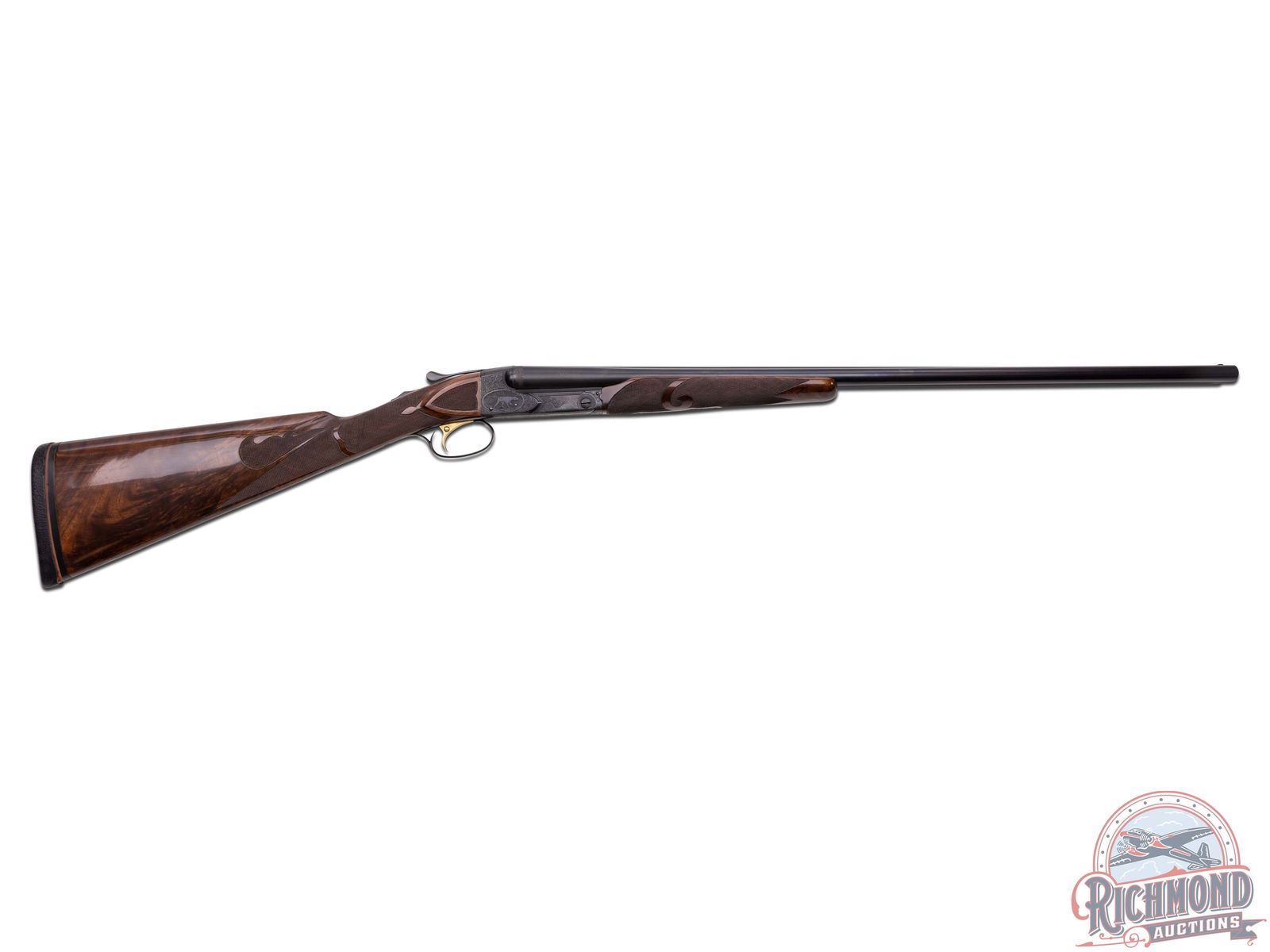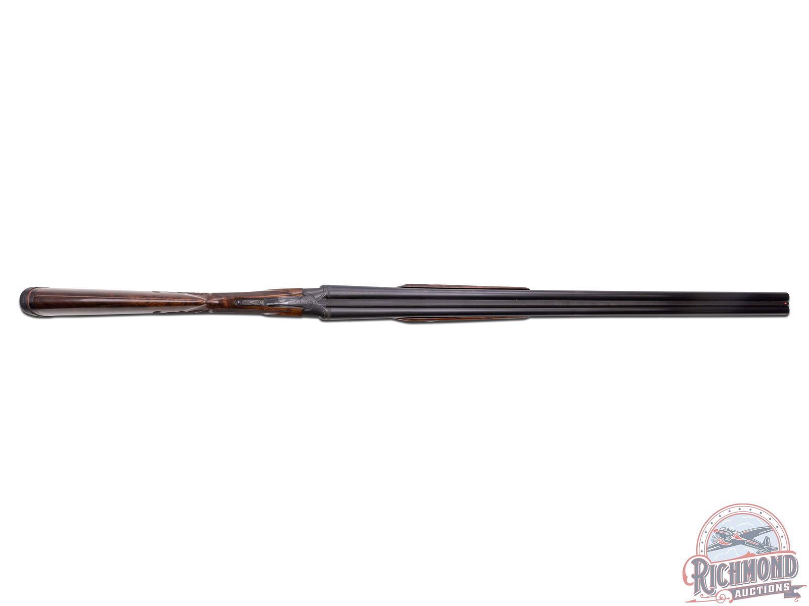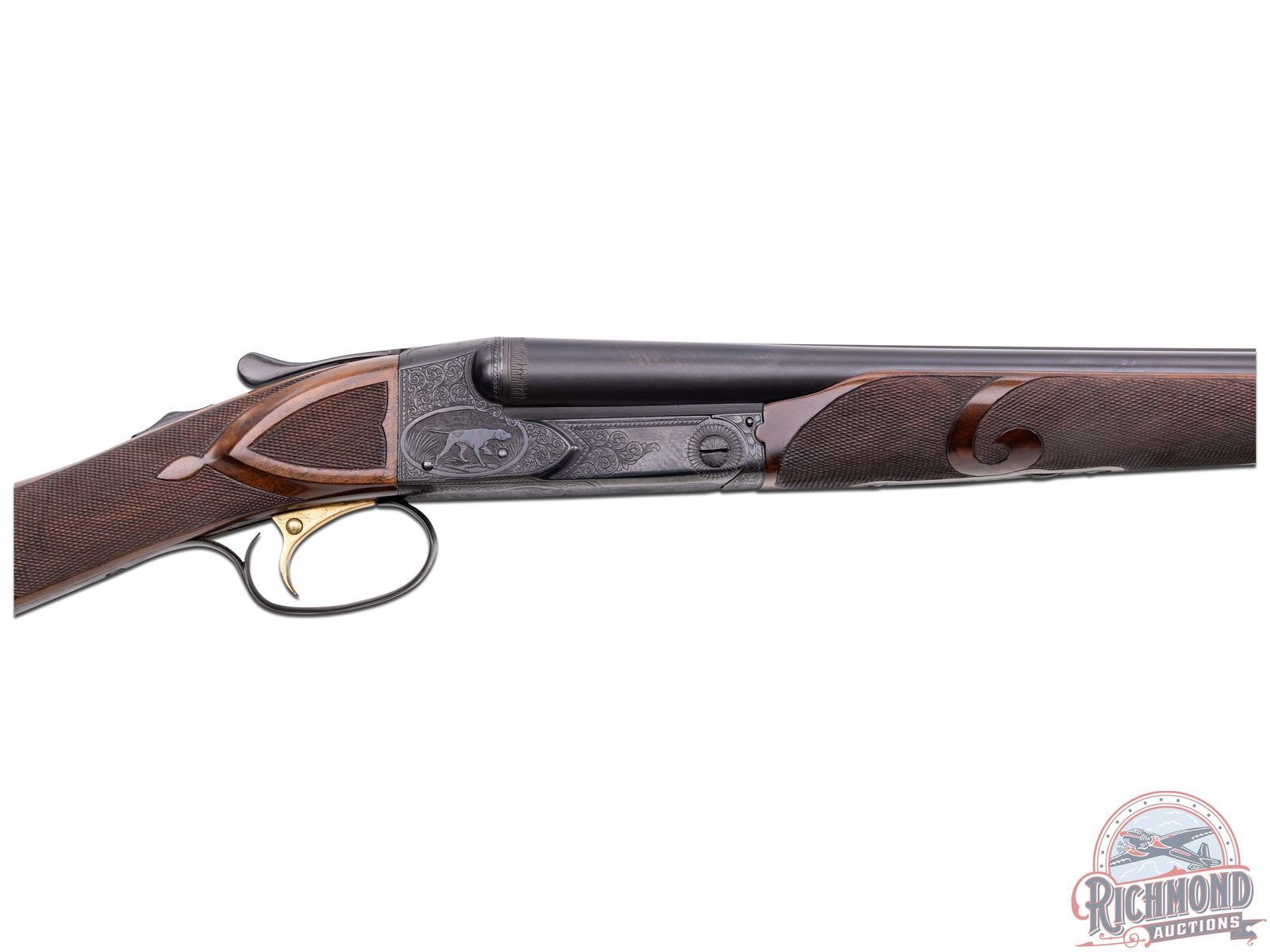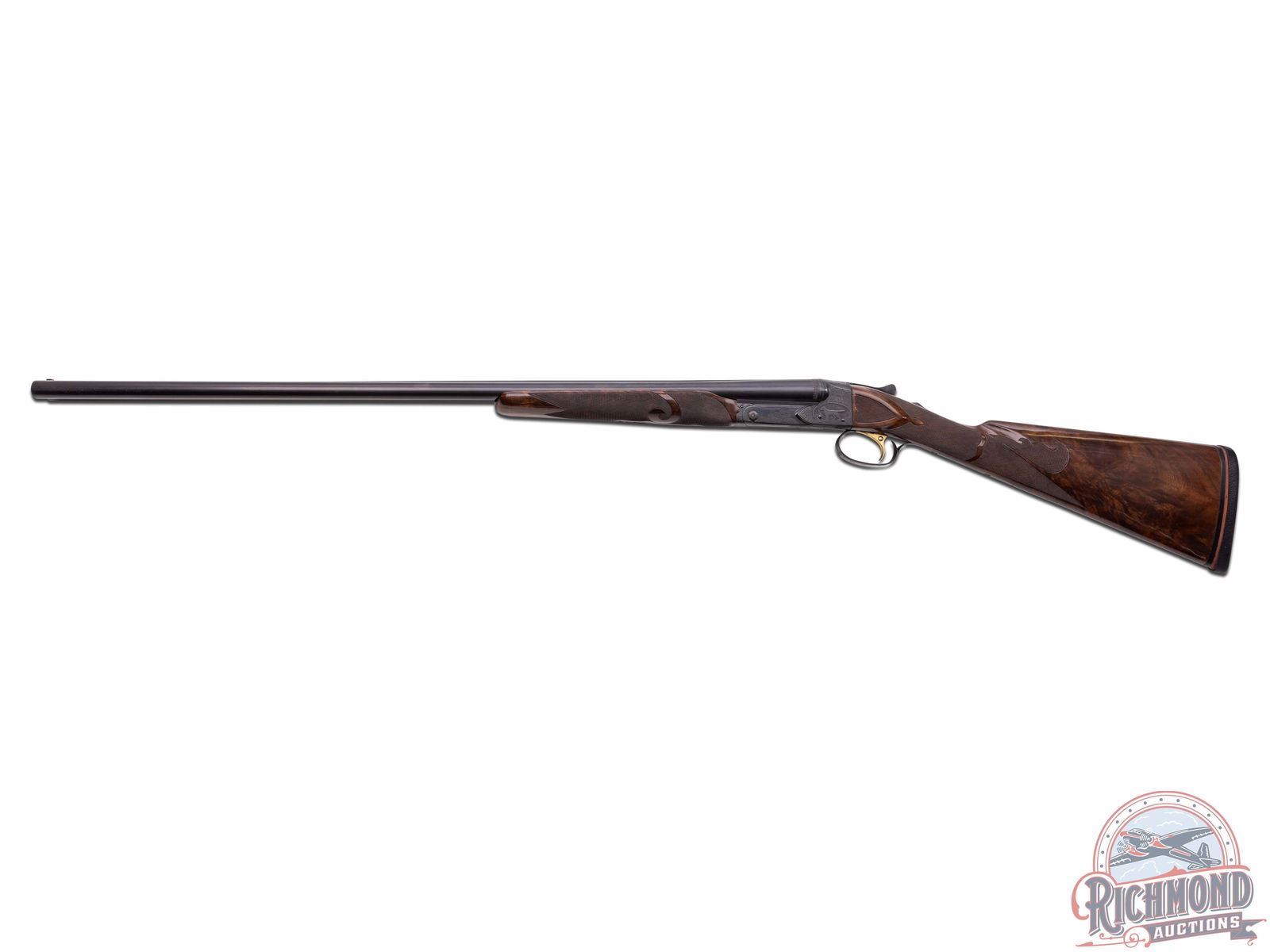 Manufactured by Winchester custom shop in 1948 and includes Cody Museum research. Features rare 30" blued finish 20 gauge special order barrels. Lyman red Hi-Viz front sight. Chambered for 3" shells with ejectors and choked Full and Improved Cylinder. Barrel flats and bores are engine turned with border engraving around outside and left barrel tops. Marked "Model 21 / Winchester / Trademark - 20 Gauge 3 IN". Blued side panel frame with engine turned water table, gold washed single selective trigger with automatic safety. Action has nearly full engraved coverage vignette and dog scene in the 21-6 pattern done by George Ulrich, Master Engraver for Winchester between 1933-1949. Left panel is engraved with a setter scene and the right engraved with pointer in a banner. Trigger guard marked "Engr. by George Ulrich". Blued English grip trigger guard with "JLW" in gold. Dark select walnut English grip stock with 22 LPI checkering and 21-A carving. Fitted with Winchester leather faced recoil pad. Matching 21-A carved and checkered Skeet style beavertail forearm with ebony inlay and blued floral engraved roller latch. Research letter states all options, repairs, and returns done for the original owner, Joseph L. Werner. A fine Model 21! LOP: 14-1/2". DAC: 1-1/8". DAH: 3-1/8". CALIBER: 20 GA. S/N: 21164. FFL STATUS: Curio & Relic.