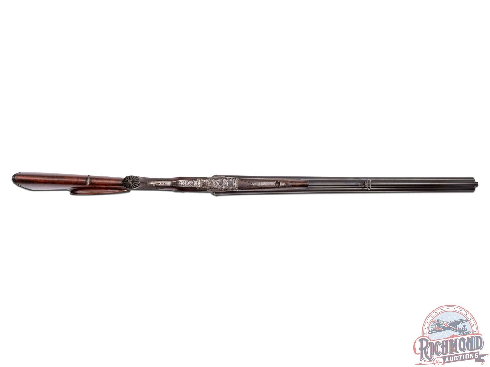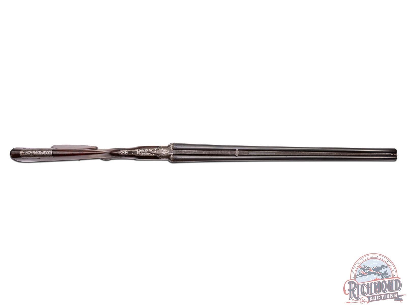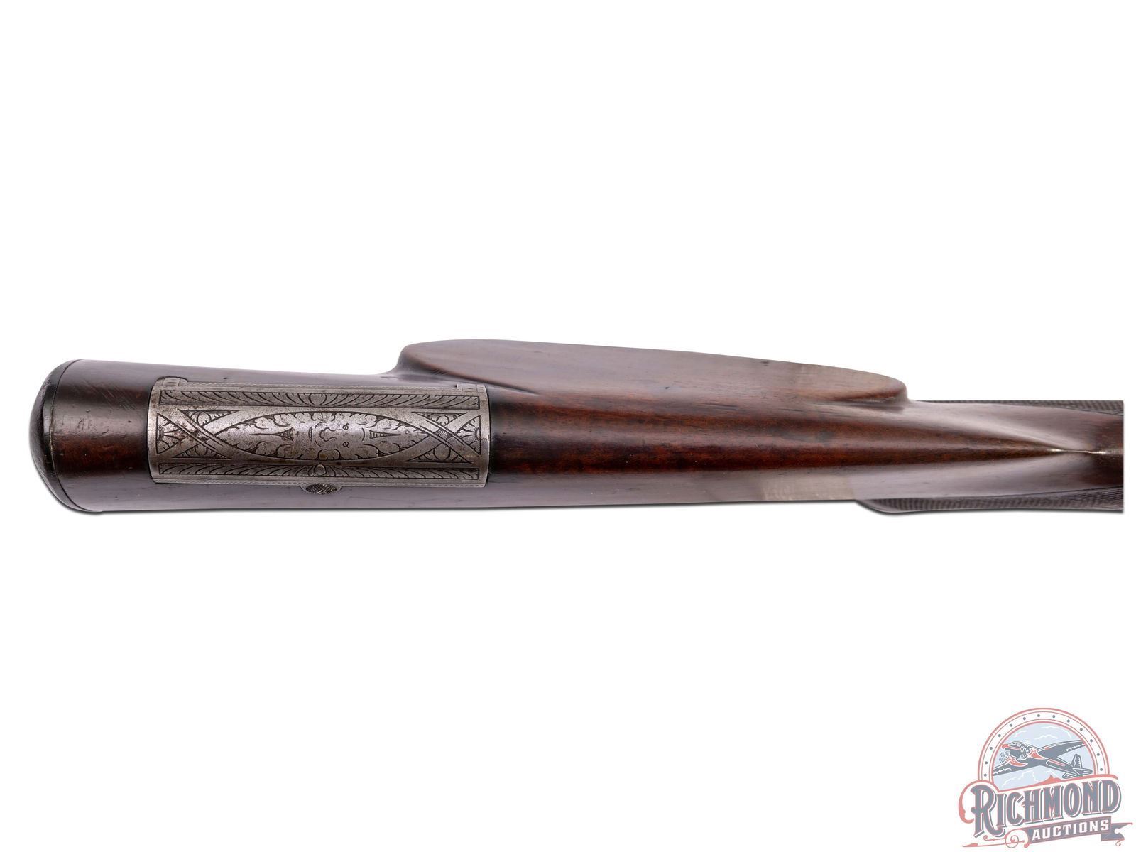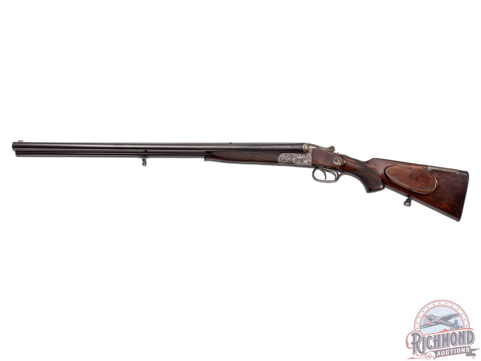 Made in Germany, prior to World War II, circa 1920, by an unknown gunsmith. 26-7/8" blued "Erhhardt Lauf" steel barrels with matted rib, rifle sights, extractors, and sling swivels in 16 gauge SxS shotgun over 9.3x72R caliber rifle barrel. Game scene engraved Blitz action with bird, rabbit, and floral designs with double triggers (front being a set), sideclips, Greener crossbolt and side safety, cocking indicators, and top tang barrel selector. Walnut checkered pistol grip stock with right hand cheekpiece, engraved bullet trap, and horn butt plate and grip cap. Matching walnut checkered splinter forearm with latch release. LOP: 14". DAC: 1-1/2". DAH: 2". CALIBER: 16x16/9.3x72R. S/N: 46360. FFL STATUS: Curio & Relic.